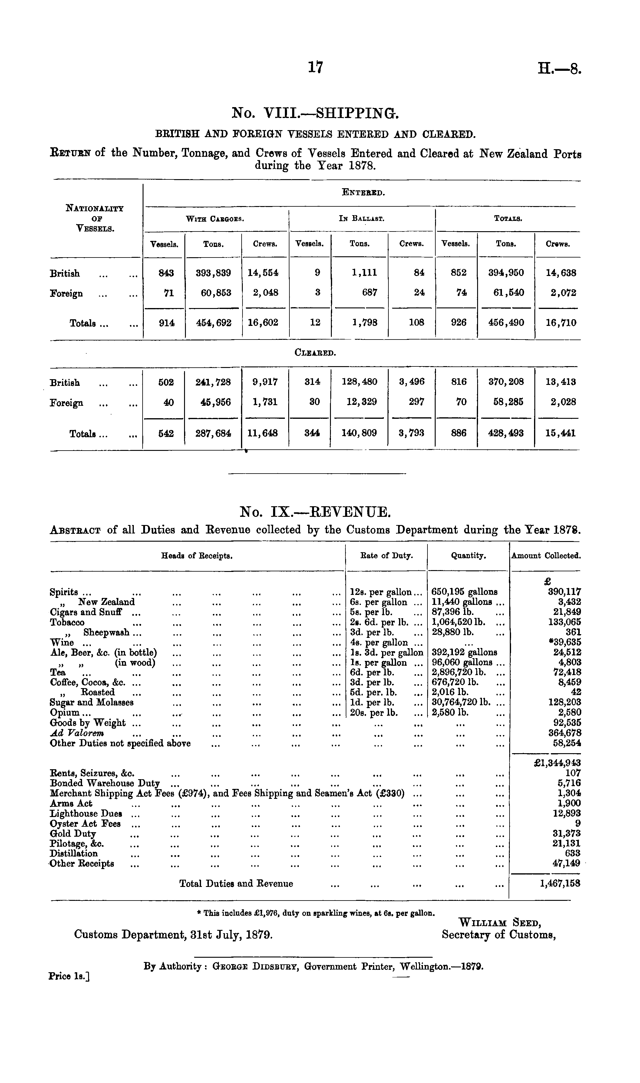 Heads of Beceipts. Rate of Duty. Quantity. Amount Collected. Spirits... ... ... ... ... ... ... 12s. per gallon... „ New Zealand ... ... ... ... ... | 6s. per gallon ... Cigars and Snuff ... ... ... ... ... ... i 5s. per lb. Tobacco ... ... ... ... ... ... 2s. 6d. per lb. ... „ Sheepwash ... ... ... ... ... ... 3d. per lb. Wine ... ... ... ... ... ... ... 4s. per gallon ... Ale, Beer, &c. (in bottle) ... ... ... ... ... Is. 3d. per gallon „ „ (in wood) ... ... ... ... ... Is. per gallon ... Tea ... ... ... ... ... ... ... 6d. per lb. Coffee, Cocoa, &c. ... ... ... ... ... ... 3d. per lb. „ Roasted ... ... ... ... ... ... 5d. per. lb. Sugar and Molasses ... ... ... ... ... Id. per lb. Opium... ... ... ... ... ... ... 20s. per lb. Goods by Weight ... Ad Valorem Other Duties not specified above | 650,195 gallons 11,440 gallons ... 87,3961b. 1,064,5201b. ... 28,880 lb. 392,192 gallons 96,060 gallons ... 2,896,720 1b. ... 676,720 lb. 2,0161b. 30,764,7201b. ... 2,5801b. £ 390,117 3,432 21,849 133,065 361 *39,635 24,512 4,803 72,418 8,459 42 128,203 2,580 92,535 364,678 58,254 Rents, Seizures, &c. Bonded Warehouse Duty ... Merchant Shipping Act Fees (£974), and Fees Shipping and Seamen's Act (£330) ... Arms Act lighthouse Dues ... Oyster Act Fees Gold Duty Pilotage, &c. Distillation Other Receipts £1,344,943 107 5,716 1,304 1,900 12,893 9 31,373 21,131 633 47,149 Total Duties and Revenue 1,467,158 * This includes £1,976, duty on sparkling wines, at Gs. per gallon. Customs Department, 31st July, 1879. William Seed, Secretary of Customs, By Authority : Geoege Didsbukt, Government Printer, Wellington.—1879. 'rice Is.