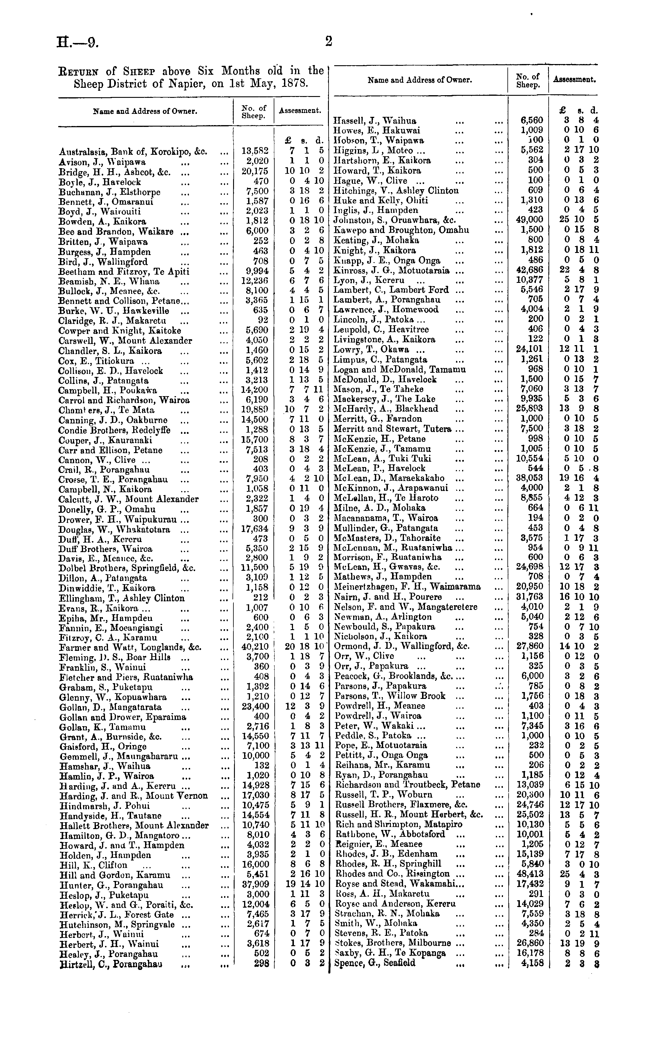 Name and Address of Owner. g,0- of Assessment, Sheep. Australasia, Bank of, Korokipo, &c. Avison, J., Waipawa Bridge, II. H., Asbcot, &c. Bo.Ue, J., Earelock Buchnnan, J., Elsthorpe Bennett, J., Omaranui Boyd, J., Wairouiti Bowden, A., K: ilu.ru Bee and Brandon, Waikare ... Britten, J, Waipawa Burgess, J., Hampden Bird, J., Wnllingt'ord Beetham and Fitzroy, Te Apiti Beamish, N. E., Whana Bullock, J., 31 ranee, &c. Bennett and Collison, Petano... Burke, W. U., Hawkeville ... Claridge, R. J., Makaretu Cowjmff and Knight, Kaitoke Oarewi U, \V'., Mount Alexander Chandler, S. L., Kaikora Cox, E., Titiokura ... Collisou, E. D., Havelock Collins, J., Patangata Campbell, II., Poiikawa Carrol and Richardson, Wairoa Chaml ers, J., Te Mata Canning, J. D., Oakburno Condie Brothers, Redclyfl'e ... Couper, J., ICauranaki Carr and Ellison, Petane Cannon, "W., Clive ... Crai), R., Porangahau Cro?se, T. E., Pnrnngahau Campbell, X., Kaikora Calcutt, J. W., Mount Alexander Donelly, G. P., Omahu Drower, P. II., Waipukurau ... Douglas, W., Whakatotara ... Duff, H. A., Kereru Dun" Brothers, Wuiroa Davis, B., Bfeanee, &c. Dolbel Brothers, .Springfield, &c. Dillon, A., Patangata Dinwiddie, T., Kaikora Ellingliain, T., Ashley Clinton Evans, B., Kaikora ... Epilia, Mr., llampdeu Fannin, E., Moeangiangi Fitzroy, C. A., Karamu Fanner and Watt, Longlands, &c. Fleming, J). 8., Boar Hills ... Franklin, IS., Waisoi Fletcher and Piers, Ruataniwha Graham, S., Puketapn Glenn}-, W., Kopuawhara Gollan, D., Mangatarata Gollan and Drower, Eparainia Gollan, K., Tam:unu Grant, A., Burnside, &c. Gaisford, II., Oringe Gemmell, J., Maungahararu ... Hamshar, J.. Wailiua Hamlin, J. P., Wairoa Harding, J. and A., Kereru ... Harding, J. and R., Mount Vernon Hindmaroh, .T. Pohui Handvside, II., Tautane HalU-ft Brothers, Mount Alexander Hamilton, G. D., Mangatoro ... Howard, J. ana T., Hampden Holden, J., Hampden Hill, K., Clifton Hill and Gordon, Karamu Hunter, G., Porangahau Heslop, J., Puketapa Eevlop, W. and G., Poraiti, cic. Herrick'J. L., Forest Gate ... Hutchinton, If., Springvalo ... Herbert, .1., Waiinii Herbert, J. II., Wainui Healey, J., Porangahau Hirtzt'll, C, Poiangahau 13.5S2 2^020 20,175 470 7,500 1,587 2,023 ],812 6,000 252 4(>3 708 9,994 I2,23fi 8,100 3.3 05 635 92 5,690 ■1,1 CO 1.4 GO 5,602 1,412 3,213 14,200 6,190 19,889 14,500 1,288 15,700 7,513 208 403 7,950 1,058 2 322 1^857 300 17,634 473 5,350 2,800 11,500 3,109 1,158 212 1,007 600 2,400 2,100 40,210 3,700 360 408 1,392 ],210 23,400 400 2,716 14,550 7,100 10,000 132 1,020 14,928 17,030 10,475 14,554 10,740 8,010 4,032 3,935 10,000 5,451 37,909 3,000 12,004 7,465 2,617 674 3,618 502 293 £ s. d. 7 15 110 10 10 2 0 4 10 3 18 2 0 16 6 110 0 18 10 3 2 6 0 2 8 0 4 10 0 7 5 5 4 2 6 7 0 4 4 5 1 15 1 0 6 7 0 10 2 19 4 2 2 2 0 15 2 2 18 5 0 14 9 1 13 5 7 7 11 3 4 6 10 7 2 7 11 0 0 13 5 8 3 7 3 18 4 0 2 2 0 4 3 4 2 10 0 11 0 14 0 0 19 4 0 3 2 9 3 9 0 5 0 2 15 9 19 2 5 19 9 1 12 5 0 12 0 0 2 3 o io f; 0 6 3 15 0 1 1 10 20 18 10 1 18 7 0 3 9 0 4 3 0 14 0 0 12 7 12 3 9 0 4 2 18 3 7 11 7 3 13 11 5 4 2 0 14 0 10 8 7 15 6 8 17 5 5 9 1 7 11 8 5 11 10 4 3 6 2 2 0 2 10 8 6 8 2 16 10 19 14 10 1 11 3 6 5 0 3 17 9 17 5 0 7 0 1 17 9 0 5 2 0 3 2