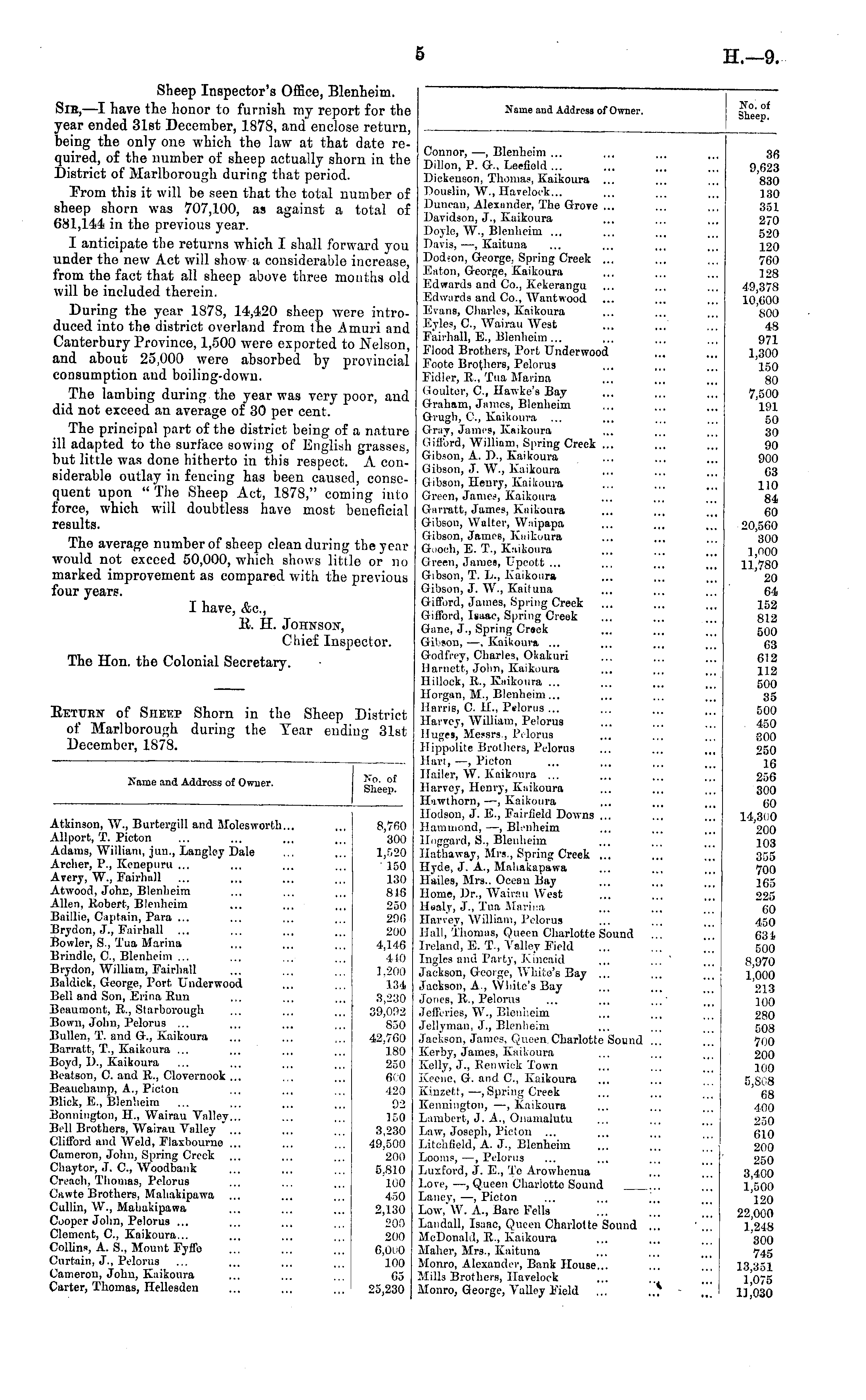 Sheep Inspector's Office, Blenheim. Sir, —I have the honor to furnish my report for the year ended 31st December, 1878, and enclose return, being the only one which the law at that date required, of the number of sheep actually shorn in the District of Marlborough during that period. From this it will be seen that the total number of sheep shorn was 707,100, as against a total of 681,144 in the previous year. I anticipate the returns which I shall forward you under the new Act will show a considerable increase, from the fact that all sheep above three mouths old will be included therein. During the year 187S, 14,420 sheep were introduced into the district overland from the Amuri and Canterbury Province, 1,500 were exported to Nelson, and about 25,000 were absorbed by provincial consumption and boiling-down. The lambing during the year was very poor, and did not exceed an average of 30 per cent. The principal part of the district being of a nature ill adapted to the surface sowing of English grasses, but little was done hitherto in this respect. A considerable outlay in fencing has been caused, consequent upon " The Sheep Act, 1878," coming into force, which will doubtless have most beneficial results. The average number of sheep clean during the year would not exceed 50,000, which shows little or no marked improvement as compared with the previous four years. I have, <fcc, 11. H. Johjtscw, Chief Inspector. The Hon. the Colonial Secretary.