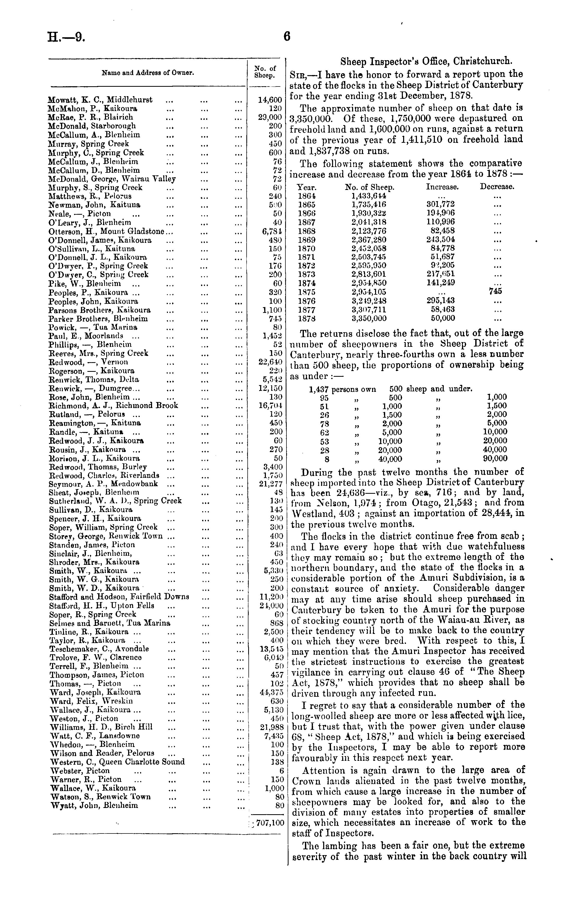 Sheep Inspector's Office, Christchurch. Sin, —I have the honor to forward a report upon the state of the flocks in the Sheep District of Canterbury for the year ending 31st December, 1878. The approximate number of sheep on that date is 3,350,000. Of these, 1,750,000 were depastured on freehold land and 1,000,000 on runs, agaiust a return of the previous year of 1,411,510 on freehold land and 1,837,738 on runs. The following statement shows the comparative increase and decrease from the year 1861 to 1878 : — Year. No. of Sheep. Increase. Decrease. lSfit 1,483,644 18G5 1,735,416 301,772 1800 1,930,32a 191,906 1867 2,011,318 110,996 186S 2,123,770 82,458 1869 2,367,280 2-13,504 1870 2,452,058 84,778 1871 2,503,745 u 1,687 1872 2,505,950 9',205 1873 2,813,601 217,'i51 1874 2,954,850 111,249 is?.". 2,954,106 ... 745 1876 8,249,248 293,143 1877 3,307,711 58,163 1873 3,350,000 50,000 The returns disclose the fact that, out of the large number of sheepowners in the Sheep District of Canterbury, nearly three-fourths own a less number than 500 sheep, the proportions of ownership being as under : — 1,437 persons own 500 sheep and under. 95 „ 500 „ 1,000 51 „ 1,000 „ 1,500 20 „ 1,500 „ 2,000 78 „ 2,000 „ 5,000 62 „ 5,000 „ 10,000 53 „ 10,000 „ 20,000 28 „ 20,000 „ 40,000 8 „ 40,000 „ 90,000 During the past twelve months the number of sheep imported into the Sheep District of Canterbury has been 24,(536 —viz., by sea, 716; and by land, from Nelson, 1,974; from Otago, 21,51-3; and from Westland, 403 ; against an importation of 28,444, in the previous twelve months. The Hocks in the district continues free from scab ; and 1 have every hope that with duo watchfulness they may remain so ; but the extreme length of the northern boundary, and the state of the Hocks in a considerable portion of the Ainuri Subdivision, is a constant source of anxiety. Considerable danger may at any time arise should sheep purchased in Canterbury be taken to the Amuri for the purpose of stocking country north of the Waiau-au River, as their tendency will be to make back to the country on which they were bred. With respect to this, I may mention that the Amuri Inspector has received the strictest instructions to exercise the greatest vigilance in carrying out clause 46 of " The Sheep | Act, 1878," which provides that no sheep shall be driven through any infected run. I regret to say that a considerable number of the long-woolled sheep are more or less affected wyh lice, but I trust that, with the power given under clause 68, " Sheep Act, 1878," and which is being exercised by the Inspectors, I may be able to report more favourably in this respect next year. Attention is again drawn to the largo area of Crown lands alienated in the past twelve months, from which cause a large increase in the number of sliccpowners may be looked for, and also to the division of many estates into properties of smaller size, which necessitates an increase of work to the staff of Inspectors. The lambing has been a fair one, but the extreme severity of the past winter in the back country will