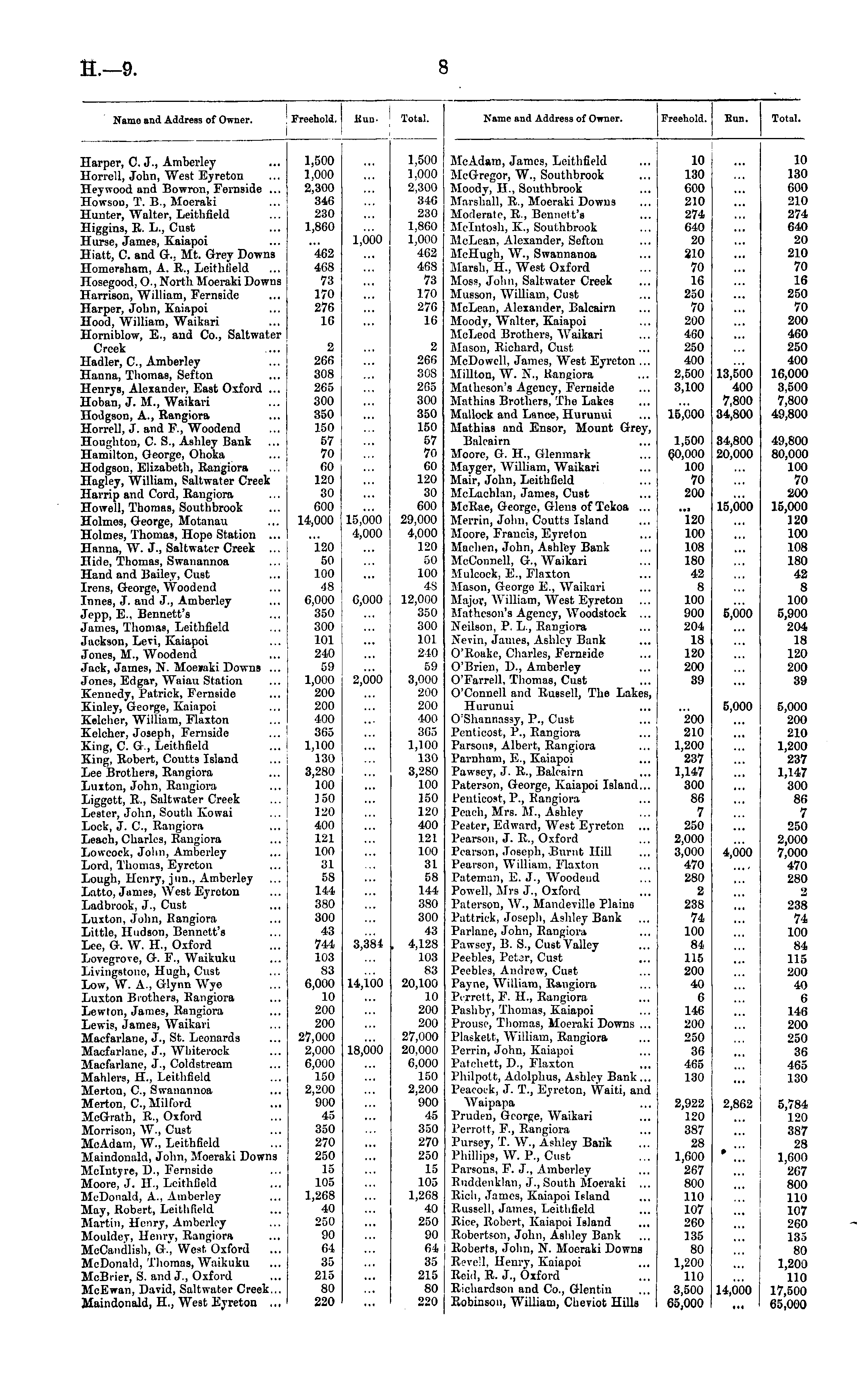 Name and Address of Owner. Freehold. Kun. Total. Kame and Address of Owner. j Freehold. Kun. Total. Iarper, C. J., Amberley lorrell, John, West Eyreton Teywood and Bowron, Fernside ... Jowsou, T. B., Moeraki lunter, Walter, Leithfield -Iiggins, R. L., Cust lurse, Janies, Kaiapoi liatt, C. and Gr. ; Mt. Grey Downs lomersham, A. R., Leithfield Tosegood, O., North Moeraki Downs larrison, William, Fernside Iarper, John, Kaiapoi lood, William, Wiiikari lorniblow, E., and Co., Saltwater Creek ladler, C, Amberley launa, Tliomas, Sefton lenrys, Alexander, East Oxford ... loban, J. If., Waikari Hodgson, A., Rangiora lorrell, J. and F., Woodend Toughton, C. S., Ashley Bank ... .Iamilton, George, Olioka Hodgson. Elizabeth, Raugiora lagley, William, Saltwater Creek rlarrip and Cord, Rangiora rlowell, Thomas, Southbrook iiolmes, George, Motanau lolmes, Thomas, Hope Station ... lanna, W. J., Saltwater Creek ... Hide, Thomas, Swanannoa Hand and Bailey, Cust irons, George, Woodend !nnes, J. and J., Amberley fepp, E., Bennett's fames, Thomas, Leithfield fackson, Levi, Kaiapoi fones, M., Woodend faek, James, N. Moeiaki Downs ... fones, Edgar, Waiau Station Kennedy, Patrick, Fernside Enley, George, Kaiapoi Eelclier, William, Flaxton ieleher, Joseph, Fernside ting, C. G., Leithfield King, Robert, Coutts Island Lee Brothers, Rangiora Luxton, John, Kaugiora Liggett, R., Saltwater Creek Lester, John, South Kowai Lock, J. C, Rangiora Leach, Charles, Rangiora Lov.cock, John, Amberley Lord. Thomas, Eyrcton Lough, Henry, jun., Amberley Latto, James, West Eyreton Ladbrook, J., Cust Luxton, John, Hangiora Little, Hudson, Bennett's Lee, G. W. H., Oxford Loregrove, G. F., Waikuku Livingstone, Hugh, Cust Lou-, W. A., Glynn Wye Luxton Brothers, Kangiora Lewton, James, Rnngiora Lewis, James, Waikari Vlacfarlane, J., St. Leonards tfacfurlane, J., Wliiterock Macfarlane, J., Coldstream Uahlen, H., Leithfield ilerton, C, Swanannoa VIerton, C, Milfurd '.leCirath, R., Oxford Morrison, W., Cust, ttoAdam, W., Leithfield Muindonuld, Jolm, Moeraki Downs Holntjre, D., Fernside vioore, J. II., LcithOeld McDonald, A.. Amberley Way, Robert, Leithfleld Martin, Henry, Amberley ICooldey, Heniy, Rangiora KoOandlisb, G.', West Oxford McDonald, Tliomas, Waikuku McBtier, S. and J., Oxford MeEwan, David, Saltwater Creek... Uaindonald, H., West Eyreton. ... 1,500 1,000 2,300 346 230 1,860 462 468 73 170 276 16 2 266 308 265 300 350 150 57 70 60 120 30 600 14,000 120 50 100 • !'-: 6,000 350 300 101 240 59 1,000 200 200 400 365 1,100 130 3,280 100 J50 120 400 121 100 31 58 144 380 300 43 744 103 83 6,000 10 200 200 27,000 2,000 6,000 150 2,200 900 45 350 270 250 15 105 1,268 40 250 90 64 35 215 80 220 1,000 15,000 4,000 0,000 2,000 1,500 1,000 2,300 346 230 1.860 1,000 462 468 73 170 276 16 2 266 308 265 300 350 150 57 70 60 120 30 600 29,000 4,000 120 50 100 4S 12,000 350 300 101 240 59 3,000 200 200 400 365 1,100 130 3,280 100 150 120 400 121 100 31 58 144 380 300 43 4.128 103 83 20,100 10 200 200 27,000 20.000 6,000 150 2,200 900 45 350 270 250 15 105 1,268 40 250 90 64 35 215 80 220 MeAdam, James, Leithfield McGregor, W., Southbrook Moody, H., Southbrook Marshall, R., Moeraki Downs Moderate, R., Bennett's Melntoih, K., Southbrook McLean, Alexander, Sefton McHugh, \V., Swannanoa Marsh, H., West Oxford Moss, John, Saltwater Creek Musson, William. Cnst McLean, Alexander, Balcairn Moody, Walter, Kaiapoi McLeod Brothers, Waikari Mason, Richard, Cust McDowell, James, West Eyreton ... Millton, W. K., Rangiora Hatheson's Agency, Fernside Ifatibiaa Brothers, The Lakes Mallock and Lnnce, Hurunni Mathias and Ensor, Mount Grey, Baloairn Moore, G. II., Glenmark Mayger, AVilliam, Waikari Mair, John, LeithCeld McLachLm, James, Cust McRae, George, Glens of Tckoa ... Merrin, John, Coutts Island Moore, Francis, Eyreton Maehen, John, Ashley Bank McConnell, G., Waikari Mulcock, E., Flaxton Mason, George E., Waikari Major,, AVilliam, West Eyreton Matheson's Agency, Woodstock ... Neilson, P. L., Rangiora Hevin, James, Ashley Bank O'Roake, Charles, Femeide O'Brien, D., Amberley O'Farrell, Tliomas, Cust O'Connell and Russell, The Lakes, Hurunui O'Slmnnassy, P., Cust Penticost, P., Rangiora Parsons, Albert, Rangiora Paruhain, E., Kaiapoi Pawsey, J. R., Baloairn Paterson, George, Kaiapoi Island... Penticost, P., Rangiora Peaob, Mrs. if., Ashley Peater, Edward, West Eyreton Pearson, J. R., Oxford Pearson, Joseph, Burnt Hill Pearson, William, Flaxton Patem&n, E. J., Woodeud Powell, Mrs J., Oxford Patenon, W., Mandeville Plnino Pattriek, Josepli, Ashley Bank Farlane, John, Rangiora Pawsey, B. S., Cnst Valley Peebles, Peter, Cust Peebles, Andrew, Cust Payne, William, Rangiora IVrrott, F. H., Rangiora Pashby, Thomas, Kaiapoi Prouse, Thomas, iloeraki Downs ... Plaskelt, William, Rangiora Perrin, John, Kaiapoi Patchett, D., Flaxton Philpot t, Adolphus, Ashley Bank ... Peacock, J. T., Eyrcton, Waiti, and Wai papa Pruden, George, Waikari Perrott, P., Raiigiora Pursey, T. W., Ashley Bank Phillips, W. P., Cust Parsons, F. J., Amberley RnddenMa.n, J., South Moeraki ... Rich, James, Kaiapoi Island Russell, James, Leithfield Rice, Robert, Kaiapoi Island Robertson, John, Ashley Bank Roberts, Jolm, N. Moeraki Downs Reve'l, Henry, Kaiapoi Reid, R. J., Oxford Richardson and Co., Glentin Robinson, William, Cheviot Hills 10 130 600 210 274 C40 20 210 70 16 250 70 200 460 250 400 2,500 3,100 15,000 1,500 60,000 100 70 200 120 100 108 180 42 8 100 900 204 18 120 200 39 200 210 1,200 237 1,147 300 86 7 250 2,000 3,000 470 280 2 238 74 100 8* 115 200 40 6 146 200 250 36 465 130 13,500 400 7,800 34,800 34,800 20,000 15,000 5,000 5,000 10 130 600 210 274 640 20 210 70 16 250 70 200 460 250 400 16,000 3,500 7,800 49.800 40,800 80,000 100 70 200 15,000 120 100 108 180 42 8 100 5,900 204 18 120 200 39 5,000 200 210 1,200 237 1,147 300 86 7 250 2,000 7,000 470 280 2 238 74 100 84 115 200 ■10 6 146 200 250 36 465 130 4,000 3,384 14,100 18,000 2,922 120 387 28 1,000 267 800 110 107 260 135 80 1