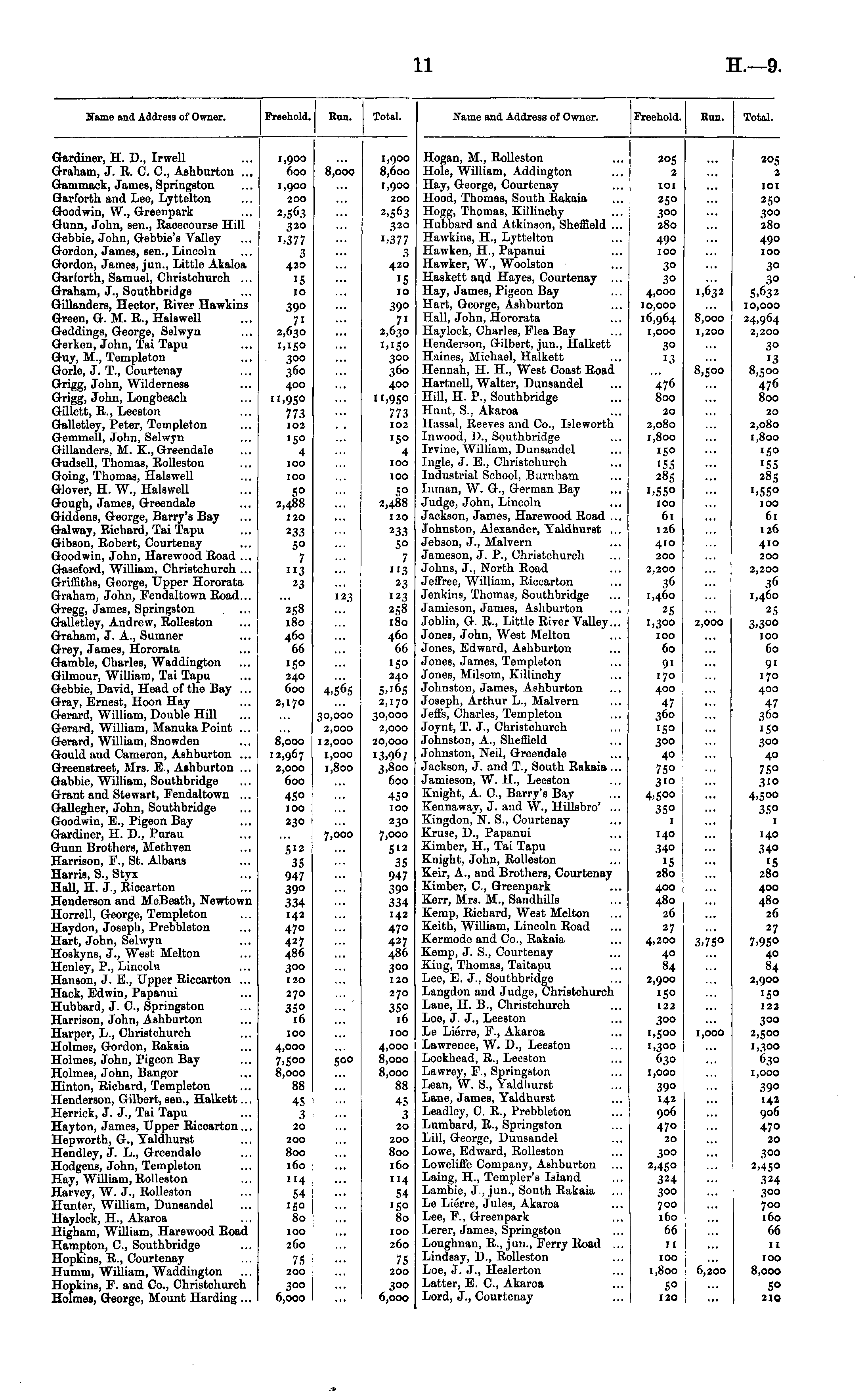 JJame and Address of Owner. Freehold. Eun. Total. Name and Address of Owner. Freehold. Run. Total. Gardiner, H. D., Irwell rraham, J. R. C. C, Ashburton ... tammack, James, Springston rarforth and Lee, Lyttelton Goodwin, W., Greenpark J-unn, John, sen., Racecourse Hill rebbie, John, Gebbie's Valley rordon, James, sen., Lincoln l-ordon, James, jun., Little Akaloa tarlorth, Samuel, Christchureh ... rraham, J., Southbridge rillanders, Hector, River Hawkins rreen, G. M. R., HalsweU l-eddings, George, Selwyn rerken, John, Tai Tapu (■uy, M., Templeton rorle, J. T., Courtenay rriffg, John, Wilderness rrigg, John, Longbeach tillett, R., Leeston ralletley, Peter, Templeton remniell, John, Selwyn rillanders, M. K., Greendale rudsell, Thomas, Rolleston roing, Thomas, Ilalswell Hover, H. W., HalsweU l-ough, James, Greendale Kddens, George, Barry's Bay ralway, Richard, Tai Tapu Kbson, Robert, Courtenay rood win, John, Harewood Road ... raseford, William, Christchureh ... rrifilths, George, Upper Hororata rraham, John, Fendaltown Road... rregg, James, Springston hilletley, Andrew, Rolleston l-raham, J. A., Sumner hey, James, Hororata ramble, Charles, Waddington Klrnour, William, Tai Tapu rebbie, David, Head of the Bay ... rray, Ernest, Hoon Hay rerard, William, Double Hill rerard, William, Manuka Point ... rerard, William, Snowden rould and Cameron, Ashburton ... rreenstreet, Mrs. E., Aihburton ... rabbie, William, Southbridge rrant and Stewart, Fendaltown ... rallegher, John, Southbridge rood win, E., Pigeon Bay rardincr, H. D., Purau runn Brothers, Methven [arrison, F., St. Albans [arris, S., Styx [all, H. J., Riccarton [enderson and McBeath, Newtown [orrell, George, Templeton [aydon, Joseph, Prebbleton [art, John, Selwyn [oskyns, J., West Melton [enley, P., Lincoln [anson, J. E., Upper Riccarton ... [ack, Edwin, Papanui [ubbard, J. C, Springston [arrison, John, Asliburton [arper, L., Christehurch [olmes, Gordon, Rakaia [olmes, John, Pigeon Bay [olmes, John, Bangor [inton, Richard, Templeton [enderson, Gilbert, sen., Halkett... [errick, J. J., Tai Tapu [ayton, James, Upper Riccarton... lepworth, G., Yaldhurst tendley, J. L., Greendale [odgens, John, Templeton [ay, William, Rolleston [arvey, W. J., Rolleston lunter, William, Dunsandel laylock, II., Akaroa [igham, William, Harewood Road [ampton, C, Southbridge lopkins, R., Courtenay lumm, William, Waddington lopkins, F. and Co., Christchureh [olmes, George, Mount Harding ... 1,900 600 1,900 200 2,563 320 i»377 3 420 15 10 39° 71 2,630 1,15° 300 360 400 ii.95° 773 102 ■5° 4 100 100 5° 2,488 120 233 5° 7 «3 23 258 180 460 66 '5° 240 600 2,170 8,000 12,967 2,000 600 45° 100 230 8,000 123 4,565 30,000 2,000 12,000 1,000 1,800 1,900 8,600 1,900 200 2.563 320 J.377 3 420 '5 10 39° 7i 2,630 1.15° 300 360 400 ",95° 773 102 15° 4 100 100 5° 2,488 120 233 5° 7 "3 23 123 258 180 460 66 ■5° 240 5.'65 2,170 30,000 2,000 20,000 13.96/ 3,800 600 45° 100 230 7,000 5'2 35 947 39° 334 142 47° 427 486 300 120 270 35° 16 Hogan, M., Rolleston Hole, William, Addington Hay, George, Court pnay Hood, Thomas, South Kakaia Hogg, Thomas, Killinchy Hubbard and Atkinson, ShefEeld ... Hawkins, H., Lyttelton Hawken, H., Papanui Hawker, W., Woolston Haskett and Hayes, Courtenay ... Hay, James, Pigeon Bay Hart, George, Ashburton Hall, John, Hororata Haylock, Charles, Flea Bay Henderson, Gilbert, jun., Halkett Haines, Michael, Halkett Hennah, H. H., West Coast Road Hartnell, Walter, Dunsandel Hill, H. P., Southbridge Hunt, S., Akaroa ffnimrtl. Reeves and Co., Isleworth Inwood, D., Southbridge Irvine, William, Dunsandel Ingle, J. E., Christchureh Industrial School, Burnham Inman, W. G., German Bay Judge, John, Lincoln Jackson, James, Harewood Road ... Johnston, Alexander, Yaldhurst ... Jebson, J., Malvern Jameson, J. P., Christchureh Johns, J., North Road Jeffrec, William, Riccarton Jenkins, Thomas, Southbridge Jamieson, James, .-Vshburton Joblin, G. R., Little River Valley... Jones, John, West Melton Jones, Edward, Ashburton Jones, James, Templeton Jones, Milsom, Killinchy Johnston, James, Ashburton Joseph, Arthur L., Malvern Jeffs, Charles, Templeton Joynt, T. J., Christchureh Johnston, A., Sheffield Johnston, Neil, Greendale Jackson, J. and T., South Rakaia ... Jamieson, W. H., Leeston Knight, A. C., Barry's Bay Kennaway, J. and W., Hillsbro' ... Kingdon, N. S., Courtenay Kruse, D., Papanui Kimber, H., Tai Tapu Knight, John, Rolleston Keir, A., and Brothers, Courtenay Kimber, C, Greenpark Kerr, Mrs. M., Sandhills Kemp, Ricliard, West Melton Keith, William, Lincoln Road Kermode and Co., Rakaia Kemp, J. S., Courtenay King, Thomas, Tuitapu Lee, E. J., Southbridgo Langdon and Judge, Christchureh Lane, H. B., Christehurch Loe, J. J., Leeston Le Lierre, F., Akaroa Lawrence, W. D., Leeston Lockhead, R., Leeston Lawrey, F., Springaton Lean, W. S., Yaldhurst Lane, James, Yaldhurst Leadley, C. R., Prebbleton Lumbard, R., Springston Lill, George, Dunsandel Lowe, Edward, Rolleston Lowcliffe Company, Ashburtou Laing, H., Templer's Island Lambie, J., Jan., South Rakaia Le Lierre, Jules, Akaroa Lee, F., Greenpark Lerer, James, Springston Loughnan, R., jun., Ferry Road ... Lindsay, D., Rolleston Loe, J. J., Heslerton Latter, E. C, Akaroa Lord, J., Courtenay 2°S 2 IOI 250 300 '280 49° 100 3° 3° 4,000 10,000 16,964 1,000 3° 13 476 800 20 2,080 1,800 15° 155 285 1.55° 100 61 126 410 200 2.200 36 1,460 25 1,300 100 60 91 170 400 47 360 !5° 300 40 75° 3i° 4,5°° 35° 1 140 34° 15 280 1.632 8,000 1,200 8,500 2,000 205 2 IOI 25O 300 280 49° 100 3° 3° 5,632 10,000 24,964 2,200 3° 13 8,500 476 800 20 2,080 1,800 '5° 155 285 >,55° 100 61 126 410 200 2,200 36 1,460 25 3,3°° 100 60 9' 170 400 47 360 15° 300 40 75° 31° 4,5°° 35° 1 140 34° '5 280 7,000 512 35 947 39° 334 142 47° 427 486 300 120 270 35° 16 400 480 26 27 4,200 40 84 2,900 15° 122 3.75° 400 480 26 27 7,95° 40 84 2,900 '5° 122 300 2,500 1,300 630 1,000 39° 142 906 47° 20 100 4,000 7.5°°