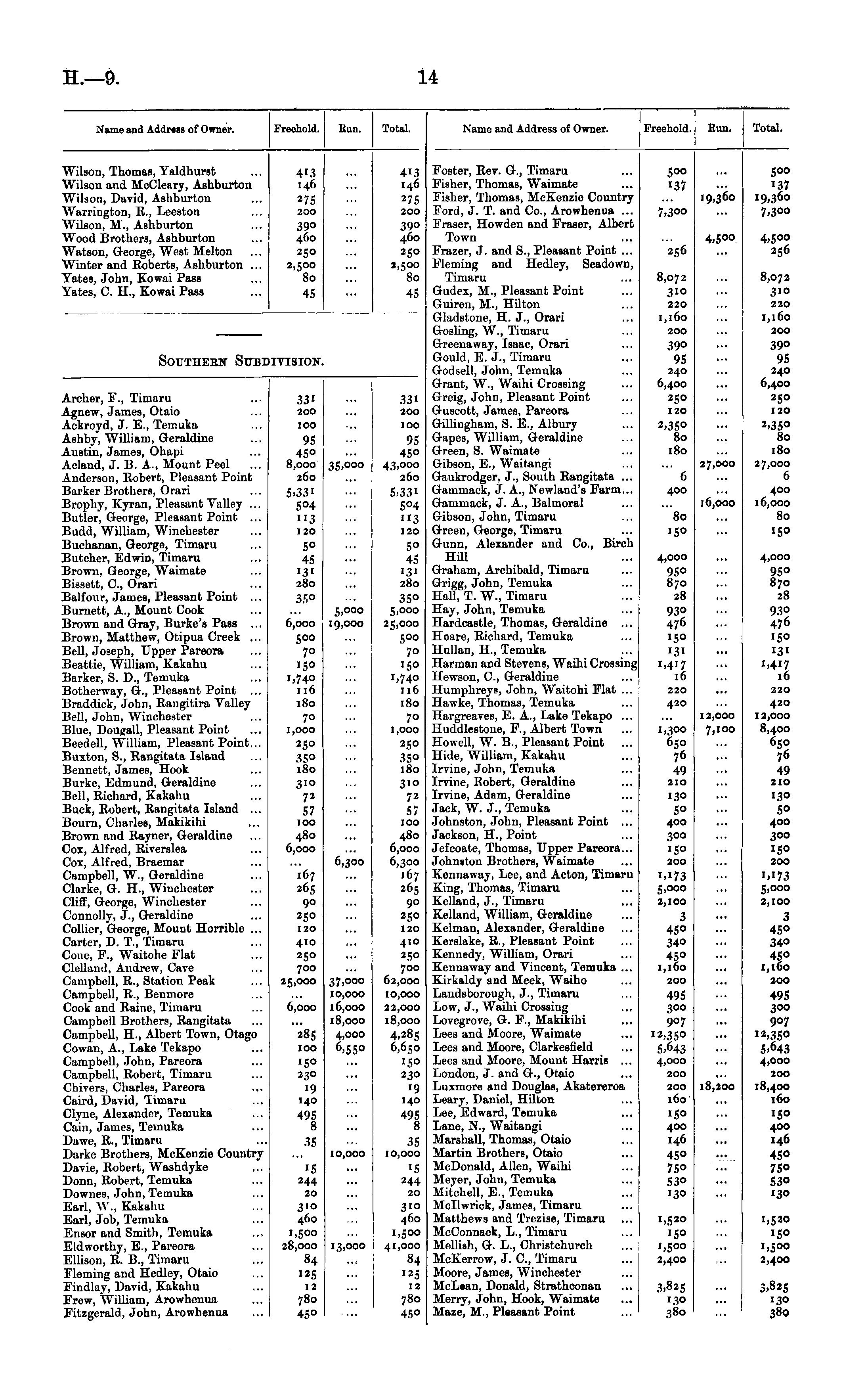 Name and Address of Owner. Freehold. Bun. Total. Foster, Rev. G., Timaru Fisher, Thomas, Waimate Fisher, Thomas, McKenzie Country Ford, J. T. and Co., Arowhenua ... Fraser, Howden and Fraser, Albert Town Frazer, ,1. and S., Pleasant Point ... Fleming and Hedley, Seadown, Timaru Gudex, M., Pleasant Point Guireu, M., Hilton Gladstone, H. J., Orari G-osling, W., Timaru Greenaway, Isaac, Orari Gould, E. J., Timaru Godsell, John, Temuka Grant, W., Waihi Crossing Greig, John, Pleasant Point Guscott, James, Pareora Gillingham, S. E., Albury Grapes, William, Geraldine Green, S. Waimate Gibson, E., Waitangi Gaukrodger, J., Soulh Rangitata ... Gammack, J. A., Ncwland's Farm... Gammack, J. A., Balmoral Gibson, John, Timaru Green, George, Timaru Gunn, Alexander and Co., Birch Hill Graham, Archibald, Timaru Grigg, John, Temuka Hall, T. W., Timaru Hay, John, Temuka Hardcastle, Thomas, Geraldine ... Hoare, Richard, Temuka Hullan, H., Temuka Harnian and Stevens, Wailii Crossing Hewson, C, Geraldine Humphreys, John, Waitohi Flat ... Hawke, Thomas, Temuka Hargreaves, E. A., Lake Tekapo ... Huddlestone, F., Albert Town Howell, W. B., Pleasant Point ... Hide, William, Kakahu Irvine, John, Temuka Irvine, Robert, Geraldine Irvine, Adam, Geraldine Jack, W. J., Temuka Johnston, John, Pleasant Point ... Jackson, H., Point Jefcoate, Thomas, Upper Pareora... Johnston Brothers, Waimate Kennaway, Lee, and Acton, Timaru King, Thomas, Timaru Kelland, J., Timaru Kelland, William, Geraldine Kelman, Alexander, G-eraldine Kerslake, R., Pleasant Point Kennedy, William, Orari Kennaway and Vincent, Temuka ... Kirkaldy and Meek, Waiho Landsborough, J., Timaru Low, J., Waihi Crossing Lovegrove, G. F., Makikihi Lees and Moore, Waimate Lees and Moore, Clarkesfield Lees and Moore, Mount Harris ... London, J. and G., Otaio Luxmore and Douglas, Akatereroa Leary, Daniel, Hilton Lee, Edward, Temuka Lane, X, Waitangi Marshall, Thomas, Otaio Martin Brothers, Otaio McDonald, Allen, Waihi Meyer, John, Temuka Mitchell, E., Temuka Mcllwrick, James, Timaru Matthews and Trezise, Timaru McConnack, L., Timaru Mellish, G. L., Christchurch ... ! McKerrow, J. C, Timaru ... j Moore, James, Winchester ... McL«an, Donald, Strathconan Merry, John, Hook, Waimate Maze, M., Pleasant Point 137 7.3°° 256 8,072 310 220 1,160 200 39° 95 240 6,400 250 120 2.35° 80 180 6 400 80 ■5° 4,000 95° 870 28 93° 476 150 1.417 16 220 420 1,300 650 76 49 210 ■30 50 400 300 •5° 200 '.173 5,000 2,100 19.360 4>5 00 27,000 16,000 12,000 7,100 500 '37 19,360 7.3OO 4.500 256 8,072 310 220 1,160 200 39° 95 240 6,400 250 120 2,350 80 180 27,000 6 400 16,000 80 ■SO 4,000 95° 870 28 930 476 •So 131 1.417 16 220 420 12,000 8,400 650 7 6 49 210 130 50 400 300 ■5° 200 MM 5,000 2,100 3 45° 340 45O 1,160 200 495 300 907 12,350 5,643 4,000 200 200 160 150 400 146 45° 75° 53o '30 3 45° 34O 450 1,160 200 495 300 907 12,35° 5> 643 4,000 200 18,400 160 '5° 400 146 45° 75° 53° '3° 18,200 1,520 J5° 1.500 2,400 1,520 150 1,500 2,400 3,825 130 380 3,825 •30 380