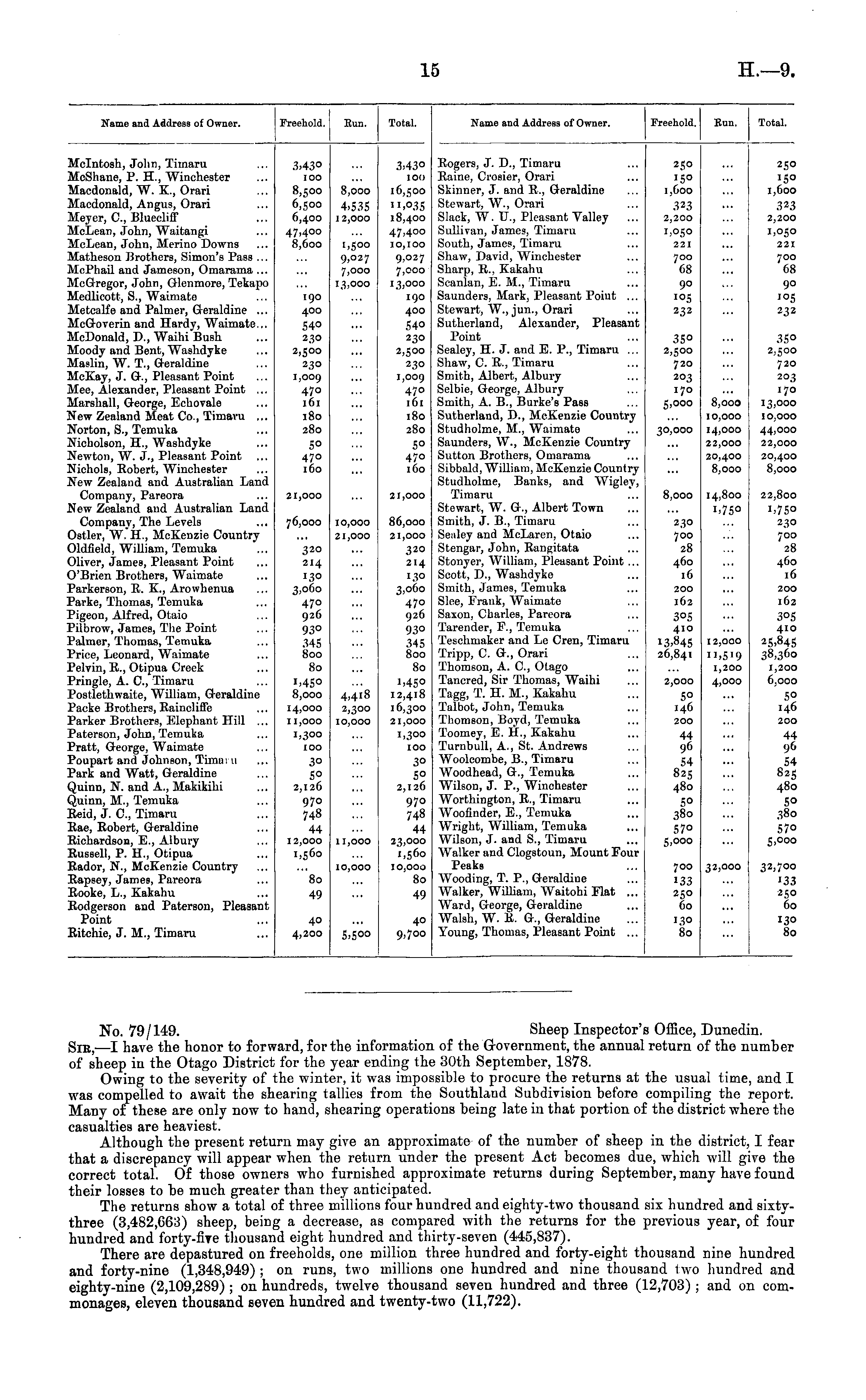 No. 79/149. Sheep Inspector's Office, Dunedin. Sib, —I have the honor to forward, for the information of the Grovernment, the annual return of the number of sheep in the Otago District for the year ending the 30th September, 1878. Owing to the severity of the winter, it was impossible to procure the returns at the usual time, and I was compelled to await the shearing tallies from the Southland Subdivision before compiling the report. Many of these are only now to hand, shearing operations being late in that portion of the district where the casualties are heaviest. Although the present return may give an approximate of the number of sheep in the district, I fear that a discrepancy will appear when the return under the present Act becomes due, which will give the correct total. Of those owners who furnished approximate returns during September, many have found their losses to be much greater than they anticipated. The returns show a total of three millions four hundred and eighty-two thousand six hundred and sixtythree (3,482,GG3) sheep, being a decrease, as compared with the returns for the previous year, of four hundred and forty-fire thousand eight hundred and thirty-seven (445,837). There are depastured on freeholds, one million three hundred and forty-eight thousand nine hundred and forty-nine (1,348,949) ; on runs, two millions one hundred and nine thousand two hundred and eightv-nine (2,109,289) ; on hundreds, twelve thousand seven hundred and three (12,703) ; and on commonages, eleven thousand seven hundred and twenty-two (11,722).