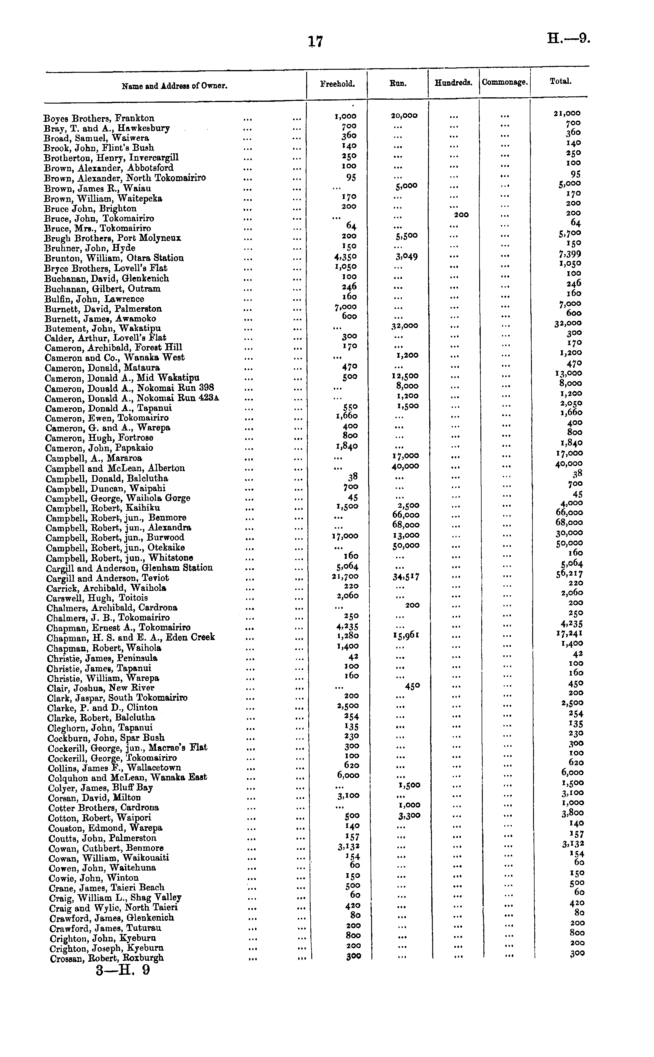 Name and Address of Owner. Freehold. I Hun. Hundreds. Commonage. Total. Boyes Brothers, Frankton Bray, T. and A., Hnwkeebury Broad, Samuel, Waiwera Brook, John, Flint's Bush Brotherton, Henry, Invercargill Brown, Alexander, Abbotsford Brown, Alexander, North Tokomairiro Brown, James R., Waiau Brown, William, Waitepeka Bruce John, Brighton Bruce, John, Tokomairiro Bruce, Mrs., Tokomairiro Brugh Brothers, Port Molyneux Bruhner, John, Hyde Brunton, William, Otara Station Bryce Brothers, Lovell's Flat Buchanan, David, Glenkpnich Buchanan, Gilbert, Outram Bulfin, John, Lawrence Burnett, David, Palmerston Burnett, James, Awamoko Butement, John, Wakatipu Calder, Arthur, Lovell's Flat Cameron, Archibald, Forest Hill Cameron and Co., Wanaka West Cameron, Donald, Mataura Cameron, Donald A., Mid Wakatipu Cameron, Donald A., Nokornai Run 398 Cameron, Donald A., Nokomai Run 423a Cameron, Donald A., Tapanui Cameron, Ewcn, Tokomairiro Cameron, G-. and A., Warepa Cameron, Hugh, Fortrose Cameron, John, Papakaio Campbell, A., Mararoa Campbell and McLean, Alberton Campbell, Donald, Balclutha Campbell, Duncan, Waipahi Campbell, George, Waihola Gorge Campbell, Robert, Kaihiku Campbell, Robert, jun., Benmore Campbell, Robert, jun., Alexandra Campbell, Robert, jun., Burwood Campbell, Robert, jun., Otekaike Campbell, Robert, jun., Whitstone Cargill and Anderson, Glenham Station Cargill and Anderson, Teviot Carrick, Archibald, Waihola Carswell, Hugh, Toitois Chalmers, Archibald, Cardrona Chalmers, J. B., Tokomairiro Chapman, Ernest A., Tokomairiro Chapman, H. S. and E. A., Eden Creek Chapman, Robert, Waihola Christie, James, Peninsula Christie, James, Tapanui Christie, William, Warepa Clair, Joshua, New River Clark, Jaspar, South Tokomairiro Clarke, P. and D., Clinton Clarke, Robert, Balclutha Cleghorn, John, Tapanui Cockburn, John, Spar Bush Cockerill, George, jun., Macrae's Flat Cockerill, George, 1'okomairiro Collins, James F., Wallacetown Colquhon and McLean, Wanaka East Colyer, James, Bluff Bay Corsan, David, Milton Cotter Brothers, Cardrona Cotton, Robert, Waipori Couston, Edmond, Warepa Coutts, John, Palmerston Cowan, Cuthbert, Benmore Cowan, William, Waikouaiti Cowen, John, Waitehuna Cowie, John, Winton Crane, James, Taieri Beach Craig, William L., Shag Valley Craig and Wylic, North Taieri Crawford, James, Glenkenich Crawford, James, Tuturau Crigliton, John, Kyeburn Crighton, Joseph, Kyeburn Crossan, Robert, Roxburgh 3—H. 9 1,000 700 36° 140 250 100 20,000 21,000 700 360 140 250 100 95 5,000 170 200 95 5,000 170 200 200 64 200 150 4.35° 1,050 100 246 160 7,000 600 300 170 470 500 5S° 1,660 400 800 1,840 38 700 45 i»5°° 17,000 160 5- o6 4 21,700 220 2,060 5.5OO 3.049 32,000 1,200 12,500 8,000 1,200 1,500 17,000 40,000 2,500 66,000 68,000 13,000 50,000 34.5 *7 200 64 5.700 150 7.399 1,050 100 246 160 7,000 600 32,000 300 170 1,200 470 13,000 8,000 1,200 2,050 1,660 400 800 1,840 17,000 40,000 38 700 45 4,000 66,000 68,000 30,000 50,000 160 5.° 64 56>2I7 220 2,060 200 250 4.235 17,241 1,400 42 100 160 45° 200 2,500 254 135 230 300 100 620 6,000 i>5°° 3,100 1,000 3,800 140 157 3.132 »54 60 150 500 60 420 80 200 800 200 300 250 4.235 1,280 1,400 42 100 160 200 •5>9 6x 200 2,500 254 I3S 230 300 100 620 6,000 450 1,500 3,100 1,000 3.3oo 500 140 "57 '54 60 "5° 500 60 420 80 200 800 200 300