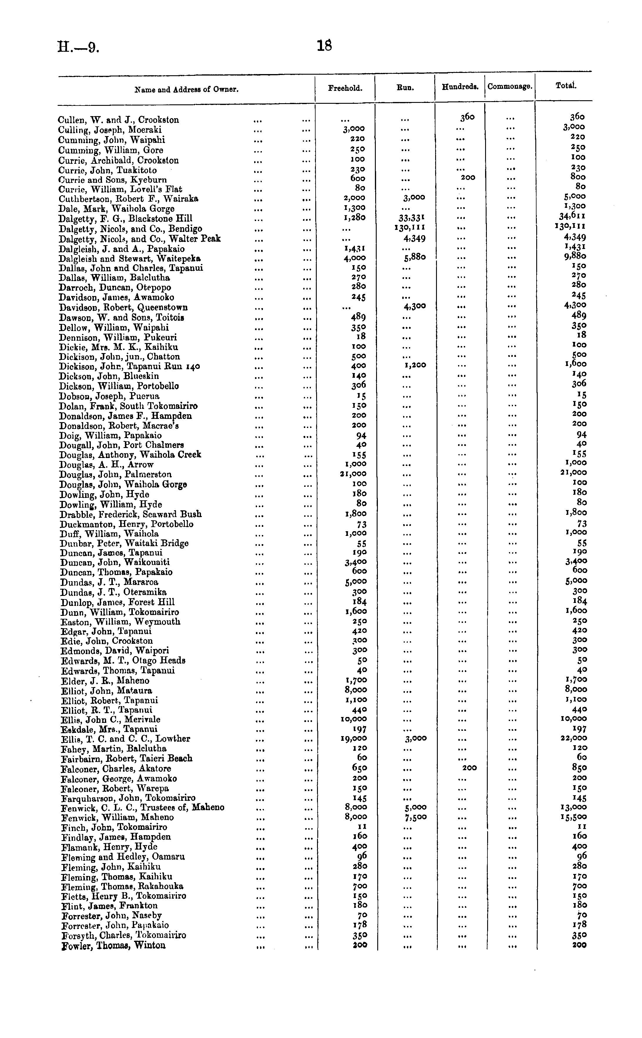 Same and Address of Owner. Freehold. Bun. Hundreds. Commonage. Total. Cullen, \V. and J., Crookston Culling, Joseph, Moeraki dimming, Jolin, Waipahi dimming, William, Gore Currie, Archibald, Crookelou Currie, John, Tuakitoto Ourrie and Sons, Kyeburn Currie, William, Lorell's Flat Cuthbertson, Robert F., Wairaka Dale, Mark, Waihola Gorge Dalgetty, F. G., Blackstone Hill Dalgetty, Nicols, and Co., Bendigo Dalgetty, Niool», and Co., Walter Peak Dalgleish, J. and A., Papakaio Dnlgleish and Stewart, Waitepeka Dallas, John and Charles, Tapanui Dallas, William, Balclutha Darroeh, Duncan, Otepopo DaridsoD, James, Awamoko Davidson, Eobert, Queenstown Dawsou, W. and Sons, Toitois Dellow, William, Waipahi Dennison, William, Pukoiiri Dickie, Mrs. II. K., Kaihiku Dickison, John, Jan., Chatton Dickison, John, Tapanui Bun 140 Dickson, John, Blueskin Dickson, William, Portobello Dobson, Joseph, Puerua Dolan, Frank, South Tokomairiro Donaldson, James F., Hampdcn Donaldson, Robert, Macrae's Doig, William, Papakaio Dougall, John, Port Chalmers Douglas, Anthony, Waihola Creek Douglas, A. H., Arrow Douglas, John, Palrnerston Douglas, John, Waihola Gorge Dowling, John, Hyde Dowling, William, Hyde Drabble, Frederick, Seaward Bush Duckmanton, Henrr, Portobello Duff, William, Waihola Dunbor, Peter, Waitaki Bridge Duncan, James, Tapnmii Duncan, John, Waikouaiti Duncan, Thomas, Papakaio Dumlas, J. T., Mararoa Dundas, J. T., Oteramika Dunlop, James, Forest Hill Dunn, William, Tokomairiro Easton, William, Weymouth Edgar, John, Tnpanui Edie, John, Crookston Edmonds, Darid, Waipori Edwards, M. T., Olago Heads Edwards, Thomas, Tapanui Elder, J. R., Maheno Elliot, John, Mataura Elliot, Robert, Tnpanui Elliot, R. T., Tapanui Ellis, John C, Merirale Eskdale, Mrs., Tapanui Ellis, T. C. and C. C, Lowther Fahey, Martin, Balelutha Fairbairn, Robert, Taieri Beach Falconer, Charles, Akatore Falconer, George, Awamoko Falconer, Robert, Warepa Farquliavsou, John, Tokomairiro Fenwick, C. L. 0., Trustees of, Maheno Fenwick, William, Maheno Finch, John, Tokomairiro Findiay, James, Hampden Flainank, Henry, Hyde Fleming and Hedley, Oamaru Fleming, John, Kaihiku Fleming, Thomas, Kaihiku Fleming, Thomae, Rakahouka Fletts, Jleury B., Tokomairiro Flint. James, Frankton Forrester, John, Naseby Forrester, John, Pac.akaio Eorsjth, Charles, Tokomairiro Fowier, Thomas, Wintoa 3,000 220 250 100 230 600 80 2,000 1,300 1,280 1.43 1 4,000 'So 270 280 245 3,000 33.33" 130,111 4.349 5,88o 360 200 360 3,000 220 250 loo 230 800 80 S.°oo 1,300 34.6n 13 0.1" 4.349 M31 9,880 >5o 270 280 24S 4.3oo 489 35° 18 100 5oo 1,600 140 306 15 '5° 200 200 4.300 489 35° 18 100 gee 400 140 306 15 150 200 200 1,200 94 40 '55 1,000 21,000 100 180 80 1,800 73 1,000 55 190 3.400 600 5.o°° 300 184 1,600 250 420 300 300 5° 40 1,700 8,000 1,100 440 10,000 197 19,000 120 60 650 200 »S° 145 8.000 8,000 94 40 »5S 1,000 21,000 100 180 80 1,800 73 1,000 55 190 3.4oo 600 5>ooo 300 184 i,6oo 250 420 300 300 50 40 1,700 8,000 1,100 440 10,000 i97 22,000 120 60 850 200 '5° '45 13,000 15.500 11 160 400 96 280 I/O 700 !5O 1 So 70 178 350 200 3,000 200 5,000 7.5°° 11 160 400 96 280 170 700 150 180 70 178 350 200