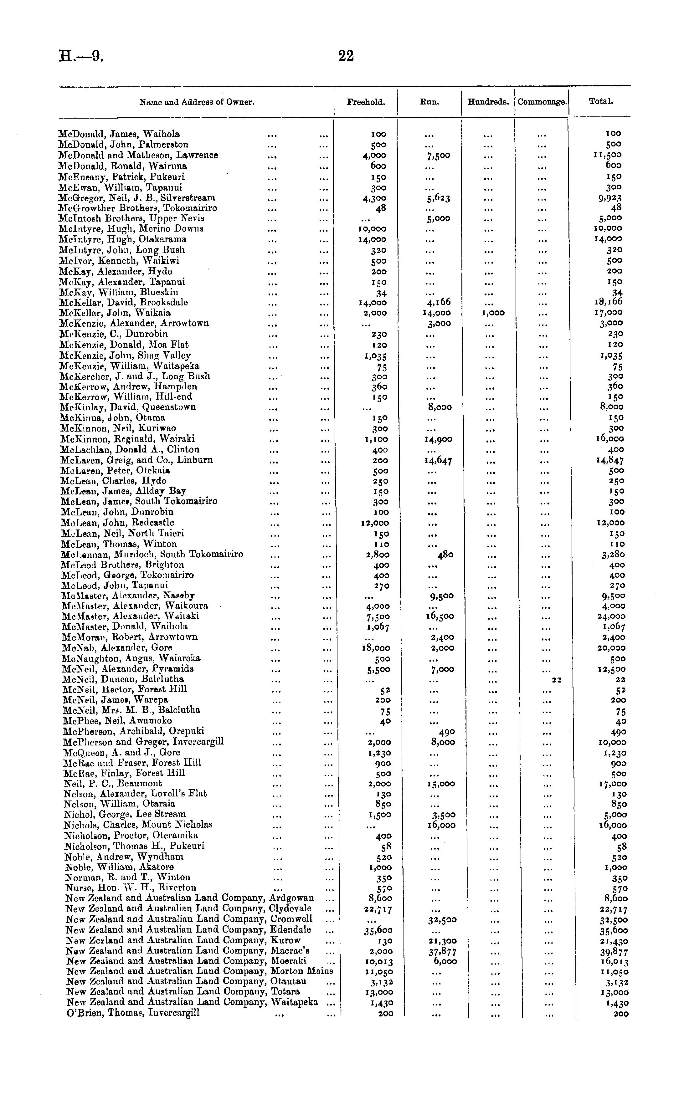 Name and Address of Owner. Freehold. Bun. I Hundreds. Commonage. Total. McDonald, James, Waihola McDonald, John, P&lrneraton McDonald and Matheson, Lawrence McDonald, Ronr.Id, Wairuna McEneany, Patrick, Pukeuri McEwan, William, Tapanui McGregor, Neil, J. B., SilTerstream McGrowther Brothers, Tokomairiro Melntosh Brot hers, tipper Nevi3 Mclntyre, Hugh, Merino Downs Mclntyre, Hugh, Otskarania Mclntyre, John, Long Bush Mclvor, Kenneth, Wuikiwi McKay, Alexander, Hyde McKay, Alexander, Tapanui Hclvuv, William, Blueskin McICcllar, David, Brooksdale McKcllnr, John, Waikaia McKenzie, Alexander, Arrowtown McKenzie, C, Dunrobin McKenzie, Donald, Moa Flat McKenzie, John, Shag Valley McKenzie, William, Waitapeka McKerchcr, J. and J., Long Bush ... McKerrowj Andrew, HampJen MeKerrow, William, Hill-end McLvmlay, David, Queenstown McKinna, John, Otania McKinnon, Neil, Kuriwao McKinnon, Reginald, Wairaki McLachlan, Donald A., Clinton McLaren, Greig, and Co., Linburn McLaren, Peter, Otekuia McLean, Charles, Hyde McLean, James, Allday Bay McLean, Jame», South Tokomairiro McLean, John, Dunrobin McLean, John, Redcastle McLean, Neil, North Taieri McLean, Thomas, Winton Mel.ennan, Murdoch, South Tokomairiro McLeod Brothers, Brighton McLeod, George, Tokomairiro MeLeod, John. Tapanui Me Master, Alexander, Nnsoby MoMaater, Alexander, Waikoui'a McMaster, Alexander, W.iilaki Mcilaster, Donald, Waihola McMoran, Robert, Arrowtown McNab, Alexander, Gore MoNaugbton, Angus, Wainreka McNeil, Alexander, Pyramids McNeil, Duncan, Balclutha McNeil, Heetor, Forest Hill McNeil, James, Warepa McNeil, Mr.<. M. B , Balclutha McPhee, Neil, Awamoko MoPherson, Archibald, Orepuki McPherson and Gregor, Invercargill McQueon, A. and J., Gore McKac and Fraser, Forest Hill McRae, Finlay, Forest Hill Neil, P. C, Beaumont Nelson, Alexander, Lovell's Flat Neb-on, William, Otaraia Nichol, George, Lee Stream Nichols, Charles, Mount Nicholas Nicholson, Proctor, Oteramika Nicholson, Thomas H., Pukeuri Noble, Andrew, Wyndham Noble, Willmm, Akatore Norman, R. and T., Winton Nurse, Hon. W. H., Rivertou New Zealand and Australian Land Company, Ardgowan New Zealand and Australian Land Company, Clydevalo New Zealand and Australian Land Company, Cromwell New Zealand and Australian Land Company, Edendale New Zeiland and Australian Land Company, Kurow New Zealand and Australian Land Company, Macrae's New Zealand and Australian Land Company, Moeraki New Zealand and Australian Land Company, Morton Mains New Zealand and Australian Land Company, Otautau New Zealand and Australian Land Company, Totara New Zealand and Australian Land Company, Waitapeka ... O'Brien, Thomas, Iuvercargill 100 500 4,000 600 7.500 100 500 11,500 600 150 300 4.3oo 48 sM3 !50 300 9>9 23 48 5,000 10,000 14,000 10,000 14,000 320 500 200 5,000 150 34 14,000 2,000 4,166 14,000 3.000 320 500 200 ■5° 34 18,166 17,000 3,000 230 120 1,000 230 120 1.035 75 300 360 ■5° 300 1,100 8,000 14,900 1.035 75 300 360 '5° 8,000 '50 300 16,000 400 14,847 500 250 150 300 100 400 200 500 250 150 300 100 12,000 «5° 110 2,800 400 400 270 14,647 12,000 '5° 110 3,280 480 4,000 7.5°o 1,067 18,000 500 5.5oo 200 75 40 2,000 1.23° 900 500 2,000 130 850 1,500 9,500 16,500 2,400 2,000 7,000 490 8,000 15,000 22 400 400 270 9,500 4,000 24,000 1,067 2,400 20,000 5°o 12,500 22 52 200 75 40 490 10,000 1,230 900 500 17,000 130 850 5,000 16,000 400 58 520 1,000 35° 57° 8,600 22,717 32.500 35,600 21,430 39.877 16,013 11,050 3,132 13,000 1.430 200 3.500 16,000 400 58 520 1,000 35o 57o 8,600 22,717 32.50° 35.6oo '30 2,000 10,013 11,050 3.»3* 13,000 ".43o 200 21,300 37.877 6,000