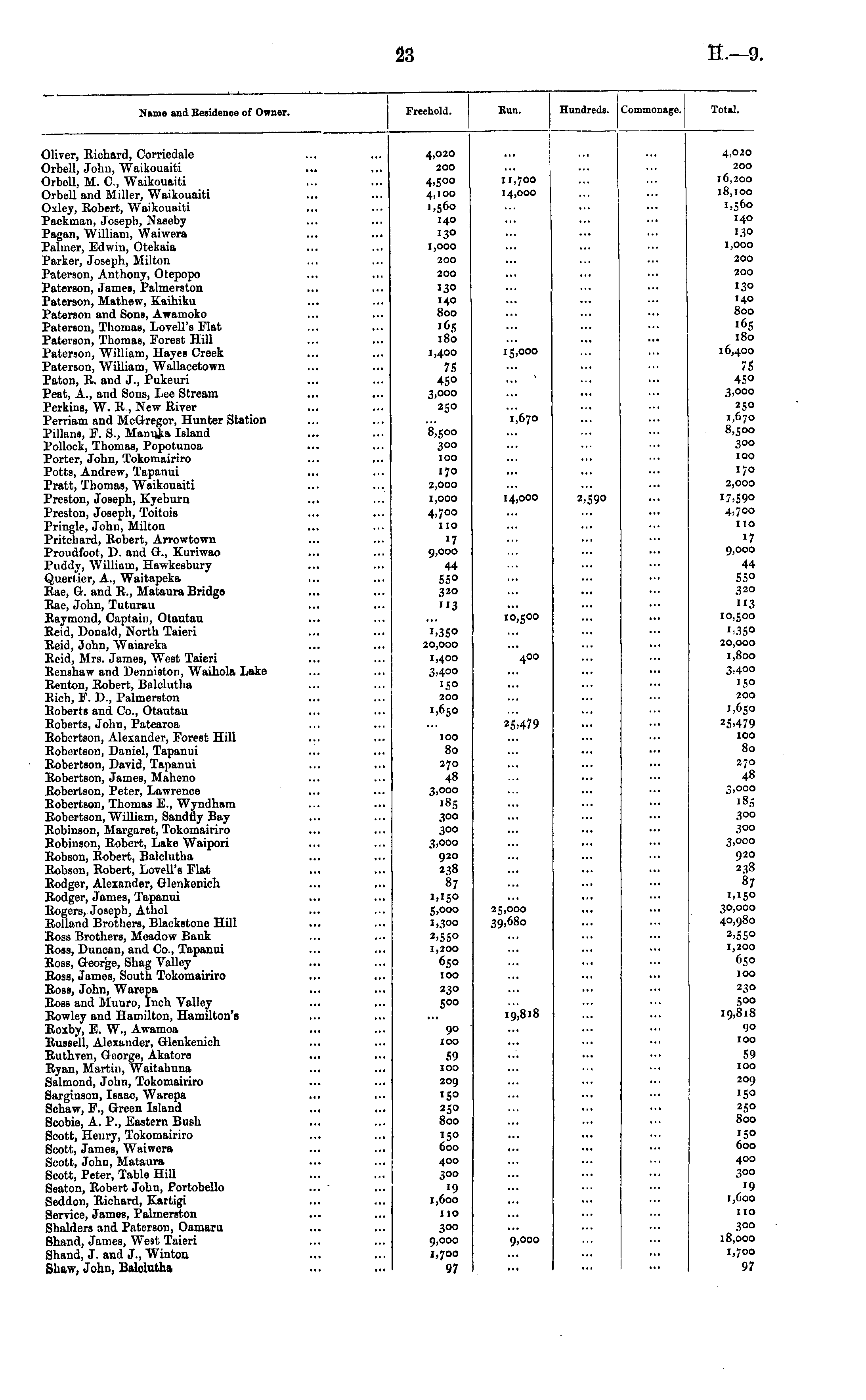 Name and Eeaidence of Owner. Freehold. Bun. Hundreds. Commonage. Total. Oliver, Richard, Corriedalc Orbell, John, Waikouaiti Orbell, M. C, Waikouaiti Orbell and Miller, Waikouaiti Oxley, Robert, Waikouaiti Packman, Joseph, Naseby Pagan, William, Waiwera Palmer, Edwin, Otekaia Parker, Joseph, Milton Paterson, Anthony, Otepopo Paterson, James, Palmerston Paterson, Mathew, Kaihiku Paterson and Sons, Awamoko Patereon, Thomas, Lovell's Hat Paterson, Thomas, Forest Hill Paterson, William, Hayes Creek Paterson, William, Wallacetown Paton, R. and J., Pukeuri Peat, A., and Sons, Lee Stream Perkius, W. R, New River Perriam and McGregor, Hunter Station Pillans, F. S., Manuka Island Pollock, Thomas, Popotunoa Porter, John, Tokomairiro Potts, Andrew, Tapanui Pratt, Thomas, Waikouaiti Preston, Joseph, Kjeburn Preston, Joseph, Toitois Pringle, John, Milton Pritchard, Robert, Arrowtown Proudfoot, D. and &., Kuriwao Puddy, William, Hawkesbury Querfier, A., Waitapeka Rae, G. and R., Mataura Bridge Rae, Jolm, Tuturau Raymond, Captain, Otautau Reid, Donald, North Taieri Reid, John, Waiarcka Reid, Mrs. James, West Taieri Renshaw and Denniston, Waihola Lake Rentou, Robert, Balclutha Rich, F. D., Palmerston Roberts and Co., Otautau Roberts, John, Patearoa Robertson, Alexander, Forest Hill Robertson, Daniel, Tapanui Robertson, David, Tapanui Robertson, James, Maheno Robertson, Peter, Lawrence Robertson, Thomas E., Wyndham Robertson, William, Sandfly Bay Robinson, Margaret, Tokomairiro Robinson, Robert, Lake Waipori Robson, Robert, Balclutha Robson, Robert, Lovell's Flat Rodger, Alexander, Glenkenicli Rodger, James, Tapanui Rogers, Joseph, Athol Rolland Brothers, Blackstone Hill Ross Brothers, Meadow Bank Ross, Duncan, and Co., Tapanui Ross, George, Shag Valley Ross, James, South Tokomairiro Ross, John, Warepa Ross and Munro, Inch Valley Rowley and Hamilton, Hamilton's Roxby, E. W., Awaraoa Russell, Alexander, Glenkenich Ruthven, George, Aiatore Ryan, Martin, Waitahuna Salmond, John, Tokomairiro Sarginson, Isaac, Warepa Schaw, F., Green Island Scobie, A. P., Eastern Bush Scott, Henry, Tokomairiro Scott, James, Waiwera Scott, John, Mataura Scott, Peter, Table Hill Seaton, Robert Jolm, Portobello Seddon, Richard, Kartigi Service, James, Palmerston Shalders and Paterson, Oamaru Shand, James, West Taieri Shand, J. and J., Winton Shaw, John, Balclutha 4,020 200 4>5 00 4,100 1,560 140 130 1,000 200 11,700 14,000 4,020 200 l6,2OO l8,IOO I.560 140 130 I,O0O 200 200 >3o 140 800 >&5 180 1,400 75 45° 3.000 250 15,000 2OO I3O 140 800 165 l8o 16,400 75 45° 3.000 250 1,670 8,500 300 100 170 2,000 17,590 4,700 no 1,670 8,500 300 100 170 2.000 1,000 4,700 110 •7 9.000 44 55° 320 "3 14,000 2,59° i.35° 20,000 1,400 3,4oo «5° 200 1,650 10,500 »7 9,000 44 55° 320 "3 10,500 '.35° 20,000 1,800 3.400 '5° 200 1,650 25.479 100 80 400 25.479 100 80 270 48 3,000 "85 300 300 3,000 920 238 87 M50 S.000 1,300 2.55O 1,200 650 100 270 48 3.000 185 300 300 3,000 920 238 87 1,15° 30,000 40,980 2.55° 1,200 650 100 25,000 39,680 230 500 230 500 19,818 90 100 59 100 19,818 90 100 59 100 209 •5° 250 800 209 150 250 800 '5° 600 400 300 "9 1,600 110 600 400 300 19 1,Coo no 300 9,000 1,700 97 9,000 300 18,000 1.700 97