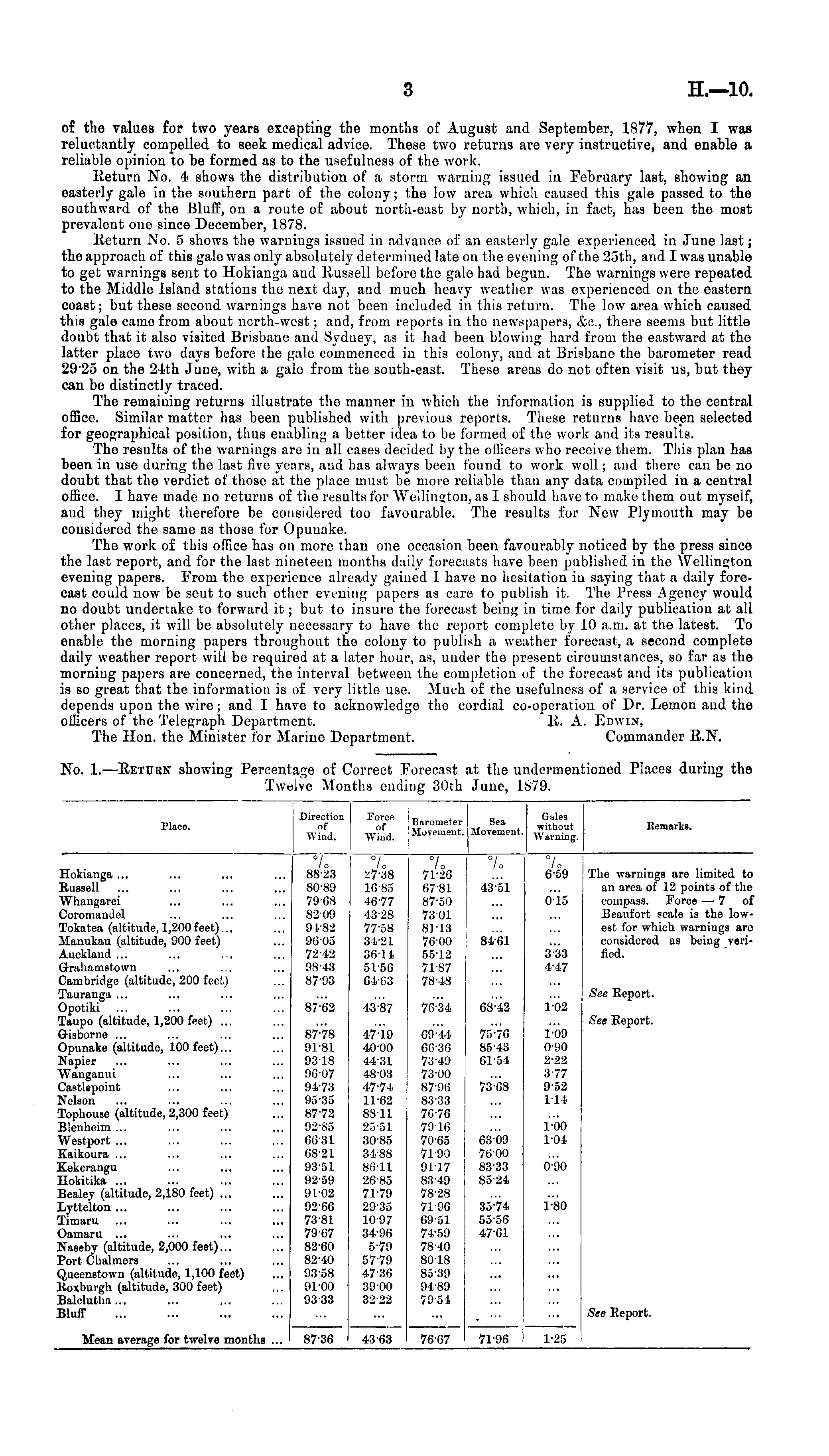 No. 1. —RETURN showing Percentage of Correct Forecast at the undermentioned Places during the Twelve Months ending 30th June, 1879.