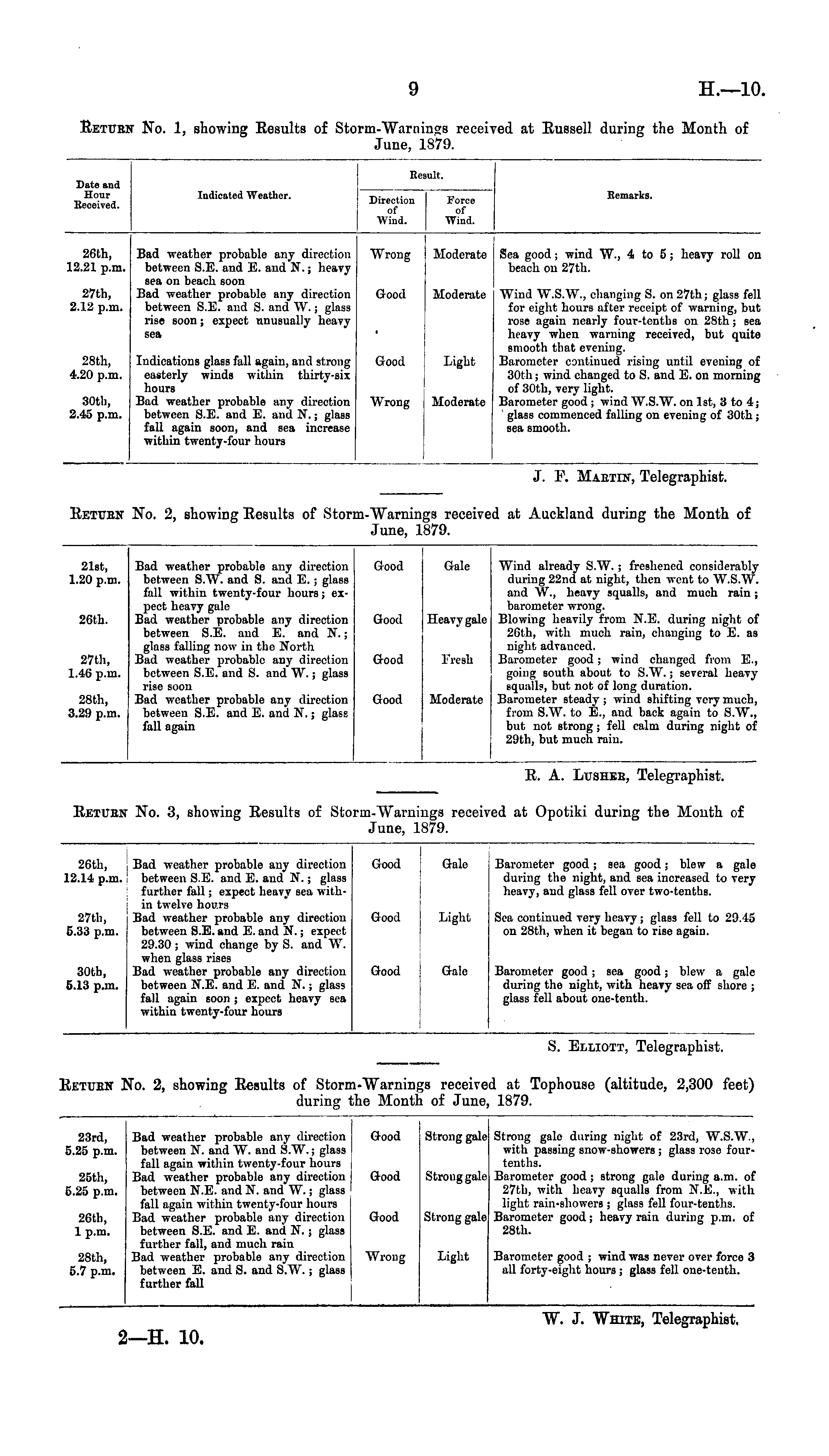 RETURN No. 3, showing Results of Storm-Warnings received at Opotiki during the Month of June, 1879.