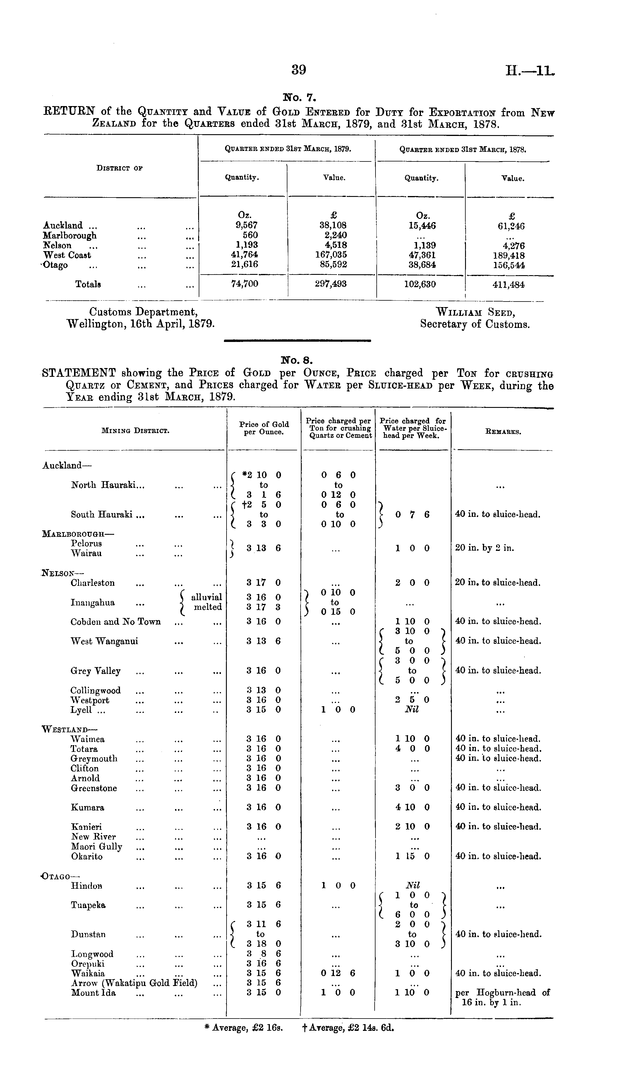 Quarter ended 11st March, 1879. Quarter ended 11st March, 1878. District of Quantity. Value. Quantity. Value. . i i Auckland ... Marlborough Nelson West Coast Otago Oz. 9,567 560 1,193 41,764 21,610 £ 38,108 2,240 4,518 167,035 85,592 Oz. 15,446 ... 1,139 47,361 38,684 £ 61,246 ... 4,276 189,418 156,544 Totals 74,700 297,493 102,630 411,484 Customs Department, Wellington, 16th April, 18 Will Secretary am Seed, ' of Customs. :79.