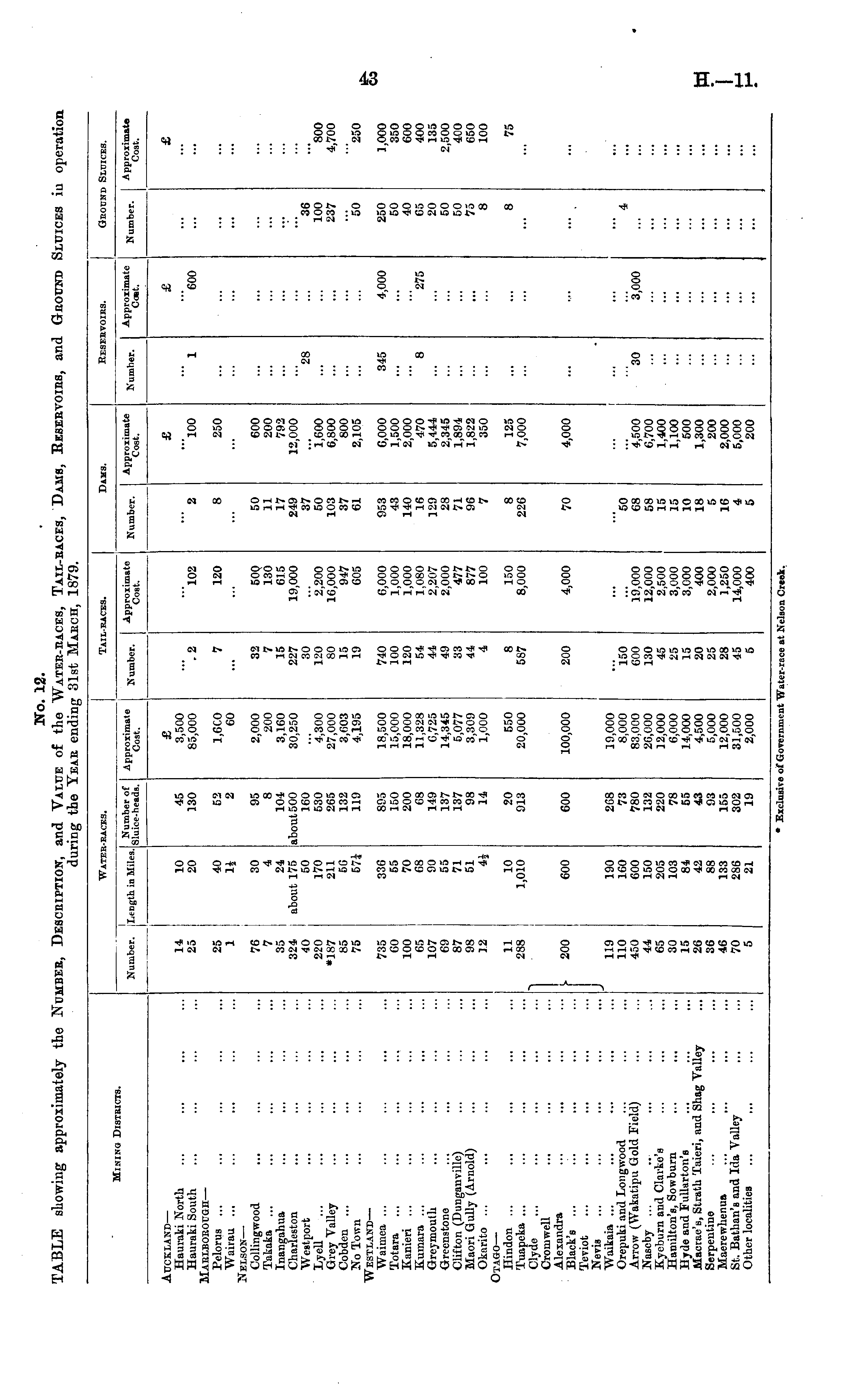 No. 12. TABLE showing approximately the NUMBER, DESCRIPTION, and VALUE of the WATER-RACES, TAIL-RACES, DAMS, RESERVOIRS, and GROUND SLUICES in operation during the YEAR ending 31st MARCH 1879.