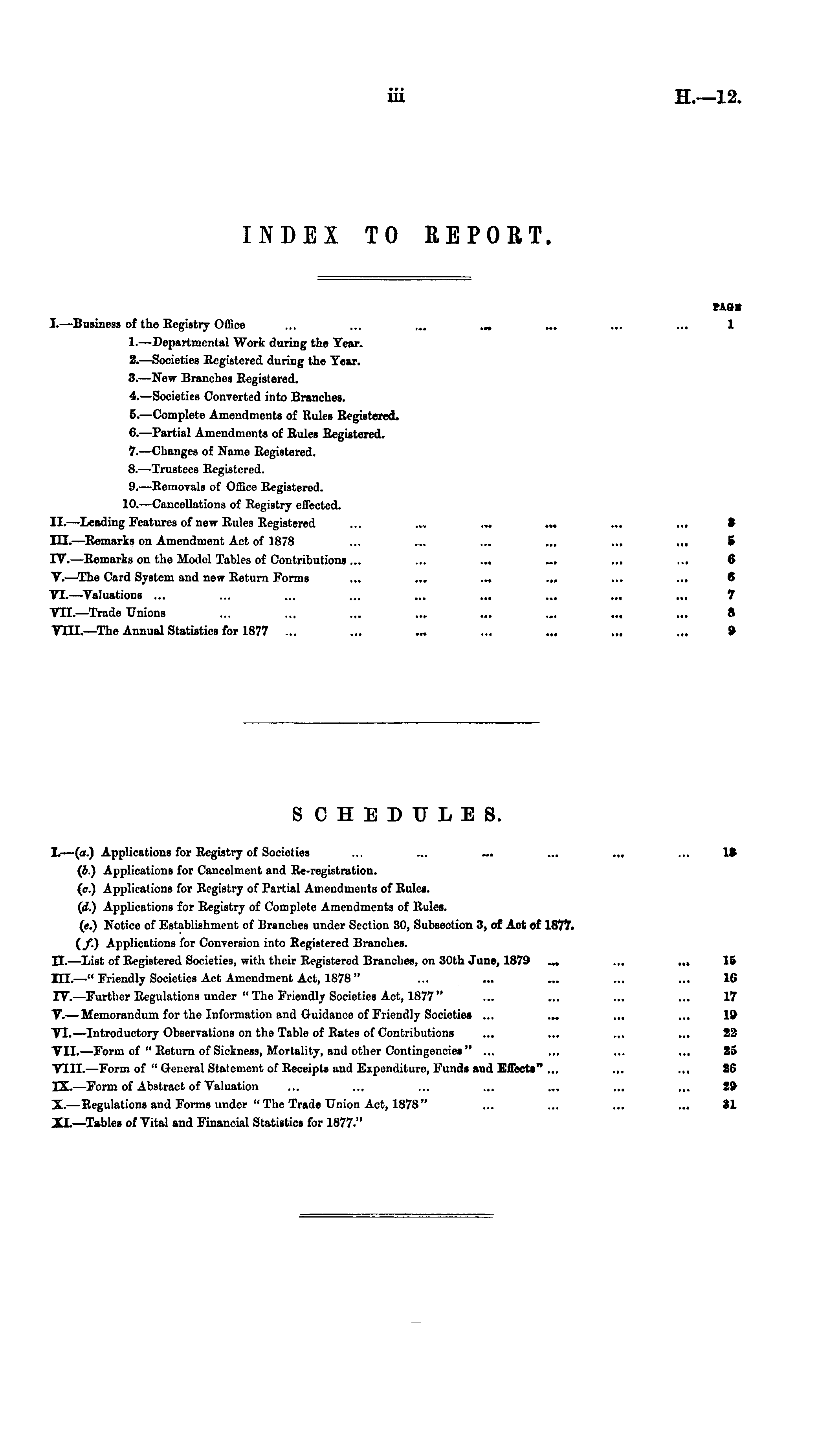 INDEX TO REPORT. mm I.—Business of the Registry Office ... ... ... ... ... ... ... 1 1. —Departmental Work during the Year. 2.—Societies Registered during the Year. 3.—New Branches Registered. 4.—Societies Converted into Branches. s.—Complete Amendments of Rules Registered. 6.—Partial Amendments of Rules Registered. 7. —Changes of Name Registered. 8. —Trustees Registered. 9.—Removals of Office Registered. 10. —Cancellations of Registry effected. ll.—Leading Features of new Rules Registered ... ... ... ... ... ... • ILL —Remarks on Amendment Act of 1878 ... ... ... ... ... ... 6 TV.—Remarks on the Model Tables of Contributions ... ... ... ... ... ... 6 V.—The Card System and new Return Forms ... ... ... ... ... ... 6 VT.—Valuations ... ... ... ... ... ... ... ... ... 7 VII. —Trade Unions ... ... ... ... ... ... ... ... 8 VTII.— The Annual Statistics for 1877 ... ... ._. ... ... ... ... 0