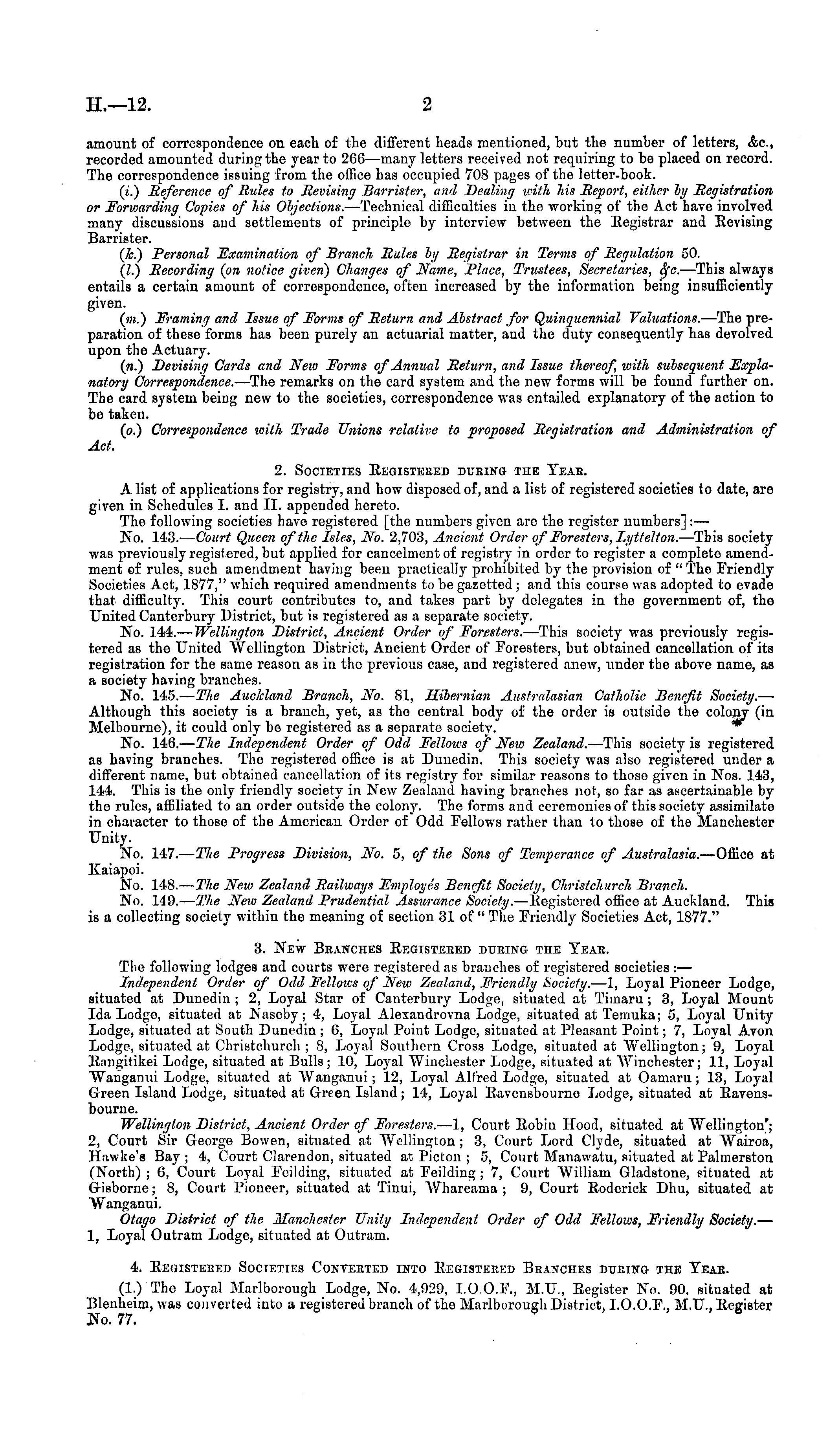 amount of correspondence on each of the different heads mentioned, but the number of letters, &c, recorded amounted during the year to 20G —many letters received not requiring to be placed on record. The correspondence issuing from the office has occupied 708 pages of the letter-book. (_) Reference of Rules to Revising Barrister, and Dealing with his Report, either by Registration or Forwarding Copies of his Objections. —Technical difficulties in the working of the Act have involved many discussions aud settlements of principle by interview between the Registrar and Revising Barrister. (k.) Personal Examination of Branch Rules by Registrar in Terms of Regulation 50. (/.) Recording (on notice given) Changes of Name, Place, Trustees, Secretaries, Sfc. —This always entails a certain amount of correspondence, often increased by the information being insufficiently given. (ot.) Framing and Issue of Forms of Return and Abstract for Quinquennial Valuations. —The preparation of these forms has been purely an actuarial matter, and the duty consequently has devolved upon the Actuary. (n.) Devising Cards and New Forms of Annual Return, and Issue thereof iviili subsequent Explanatory Correspondence. —The remarks on the card system and the new forms will be found further on. The card system being new to the societies, correspondence was entailed explanatory of the action to be taken. (0.) Correspondence with Trade Unions relative to proposed Registration and Administration of Act. 2. Societies Registered during the Tear. A list of applications for registry, and how disposed of, and a list of registered societies to date, are given in Schedules I. and 11. appended hereto. The following societies have registered [the numbers given are the register numbers] : — No. 143. — Court Queen ofthe Isles, No. 2,703, Ancient Order of Foresters, Lyttelton. —This society was previously registered, but applied for cancelment of registry in order to register a complete amendment of rules, such amendment having been practically prohibited by the provision of " Tho Friendly Societies Act, 1877," which required amendments to be gazetted ; and this course was adopted to evade that difficulty. This court contributes to, and takes part by delegates in the government of, the United Canterbury District, but is registered as a separate society. No. 144.— Wellington District, Ancient Order of Foresters. —This society was previously registered as the United Wellington District, Ancient Order of Foresters, but obtained cancellation of its registration for the same reason as in the previous case, and registered anew, under the above name, as a society having branches. No. 145.— The Auckland Branch, No. 81, Hibernian Australasian Catholic Benefit Society. — Although this society is a branch, yet, as the central body of the order is outside the colony (in Melbourne), it could only be registered as a separate society. No. 146.-— The Independent Order of Odd Felloics of Neio Zealand. —This society is registered as having branches. The registered office is at Dunedin. This society was also registered under a different name, but obtained cancellation of its registry for similar reasons to those given in Nos. 143, 144. This is the only friendly society in New Zealand having branches not, so far as ascertainable by the rules, affiliated to an order outside the colony. Tho forms and ceremonies of this society assimilate in character to those of the American Order of Odd Fellows rather than to those of the Manchester Unity. No. 147.— The Progress Division, No. 5, of the Sons of Temperance of Australasia. —Office at Kaiapoi. No. 148.— The New Zealand Railways Employes Benefit Society, Christchurch Branch. No. 149. — The New Zealand Prudential Assurance Society. —Registered office at Auckland. This is a collecting society within the meaning of section 31 of " The Friendly Societies Act, 1877." 3. New Branches Registered during the Tear. Tiie following lodges and courts were registered as branches of registered societies : — Independent Order of Odd Fellows of New Zealand, Friendly Society. —1, Loyal Pioneer Lodge, situated at Dunedin ; 2, Loyal Star of Canterbury Lodge, situated at Timaru ; 3, Loyal Mount Ida Lodge, situated at Naseby; 4, Loyal Alexandrovna Lodge, situated at Temuka; 5, Loyal Unity Lodge, situated at South Dunedin; 6, Loyal Point Lodge, situated at Pleasant Point; 7, Loyal Avon Lodge, situated at Christchurch; 8, Loyal Southern Cross Lodge, situated at Wellington; 9, Loj'al Rangitikei Lodge, situated at Bulls ; 10, Loyal Winchester Lodge, situated at AYinchester; 11, Loyal Wanganui Lodge, situated at Wanganui; 12, Loyal Alfred Lodge, situated at Oamaru ; 13, Loyal Green Island Lodge, situated at Green Island; 14, Loyal Ravensbourno Lodge, situated at Ravensbourne. Wellington District, Ancient Order of Foresters. —l, Court Robin Hood, situated at Wellington"; 2, Court Sir George Bowen, situated at Wellington; 3, Court Lord Clyde, situated at Wairoa, Hawke's Bay ; 4, Court Clarendon, situated at Picton ; 5, Court Manawatu, situated at Palmerston (North) ; 6, Court Loyal Feilding, situated at Feilding; 7, Court William Gladstone, situated at Gisborne; 8, Court Pioneer, situated at Tinui, Whareama ; 9, Court Roderick Dhu, situated at Wanganui. Otago District of the Manchester Unity Independent Order of Odd Fellows, Friendly Society. — 1, Loyal Outram Lodge, situated at Outram. 4. Registered Societies Converted into Registered Branches during the Tear. (1.) The Loyal Marlborough Lodge, No. 4,929, 1.0.0. F., M.U., Register No. 90. situated at Blenheim, was converted into a registered branch of the Marlborough District, 1.0.0. F., M.U., Register No. 77.