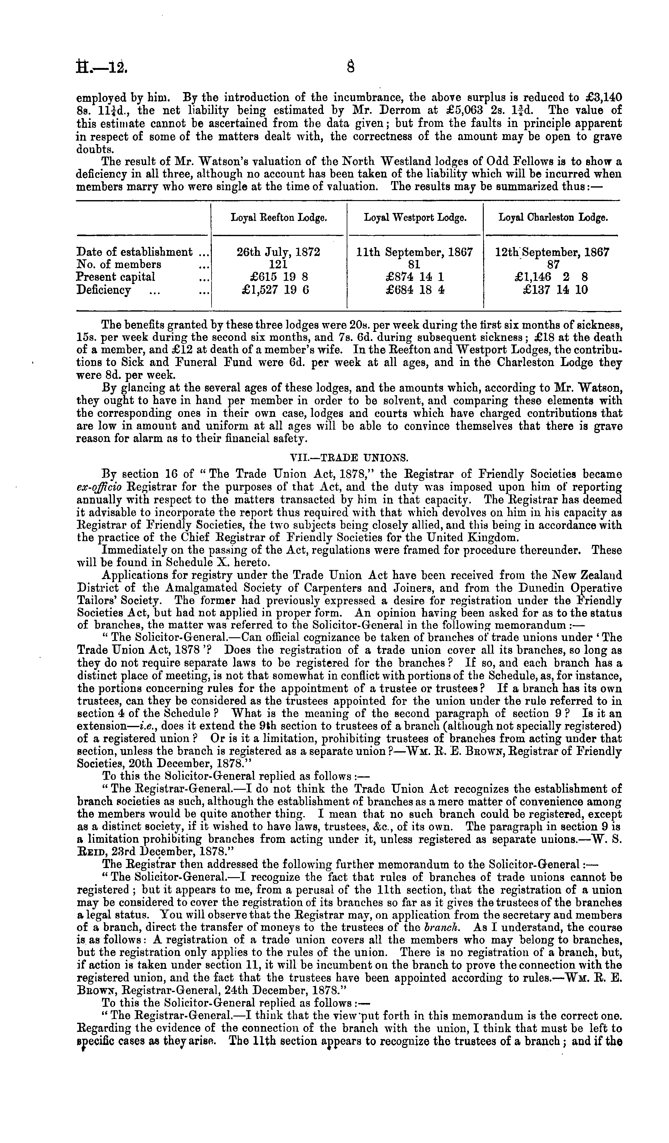 employed by him. By the introduction of the incumbrance, the above surplus is reduced to £3,140 Bs. llid., the net liability being estimated by Mr. Derrom at £5,063 2s. l|d. The value of this estimate cannot be ascertained from the data given; but from the faults in principle apparent in respect of some of the matters dealt with, the correctness of the amount may be open to grave doubts. The result of Mr. Watson's valuation of the North Westland lodges of Odd Fellows is to show a deficiency in all three, although no account has been taken of the liability which will be incurred when members marry who were single at the time of valuation. The results may be summarized thus: — Loyal Reefton Lodge. Loyal Westport Lodge. Loyal Charleston Lodge. Date of establishment ... 26th July, 1872 11th September, 1867 12th September, 1867 No. of members ... 121 81 87 Present capital ... £615 19 8 £874 14 1 £1,146 2 8 Deficiency ... ... £1,527 19 6 £684 18 4 £137 14 10 The benefits granted by these three lodges were 20s. per week during the first six months of sickness, 15s. per week during the second six months, and 7s. 6d. during subsequent sickness ; £18 at the death of a member, and £12 at death of a member's wife. In the Reefton and Westport Lodges, the contributions to Sick and Funeral Fund were 6d. per week at all ages, and in the Charleston Lodge they were Bd. per week. By glancing at the several ages of these lodges, and the amounts which, according to Mr. Watson, they ought to have in hand per member in order to be solvent, and comparing these elements with the corresponding ones in their own case, lodges and courts which have charged contributions that are low in amount and uniform at all ages will be able to convince themselves that there is grave reason for alarm as to their financial safety. VII.—TRADE UNIONS. By section 16 of " The Trade Union Act, 1878," the Registrar of Friendly Societies became ex-officio Registrar for the purposes of that Act, and the duty was imposed upon him of reporting annually with respect to the matters transacted by him in that capacity. The Registrar has deemed it advisable to incorporate the report thus required with that which devolves ou him in his capacity as Registrar of Friendly Societies, the two subjects being closely allied, and this being in accordance with the practice of the Chief Registrar of Friendly Societies for the United Kingdom. Immediately on the passing of the Act, regulations were framed for procedure thereunder. These will be found in Schedule X. hereto. Applications for registry under the Trade Union Act have been received from the New Zealand District of the Amalgamated Society of Carpenters and Joiners, and from the Dunedin Operative Tailors' Society. The former had previously expressed a desire for registration under the Friendly Societies Act, but had not applied in proper form. An opinion having been asked for as to the status of branches, the matter was referred to the Solicitor-General in the following memorandum : — " The Solicitor-General. —Can official cognizance be taken of branches of trade unions under ' The Trade Union Act, 1878 '? Does the registration of a trade union cover all its branches, so long as they do not require separate laws to be registered for the branches ? If so, and each branch has a distinct place of meeting, is not that somewhat in conflict with portions of the Schedule, as, for instance, the portions concerning rules for the appointment of a trustee or trustees ? If a branch has its own trustees, can they be considered as the trustees appointed for the union under the rule referred to in section 4of the Schedule ? What is the meaning of the second paragraph of section 9 ? Is it an extension— i.e., does it extend the 9th section to trustees of a branch (although not specially registered) of a registered union ? Or is it a limitation, prohibiting trustees of branches from acting under that section, unless the branch is registered as a separate union ? —Wm. R. E. Brown, Registrar of Friendly Societies, 20th December, 1878." To this the Solicitor-General replied as follows : — " The Registrar-General. —I do not think the Trade Union Act recognizes the establishment of branch societies as such, although the establishment of branches as a mere matter of convenience among the members would be quite another thing. I mean that no such branch could be registered, except as a distinct society, if it wished to have laws, trustees, &c, of its own. The paragraph in section 9is a limitation prohibiting branches from acting under it, unless registered as separate unions.—W. S. Reid, 23rd December, 1578." The Registrar then addressed the following further memorandum to the Solicitor-General: — " The Solicitor-General.—l recognize the fact that rules of branches of trade unions cannot be registered ; but it appears to me, from a perusal of the 11th section, that the registration of a union may be considered to cover the registration of its branches so far as it gives the trustees of the branches a legal status. Tou will observe that the Registrar may, on application from the secretary and members of a branch, direct the transfer of moneys to the trustees of the branch. As I understand, the course is as follows: A registration of a trade union covers all the members who may belong to branches, but the registration only applies to the rules of the union. There is no registration of a branch, but, if action is taken under section 11, it will be incumbent on the branch to prove the connection with the registered union, and the fact that the trustees have been appointed according to rules. —Wm. R. E. Brown, Registrar-General, 24th December, 1878." To this the Solicitor-General replied as follows: — " The Registrar-General.—l think that the view "put forth in this memorandum is the correct one. Regarding the evidence of the connection of the branch with the union, I think that must be left