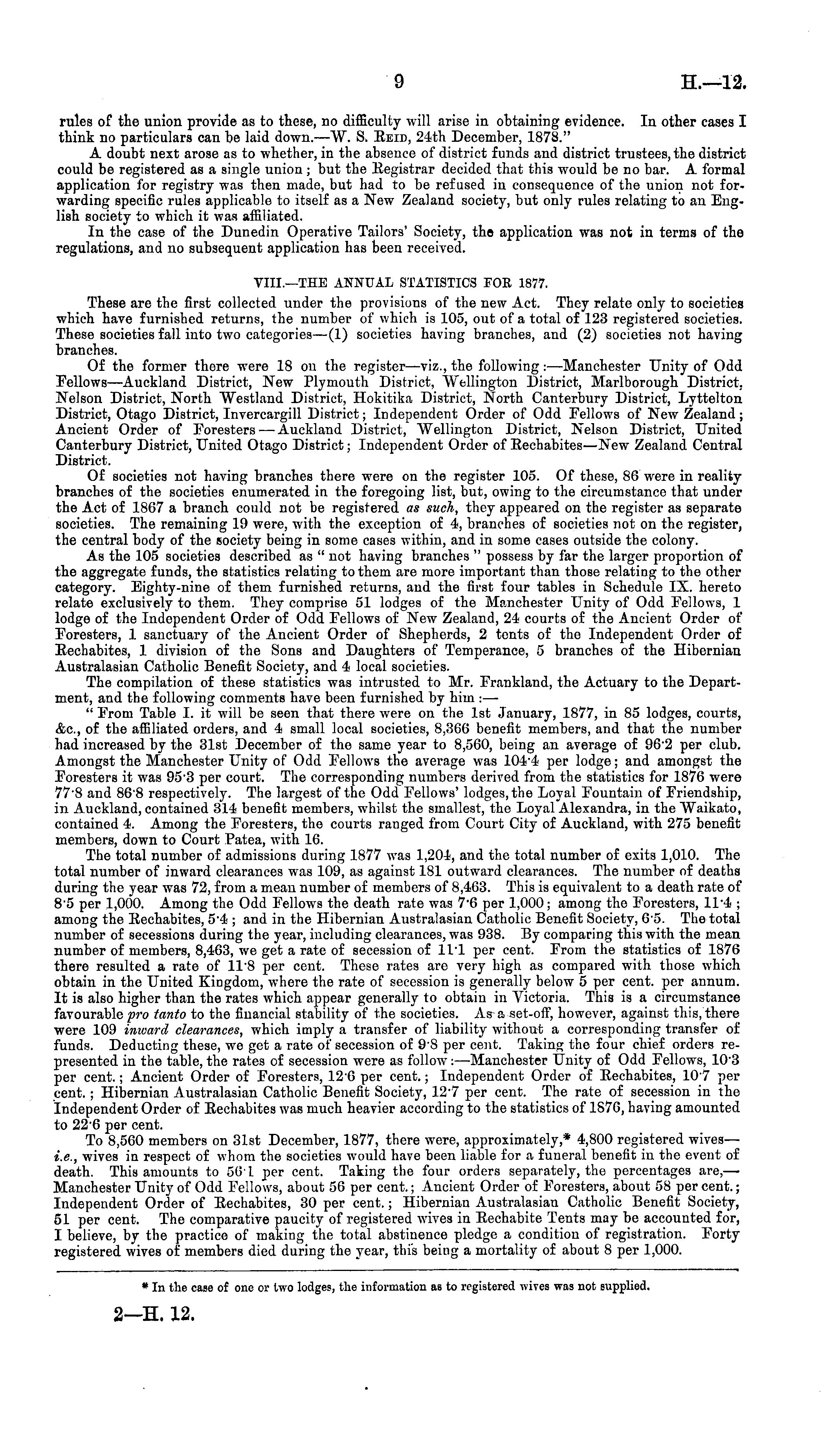 rules of the union provide as to these, no difficulty will arise in obtaining evidence. In other cases I think no particulars can be laid down. —W. S. Reid, 24th December, 1878." A doubt next arose as to whether, in the absence of district funds and district trustees, the district could be registered as a single union ; but the Registrar decided that this would be no bar. A formal application for registry was then made, but had to be refused in consequence of the union not forwarding specific rules applicable to itself as a New Zealand society, but only rules relating to an English society to which it was affiliated. In the case of the Dunedin Operative Tailors' Society, the application was not in terms of the regulations, and no subsequent application has been received. VIII.—THE ANNUAL STATISTICS FOR 1877. These are the first collected under the provisions of the new Act. They relate only to societies which have furnished returns, the number of which is 105, out ofa total of 123 registered societies. These societies fall into two categorics —(1) societies having branches, and (2) societies not having branches. Of the former there were 18 on the register —viz., the following: —Manchester Unity of Odd Fellows—Auckland District, New Plymouth District, Wellington District, Marlborough District, Nelson District, North Westland District, Hokitika District, North Canterbury District, Lyttelton District, Otago District, Invercargill District; Independent Order of Odd Fellows of New Zealand; Ancient Order of Foresters —Auckland District, Wellington District, Nelson District, United Canterbury District, United Otago District; Independent Order of Rechabites—New Zealand Central District. Of societies not having branches there were on the register 105. Of these, 86 were in reality branches of the societies enumerated in the foregoing list, but, owing to the circumstance that under the Act of 1867 a branch could not be registered as such, they appeared on the register as separate societies. The remaining 19 were, with the exception of 4, branches of societies not on the register, the central body of the society being in some cases within, and in some cases outside the colony. As the 105 societies described as " not having branches " possess by far the larger proportion of the aggregate funds, the statistics relating to them are more important than those relating to the other category. Eighty-nine of them furnished returns, and the first four tables in Schedule IX. hereto relate exclusively to them. They comprise 51 lodges of the Manchester Unity of Odd Fellows, 1 lodge of the Independent Order of Odd Fellows of New Zealand, 24 courts of the Ancient Order of Foresters, 1 sanctuary of the Ancient Order of Shepherds, 2 tents of the Independent Order of Rechabites, 1 division of the Sons and Daughters of Temperance, 5 branches of the Hibernian Australasian Catholic Benefit Society, and 4 local societies. The compilation of these statistics was intrusted to Mr. Frankland, the Actuary to the Department, and the following comments have been furnished by him : — " From Table I. it will be seen that there were on the Ist January, 1877, in 85 lodges, courts, &c, of the affiliated orders, and 4 small local societies, 8,366 benefit members, and that the number had increased by the 31st December of the same year to 8,560, being an average of 96"2 per club. Amongst the Manchester Unity of Odd Fellows the average was 104"4 per lodge; and amongst the Foresters it was 95"3 per court. The corresponding numbers derived from the statistics for 1876 were 77"8 and 868 respectively. The largest of the Odd Fellows' lodges, the Loyal Fountain of Friendship, in Auckland, contained 314 benefit members, whilst the smallest, the Loyal Alexandra, in the AVaikato, contained 4. Among the Foresters, the courts ranged from Court City of Auckland, with 275 benefit members, down to Court Patea, with 16. The total number of admissions during 1877 was 1,204, and the total number of exits 1,010. The total number of inward clearances was 109, as against 181 outward clearances. The number of deaths during the year was 72, from a mean number of members of 8,463. This is equivalent to a death rate of 8"5 per 1,000. Among the Odd Fellows the death rate was 7"6 per 1,000; among the Foresters, 114 ; among the Rechabites, 5"4 ; and in the Hibernian Australasian Catholic Benefit Society, 6"5. The total number of secessions during the year, including clearances, was 938. By comparing this with the mean number of members, 8,463, we get a rate of secession of 11"1 per cent. From the statistics of 1876 there resulted a rate of ITS per cent. These rates are very high as compared with those which obtain in the United Kingdom, where the rate of secession is generally below 5 per cent, per annum. It is also higher than the rates which appear generally to obtain in Victoria. This is a circumstance favourable pro tanto to the financial stability of the societies. As a set-off, however, against this, there were 109 inward clearances, which imply a transfer of liability without a corresponding transfer of funds. Deducting these, we get a rate of secession of 9"8 per cent. Taking the four chief orders represented in the table, the rates of secession were as follow: —Manchester Unity of Odd Fellows, 10"3 per cent.; Ancient Order of Foresters, 12"6 per cent.; Independent Order of Rechabites, 10"7 per cent.; Hibernian Australasian Catholic Benefit Society, 12*7 per cent. The rate of secession in the Independent Order of Rechabites was much heavier according to the statistics of 1876, having amounted to 22"6 per cent. To 8,560 members on 31st December, 1877, there were, approximately,* 4,800 registered wives— i.e., wives in respect of whom the societies would have been liable for a funeral benefit in the event of death. This amounts to 56" 1 per cent. Taking the four orders separately, the percentages are, — Manchester Unity of Odd Fellow