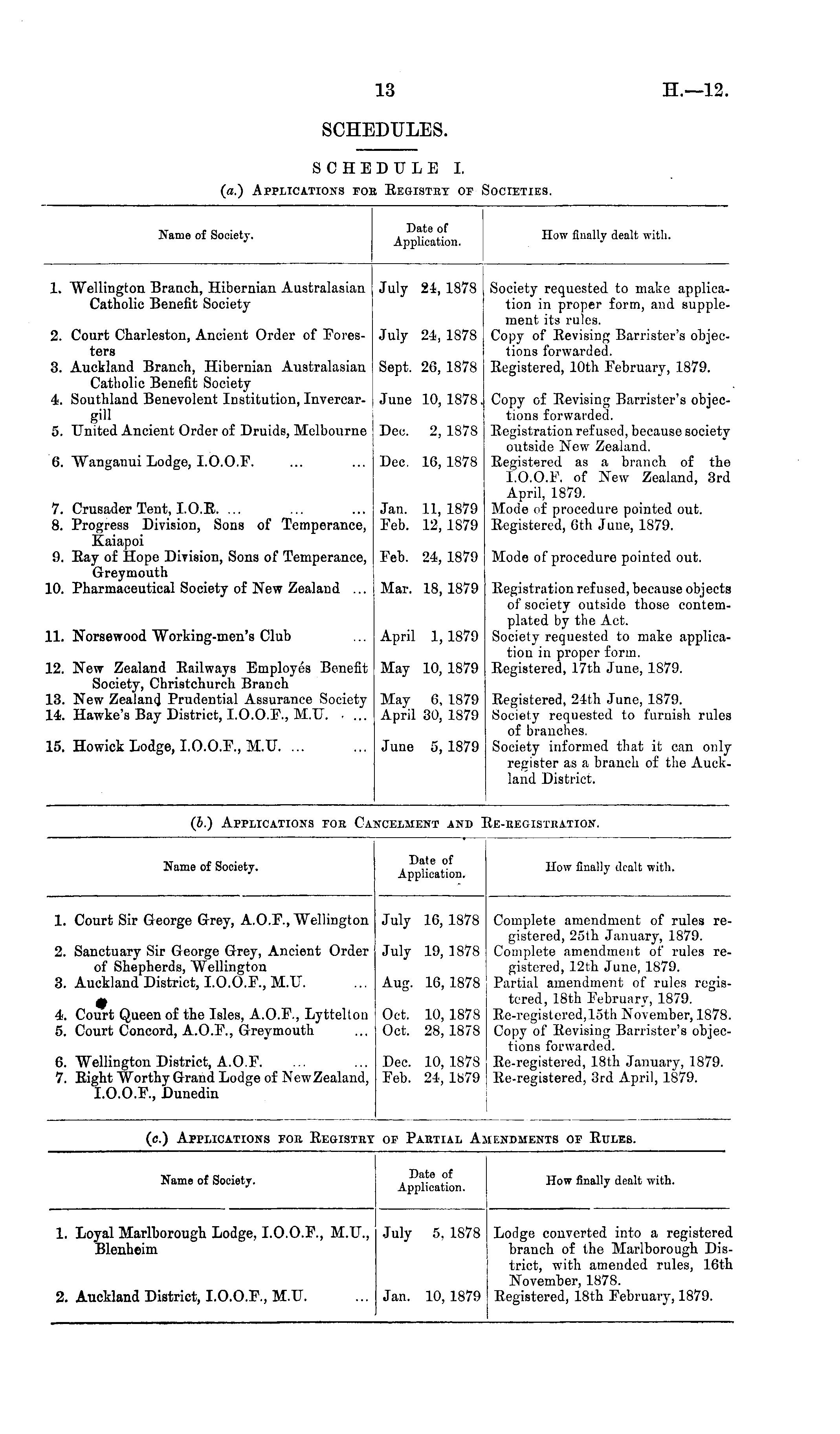 Name of Society. Date of Application. How finally dealt with. 1. Court Sir George Grey, A.O.F., Wellington July 16, 1878 Complete amendment of rules registered, 25th January, 1879. Complete amendment of rules registered, 12th June, 1879. Partial amendment of rules registered, 18th February, 1879. Re-registered, 15th November, 1878 Copy of Revising Barrister's objections forwarded. Re-registered, 18th January, 1879. Re-registered, 3rd April, 1879. 2. Sanctuary Sir George Grey, Ancient Order of Shepherds, Wellington 3. Auckland District, I.O.O.F., M.U. July 19,1878 Aug. 16, 1878 4. Court Queen of the Isles, A.O.F., Lyttelton 5. Court Concord, A.O.F., Greymouth Oct. 10, 1878 Oct. 28,1878 6. Wellington District, A.O.F. 7. Right Worthy Grand Lodge of NewZealand, I.O.O.F., Dunedin Dec. 10, 1878 Feb. 24, 1879