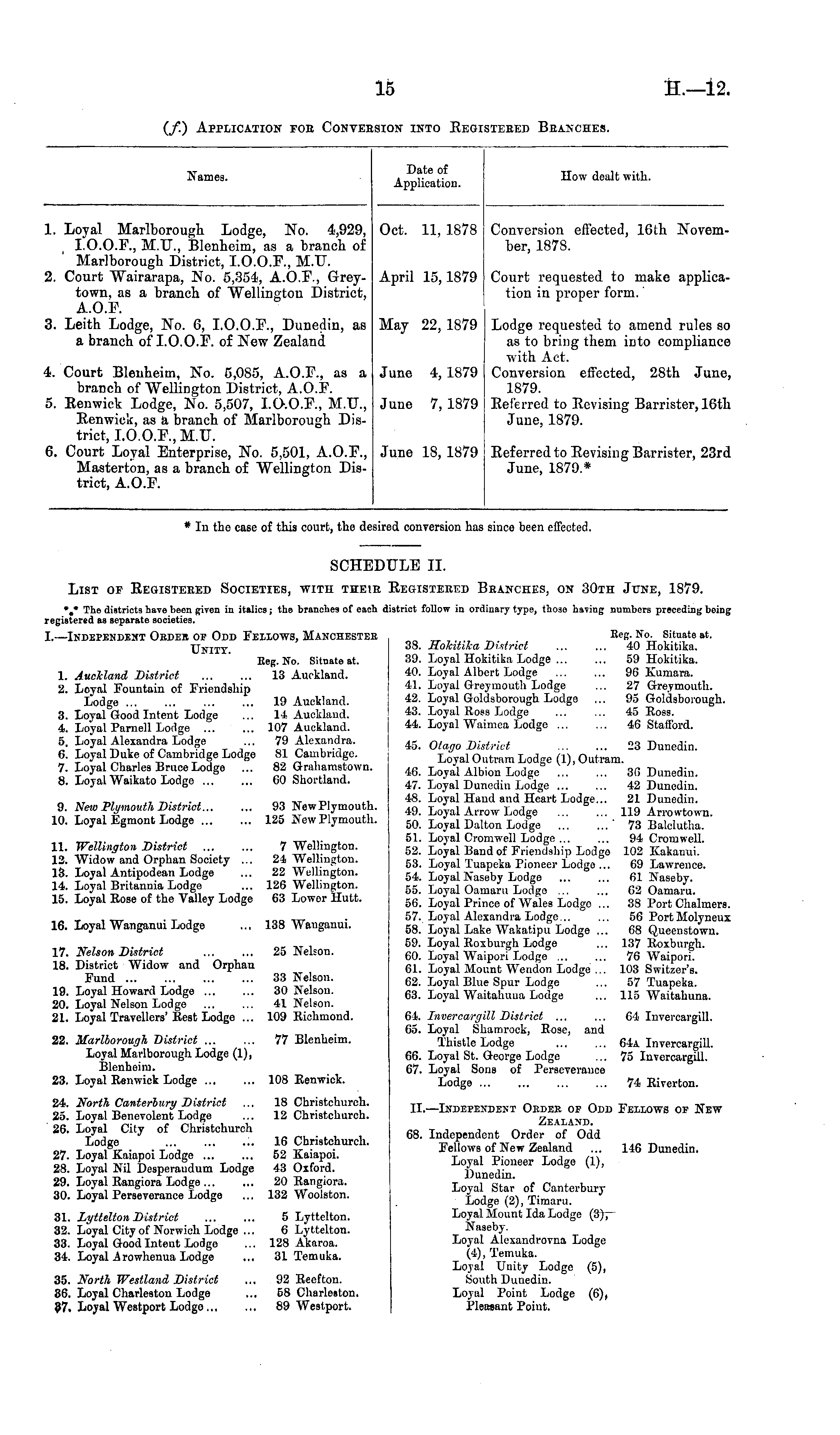 Names. Date of Application. How dealt with. .. Loyal Marlborough Lodge, No. 4,929, I.O.O.F., M.U., Blenheim, as a branch of Marlborough District, I.O.O.F., M.U. I. Court Wairarapa, No. 5,354, A.O.F., Greytown, as a branch of Wellington District, A.O.F. I. Leith Lodge, No. 6, I.O.O.F., Dunedin, as a branch of I.O.O.F. of New Zealand Oct. 11, 1878 Conversion effected, 16th November, 187S. April 15,1879 Court requested to make application in proper form. May 22, 1879 Lodge requested to amend rules so as to bring them into compliance with Act. Conversion effected, 28th June, 1879. Referred to Revising Barrister, 16th June, 1879. i. Court Blenheim, No. 5,085, A.O.F., as a branch of Wellington District, A.O.F. i. Renwick Lodge, No. 5,507, I.O.O.F., M.U., Renwick, as a branch of Marlborough District, I.O.O.F., M.U. i. Court Loyal Enterprise, No. 5,501, A.O.F., Masterton, as a branch of Wellington District, A.O.F. June 4, 1879 Juue 7, 1879 June 18, 1879 Referred to Revising Barrister, 23rd June, 1879.*