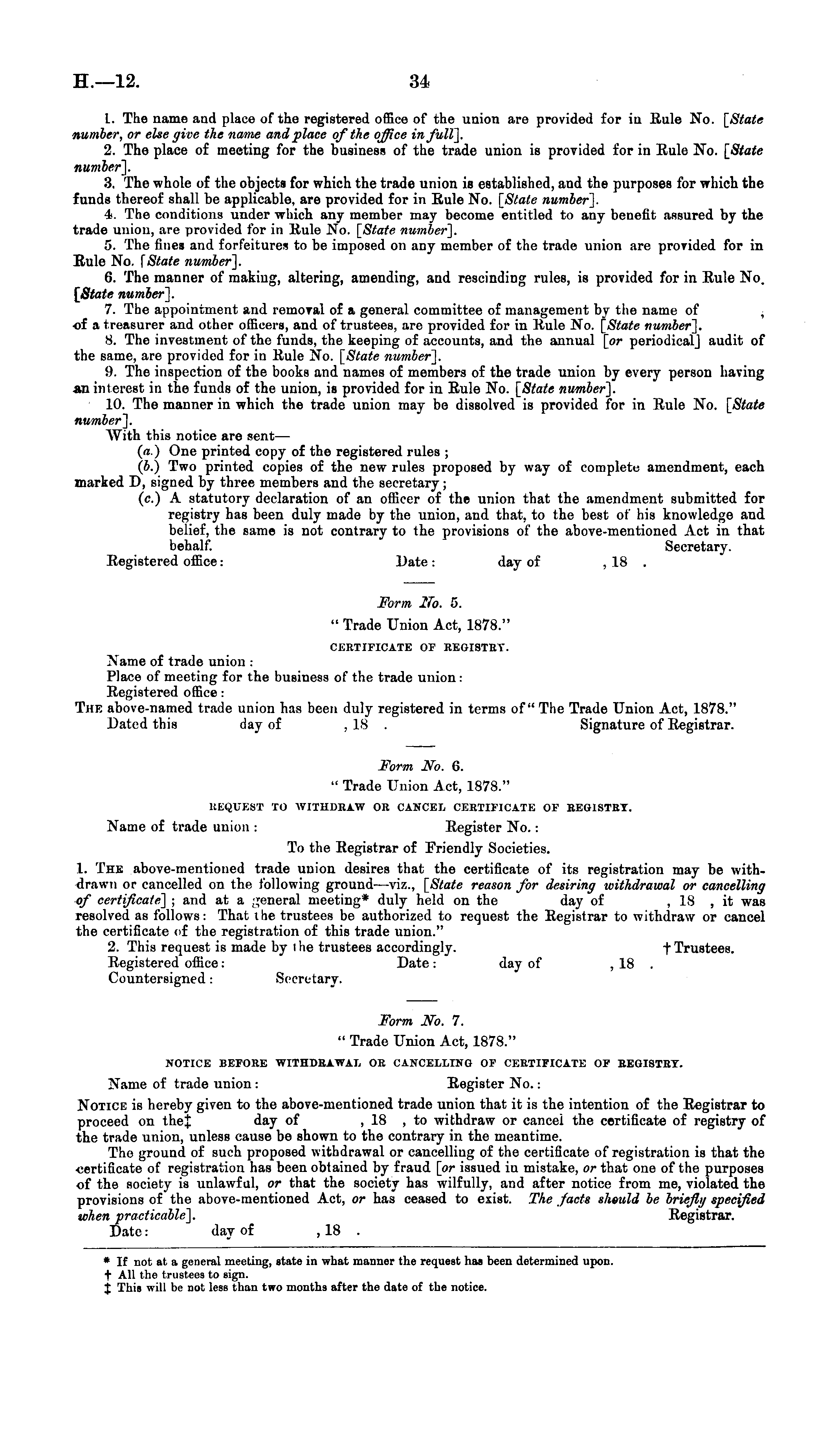 1. The name and place ofthe registered office of the union are provided for iv Rule No. [State number, or else give the name and place ofthe office in full]. 2. The place of meeting for the business of the trade union is provided for in Rule No. [State number]. 3. The whole of the objects for which the trade union is established, and the purposes for which the funds thereof shall be applicable, are provided for in Rule No. [State number]. 4. The conditions under which any member may become entitled to any benefit assured by the trade union, are provided for in Rule No. [State number]. 5. The fines and forfeitures to be imposed on any member of the trade union are provided for in Rule No. [State number]. 6. The manner of making, altering, amending, and rescinding rules, is provided for in Rule No. [State number]. 7. The appointment and removal of a general committee of management by the name of ■ of a treasurer and other officers, and of trustees, are provided for in Rule No. [State number], 8. The investment of the funds, the keeping of accounts, and the annual [or periodical] audit of the same, are provided for in Rule No. [State number]. 9. The inspection of the books and names of members of the trade union by every person having an interest in the funds of the union, is provided for in Rule No. [State number]. 10. The manner in which the trade union may be dissolved is provided for in Rule No. [State number]. With this notice are sent — (a.) One printed copy of the registered rules ; (b.) Two printed copies of the new rules proposed by way of complete amendment, each marked D, signed by three members and the secretary; (c.) A statutory declaration of an officer of the union that the amendment submitted for registry has been duly made by the union, and that, to the best of his knowledge and belief, the same is not contrary to the provisions of the above-mentioned Act in that behalf. Secretary. Registered office: Date: day of ,18 . Form No. 5. " Trade Union Act, 1878." CERTIFICATE OF REGISTRY. Name of trade union : Place of meeting for the business of the trade union : Registered office: The above-named trade union has been duly registered in terms of" The Trade Union Act, 1878." Dated this day of , IS . Signature of Registrar. Form No. (j. " Trade Union Act, 1878." REQUEST TO WITHDRAW OR CANCEL CERTIFICATE OF REGISTRY. Name of trade union : Register No. : To the Registrar of Friendly Societies. I. The above-mentioned trade union desires that the certificate of its registration may be withdrawn or cancelled on the following ground—viz., [State reason for desiring withdrawal or cancelling of certificate] ; and at a general meeting* duly held on the day of , IS , it was resolved as follows: That the trustees be authorized to request the Registrar to withdraw or cancel the certificate of the registration of this trade union." 2. This request is made by I he trustees accordingly. f Trustees. Registered office: Date: day of , 18 . Countersigned: Secretary. Form No. 7. " Trade Union Act, 1878." NOTICE BEFORE WITHDRAWAL OR CANCELLING OF CERTIFICATE OF REGISTRY. Name of trade union : Register No.: Notice is hereby given to the above-mentioned trade union that it is the intention of the Registrar to proceed on thej day of ,18 ,to withdraw or cancel the certificate of registry of the trade union, unless cause be shown to the contrary in the meantime. Tho ground of such proposed withdrawal or cancelling of the certificate of registration is that the certificate of registration has been obtained by fraud [or issued iv mistake, or that one of the purposes of the society is unlawful, or that the society has wilfully, and after notice from me, violated the provisions of the above-mentioned Act, or has ceased to exist. The facts should be briefly specified when practicable]. Registrar. Date: day of , 18 .
