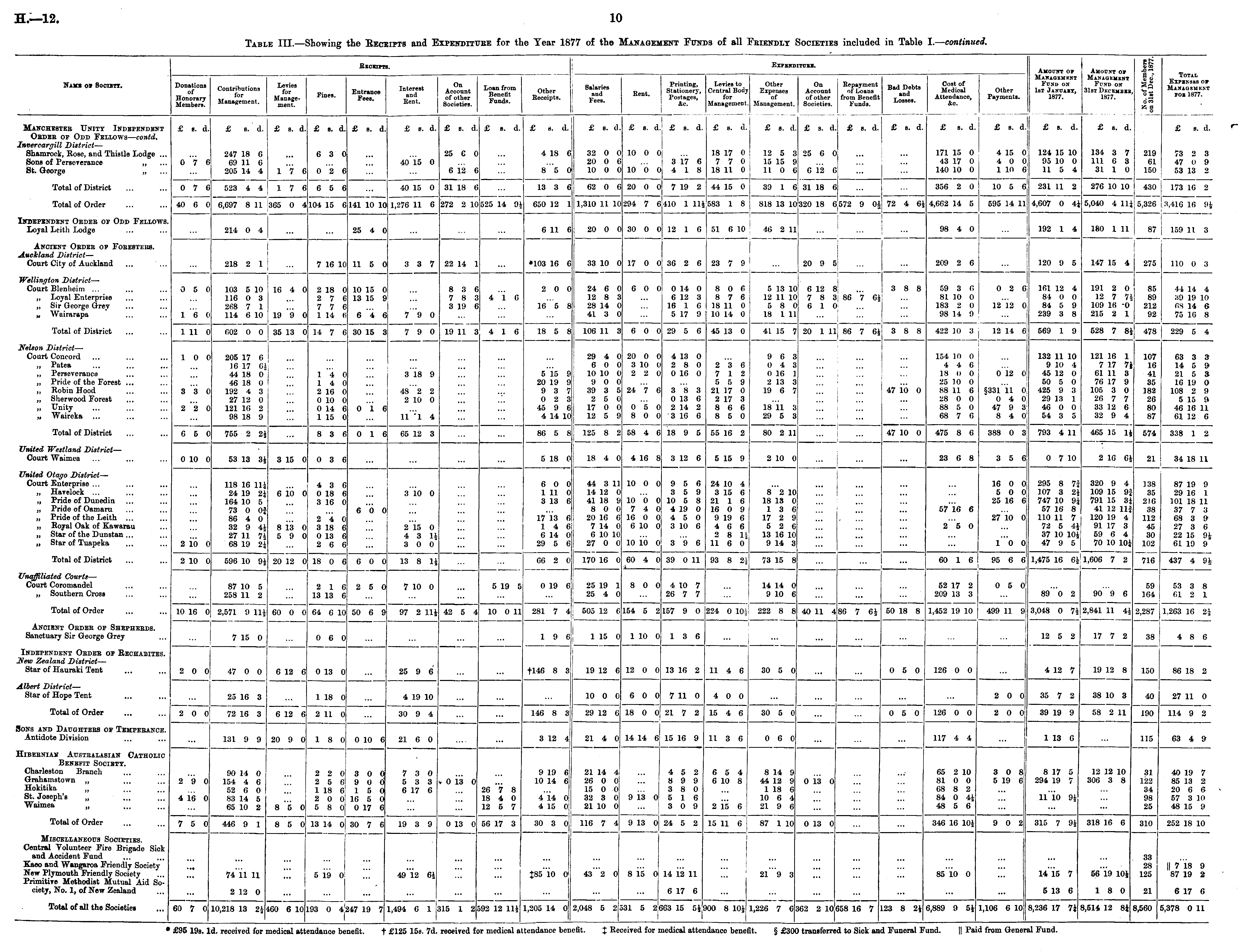 Table III. —Showing the Receipts and Expenditure for the Tear 1877 of the Management Funds of all Friendly Societies included in Table I. — continued. Namb 01 Society. Donations of Honorary Members. Levies for Management. Fines. Entrance Fees. Kkchpts. Interest and Kent. Account Loa°fr»™ Other Receipts. Salaries and Fees. Kent. Printing, Stationery, Postages, &c. Levies to Central Body for Management. Other Expenses of Management. F-xpend] :cre. On Account of other Societies. Repayment of Loans from Benefit Funds. Bad Debts £&* LoTes. Attendance, Other Payments. Amount op Managkmknt Fund on 1st Januaet, 1877. Amount of Managkmhnt Funs on 31st Dkckmbhb, 1S77. Total kxpbsshs op MaNAUKMI .NT FOB 1877. Contributions for Management. Manchester Unity Independent Oeder of Odd Fellows — contd. Inverrargill District — Shamrock, Kose, and Thistle Lodge ... Sons of Perseverance „ St. George £ a. d. £ s. d. £ s. d. £ s. d. £ s. d. £ s. d. £ b. d. £ 8. d. £ s. d. £ s. d. £ s. d. £ s. d. £ s. d. £ s. d. £ s. d. £ s. d. £ s. d. £ s. d. £ s. a. £ s. d. £ a. d. £ s. d. 0 "i 6 247 18 6 69 11 6 205 14 4 6 3 0 40 15 0 25 C oj 4 18 6 32 0 0 20 0 6 10 0 0 10 0 0, 3 17 6 4 18 18 17 0 7 7 0 18 11 0 12 5 3 15 15 9 11 0 6 25 6 0 171 15 0 43 17 0 140 10 0 4 15 0 4 0 0 1 10 6 124 15 10 95 10 0 11 5 4 134 3 7 111 6 3 31 1 0 219 61 150 73 2 3 47 (> 9 53 13 2 1 7 6 0 2 6 6 12 6 8 5 0 I 10 0 0 C 12 0 Total of District 0 7 6 523 4 4 17 6 6 5 6 40 15 0 31 18 6 13 3 6 62 0 20 0 0 7 19 2 44 15 0 39 1 6 31 18 6 356 2 0 10 5 6 231 11 2 276 10 10 430 173 16 2 Total of Order 40 6 0 6,697 8 11 365 0 4 104 15 6 141 10 10 1,276 11 6 272 2 10 525 14 9} 650 12 1 1,310 11 1 294 7 6 410 1 111 583 1 8 818 13 10 320 18 6 | 572 9 0J 72 4 6J 4,662 14 5 595 14 11 4,607 0 * 5,040 4 Hi 5,326 .8,416 16 84 Independent Obdeb op Odd Fellows. Lojal Leith Lodge 1 51 6 10 46 2 11 98 4 0 ! 192 1 4 180 1 11 87 159 11 3 214 0 4 25 4 0 6 11 6 20 0 0 30 0 0 12 1 6 Ancient Oedse op Fobesteks. Auckland District — Court City of Auckland j 209 2 6 218 2 1 7 16 10 11 5 0 3 3 7 22 14 1 *103 16 6 33 10 0 17 0 0 36 2 6 23 7 9 20 9 5 120 9 5 147 15 4 275 110 0 3 Wellington District — Court Blenheim ... „ Loyal Enterprise „ Sir George Grey „ Wairarapa . ! 0 5 0 103 5 10 116 0 3 2fi8 7 1 114 6 10 16 4 0 2 18 0 2 7 6 7 7 6 1 14 fi 10 15 0 13 15 9 8 3 6 7 8 3 3 19 6 4 "i 6 2 0 0 16 5 8 2-1 6 0 12 8 3 28 14 0 41 3 0 6 0 Oi 0 14 0 6 12 3 16 1 6 5 17 9 son 8 7 6 18 11 0 10 14 0 5 13 10 12 11 10 5 8 0 18 1 11 6 12 8 7 8 3 6 10 86 *7 6i 3 8 8 59 3 0 81 10 0 183 2 0 98 14 9 ' 0 2 0 12 12 0 lfil 12 4 81 O 0 84 5 9 239 3 8 191 2 0 12 7 1\ 109 16 0 215 2 1 85 89 212 92 4t 14 4 HO 19 10 6S 14 6 75 16 8 1 6 0 19 *9 0 6 4 6 7 9 0 Total of District ... 1 11 0 602 0 0 35 13 0 14 7 6 30 15 3 7 9 0 19 11 3 4 16 18 5 8 106 11 3 6 0 0 29 5 6 45 13 0 41 15 7 20 1 11 86 7 6i 3 8 8 422 10 3 12 14 6 569 1 9 528 7 8i 478 229 5 4 Nelson District — Court Concord „ Patea „ Perseverance „ Pride of the Forest ... ,, Robin Hood „ Sherwood Forest „ Unity „ Waireka 10 0 3 3 0 205 17 6 16 17 <>1 44 18 0 46 18 0 192 4 3 27 12 0 121 l(i 2 98 18 9 14 0 14 0 2 16 0 0 10 0 0 14 6 1 15 0 3 18 9 48 "2 2 2 10 0 5 15 9 20 19 9 9 3 7 0 2 3 45 9 6 4 14 10 29 4 0 6 0 0 10 10 0 9 0 0 39 3 5 2 5 0 17 0 0 12 5 9 20 0 0 3 10 0 2 2 0 24 *7 6 4 13 0 2 8 0 0 16 0 3 8 3 0 13 6 2 14 2 3 16 6 2 3 6 7 12 5 5 9 21 17 0 2 17 3 8 6 6 8 5 0 9 6 3 0 4 3 0 16 1 2 13 3 19 6 7 47 10 0 154 10 0 4 4 6 18 U 0 25 10 0 88 11 6 0 0 88 5 0 68 7 6 0 12 0 §331 11 0 0 4 0 47 9 3 8 4 0 132 11 10 9 10 4 45 12 0 50 5 0 425 9 S 29 IS 1 46 0 0 54 3 5 121 16 1 7 17 7i 61 11 3 76 17 9 105 3 0 26 7 7 33 12 6 32 9 4 107 16 41 35 182 26 80 87 63 3 3 14 5 9 21 5 3 16 19 0 108 2 9 5 15 9. 46 16 11 61 12 6 2 "i 0 0 1 6 11 1 4 0 5 0 8 0 0 18 11 3 29 5 3 ... Total of District 6 5 0 755 2 2\ 8 3 6 0 16! 65 12 3 86 5 8 125 8 2 58 4 6 18 9 5 55 16 2 80 2 11 47 10 0 475 8 6 388 0 3 793 4 11 465 15 li 574 338 1 a United Westland District— Court Waimea 53 13 3J 2 16 8} 0 10 0 3 15 0 0 3 6 5 18 0 18 4 0 4 16 8 3 12 6 5 15 9 2 10 Oi 23 6 8 3 5 6 0 7 10 '1\ 34 18 11 United Otago District — Court Enterprise ... ,, Havelock ... „ Pride of Dunedin „ Pride of Oamaru „ Pride of the Leith ... „ Eoyal Oak of Kawarau „ Star of the Dunstan ... „ Star of Tuapeka 118 16 113 24 19 2i| 164 10 5 73 0 0J 86 4 0 32 9 4! 27 11 H 68 19 2\ 6 10 0 4 3 6 0 18 6 3 16 0 2 4 0 3 18 6 0 13 6 2 6 6 6 6 3 "io 0 6 0 0 1 11 0 3 13 6 17 13 6 14 6 6 14 0 29 5 6 44 3 11 14 12 0 41 18 9 8 0 0 20 16 6 7 14 0 6 10 10 27 0 0 10 0 0 10 0 0 7 4 0 16 0 0 6 10 0 9 5 6 3 5 9 10 5 8 4 19 0 4 5 0 3 10 6 24 10 4 3 15 6 21 1 6 16 0 9 9 19 6 4 6 6 2 8 U 11 6 0 I 8 2 10 18 13 0 13 6 17 2 9 5 2 6 13 16 10 9 14 3 57 16 6 16 0 0 5 0 0 25 16 6 27 10 0 295 8 7j 107 3 2£ 747 10 9i 57 16 8 110 11 7 I 72 5 4jl 37 10 10i 47 9 5 320 9 4 109 15 9} 791 15 3i 41 12 11J 120 19 4 91 17 3 59 6 4 70 10 10i 138 35 216 38 112 45 30 102 87 19 9 29 16 1 101 18 11 37 7 3 68 3 9 27 3 6 22 15 9* 61 19 9 8 13 0 5 9 0 2 15 0 4 3 1] 3 0 0" 2 5 0 2 10 0 10 10 0 3 9 6 10 0 Total of District 2 10 0 596 10 9J 20 12 0 18 0 6 6 0 0 13 8 1-J 66 2 0 170 16 0 60 4 0 39 0 11 93 8 2| 73 15 8 60 1 6 95 6 6 1,475 16 6}! 1,606 7 2 716 437 4 91 Unaffiliated Courts — Court Coromandel „ Southern Cross 87 10 5 258 11 2 2 16 13 13 6 2 5 7 10 0 5 19 5 0 19 6 25 19 1 25 4 0 8 0 0 4 10 7 26 7 7 14 14 0 9 10 6 52 17 2 209 13 3 0 5 0 59 164 53 3 8 (il 2 1 89 0 2 90 9 6 Total of Order 10 16 0 2,571 9 11J 60 0 0 64 G 10 50 6 9 97 2 11* 42 5 10 0 11 281 7 4 505 12 6 154 5 2 157 9 0 224 0 lOi 222 8 8 40 11 4 86 7 6J 50 18 8 1,452 19 10 499 11 9 3,048 0 7i 2,841 11 4£ 2,287 1,263 16 2i Ancient Order op Shepherds. Sanctuary Sir George Grey 7 15 0 0 6 0 1 19 6 1 15 1 10 0 1 3 6 12 5 2 17 7 2 38 4 8 6 Independent Oeder op Kechabites. JHew Zealand District — Star of Hauraki Tent 2 0 0 47 0 0 6 12 6 0 13 0 25 9 6 tl46 8 3 19 12 6 12 0 0 13 16 2 11 4 6 30 5 0 0 5 0 126 0 0 4 12 7 19