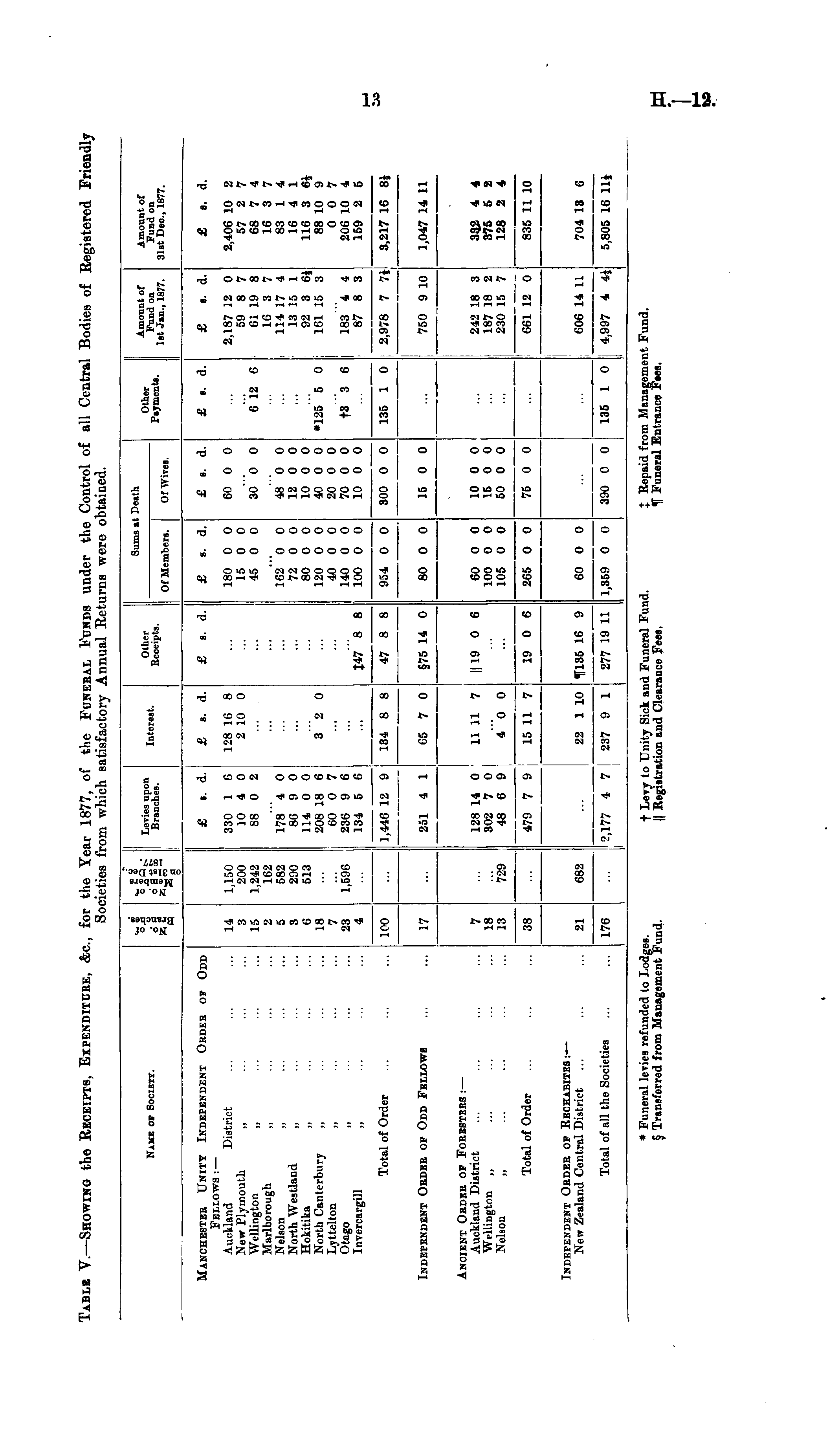 TABLE V.—SHOWING the RECEIPTS, EXPENDITURE, &c, for the Year 1877, of the FUNERAL FUNDS under the Control of all Central Bodies of Registered Friendly