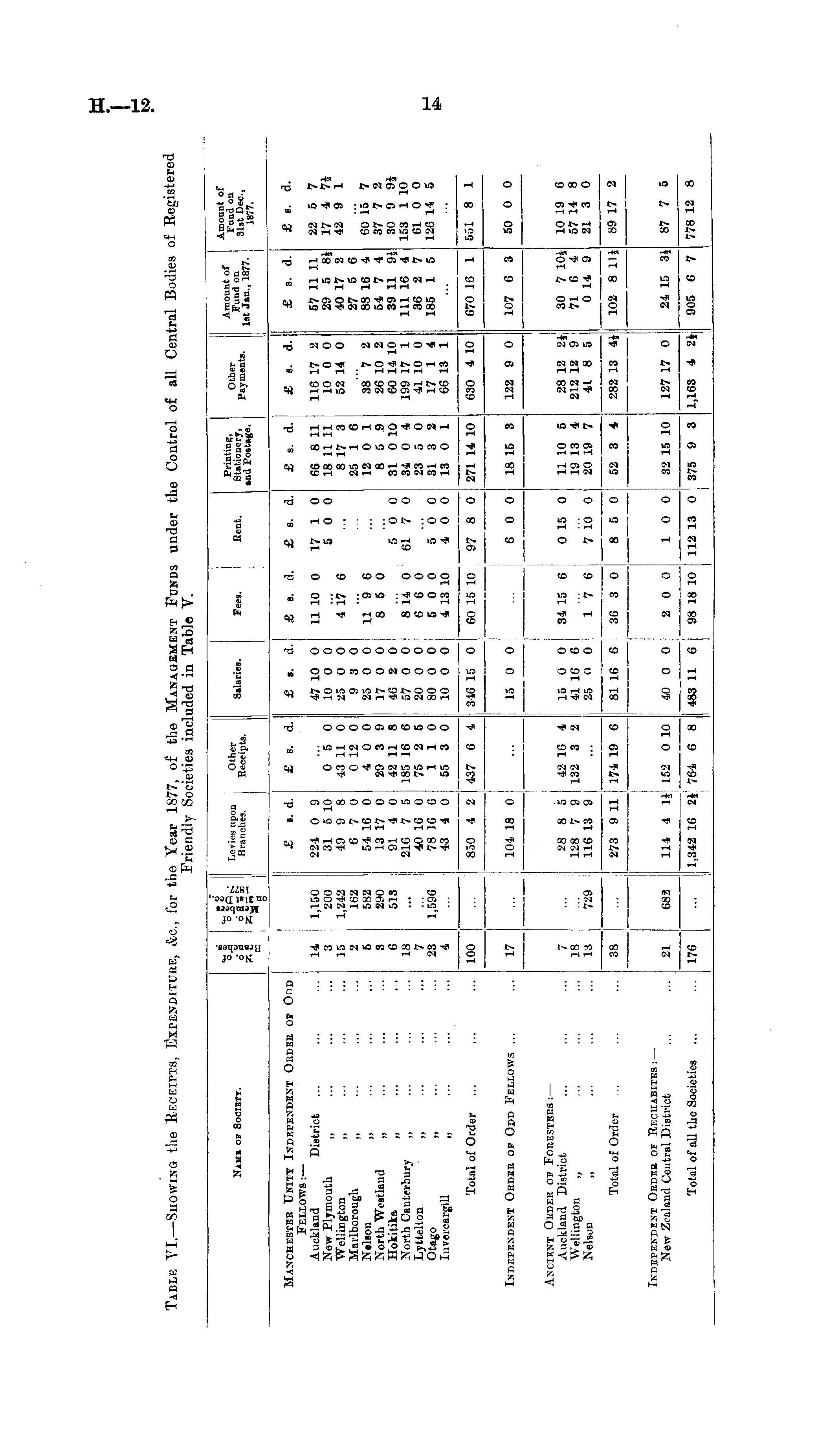 TABLE VI.—SHOWING the RECEIPTS, EXPENDITURE, etc., for the Year 1877, of the MANAGEMENT FUNDS under the Control of all Central Bodies of Registered