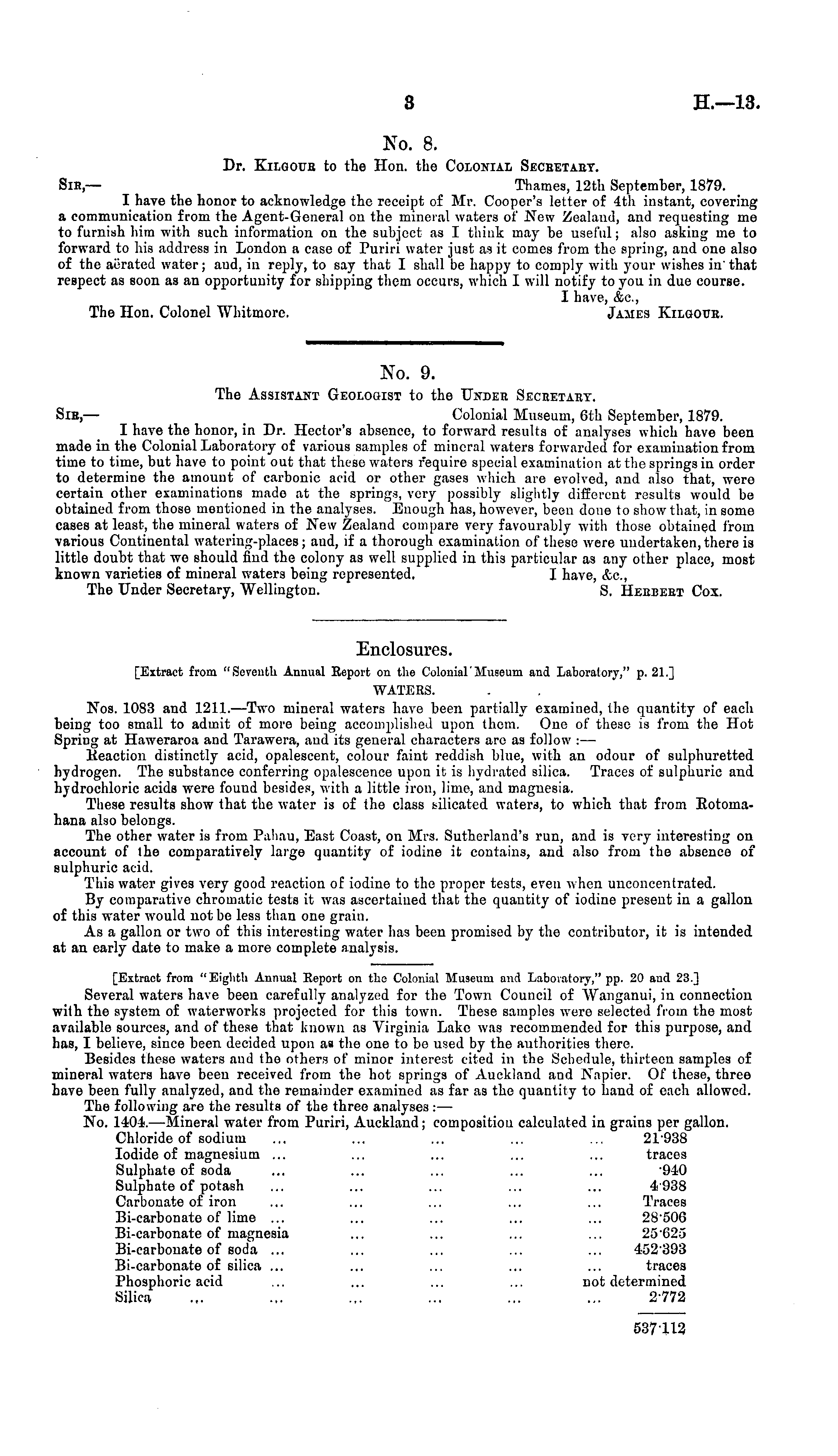 No. 8. Dr. Kilgour to the Hon. the Colonial Seceetaey. Sir,— Thames, 12th September, 1879. I have the honor to acknowledge the receipt of Mr. Cooper's letter of 4th instant, covering a communication from the Agent-General on the mineral waters of New Zealand, and requesting me to furnish him with such information on the subject as I think may be useful; also asking me to forward to his address in London a case of Puriri water just as it comes from the spring, and one also of the aerated water; aud, in reply, to say that I shall be happy to comply with your wishes in'that respect as soon as an opportunity for shipping them occurs, which I will notify to you in due course. I have, &c, The Hon. Colonel Whitmore. James Kilgoue.