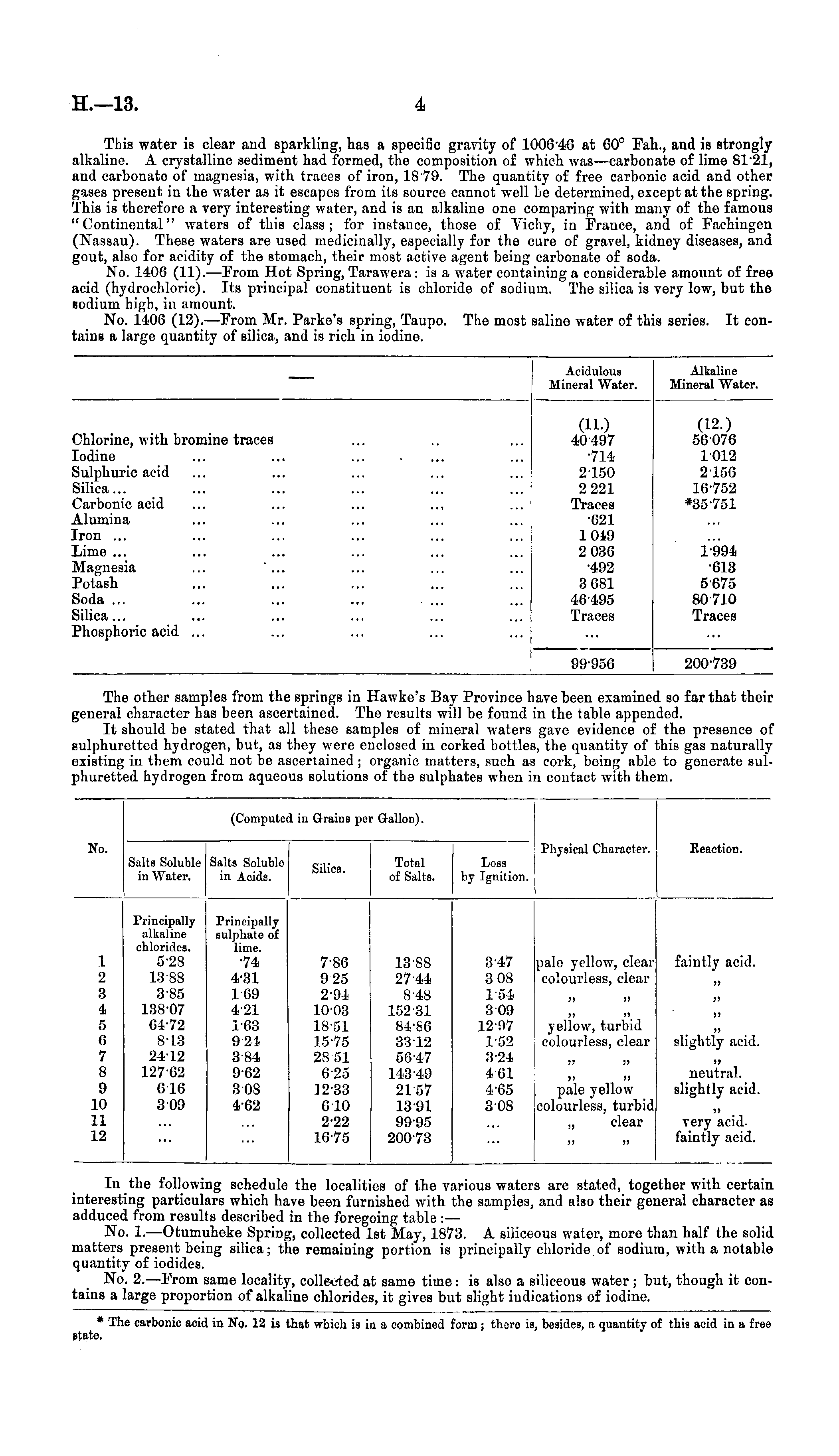 In the following schedule the localities of the various waters are stated, together with certain interesting particulars which have been furnished with the samples, and also their general character as adduced from results described in the foregoing table :— No. I.—Otumuheke Spring, collected Ist May, 1873. A siliceous water, more than half the solid matters present being silica; the remaining portion is principally chloride of sodium, with a notable quantity of iodides. No. 2. —Prom same locality, collected at same time: is also a siliceous water ; but, though it contains a large proportion of alkaline chlorides, it gives but slight indications of iodine. * The carbonic acid in No. 12 is that which is ia a combined form; there is, besides, a quantity of this acid ia a free state.