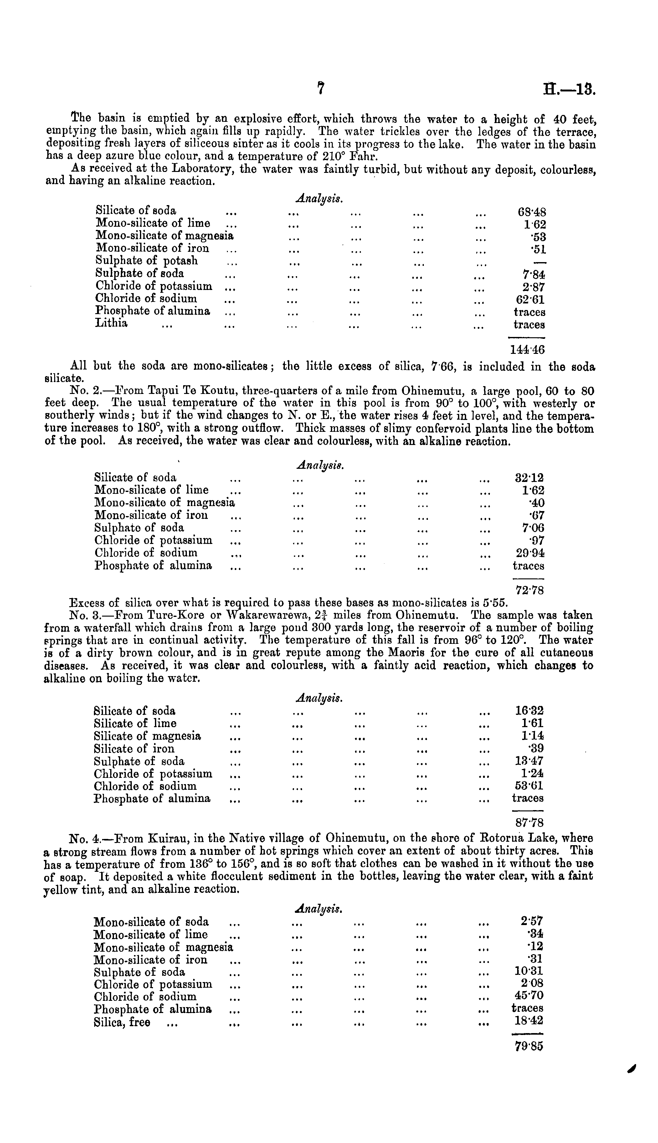 The basin is emptied by an explosive effort, which throws the water to a height of 40 feet, emptying the basin, which again fills up rapidly. The water trickles over the ledges of the terrace, depositing fresh layers of siliceous sinter as it cools in its progress to the lake. The water in the basin has a deep azure blue colour, and a temperature of 210° Fahr. As received at the Laboratory, the water was faintly turbid, but without any deposit, colourless, and having an alkaline reaction. Analysis. Silicate of soda ... ... ... ... ... 6848 Mono-silicate of lime ... ... ... ... ... 162 Mono-silicate of magnesia ... ... ... ... -53 Mono-silicate of iron ... ... ... ... ... -51 Sulphate of potash ... ... ... ... ... — Sulphate of soda ... ... ... ... ... 7-84 Chloride of potassium ... ... ... ... ... 287 Chloride of sodium ... ... ... ... ... 6261 Phosphate of alumina ... ... ... ... ... traces Lithia ... ... ... ... ... ... traces 144 46 All but the soda are mono-silicates; the little excess of silica, 7 66, is included in the soda silicate. No. 2.—From Tapui Te Koutu, three-quarters of a mile from Ohinemutu, a large pool, 60 to 80 feet deep. Tho usual temperature of the water in this pool is from 90° to 100°, with westerly or southerly winds; but if the wind changes to N. or E., the water rises 4 feet in level, and the temperature increases to 180°, with a strong outflow. Thick masses of slimy confervoid plants line the bottom of the pool. As received, the water was clear and colourless, with an alkaline reaction. Analysis. Silicate of soda ... ... ... ... ... 32L2 Mono-silicate of lime ... ... ... ... ... 1-62 Mono-silicate of magnesia ... ... ... ... '40 Mono-silicate of iron ... ... ... ... ... "67 Sulphate of soda ... ... ... ... ... 706 Chloride of potassium ... ... ... ... ... -97 Chloride of sodium ... ... ... ... ... 2994 Phosphate of alumina ... ... ... ... ... traces 72-78 Excess of silica over what is required to pass these bases as mono-silicates is 555. No. 3. —Erom Ture-Kore or AVakarewarewa, 2f miles from Ohinemutu. The sample was taken from a waterfall which drains from a large pond 300 yards long, the reservoir of a number of boiling springs that are in continual activity. The temperature of this fall is from 96° to 120°. The water is of a dirty brown colour, and is in great repute among the Maoris for the cure of all cutaneous diseases. As received, it was clear and colourless, with a faintly acid reaction, which changes to alkaline on boiling the water. Analysis. Silicate of soda ... ... ... ... ... 1632 Silicate of lime ... ... ... ... ... I*6l Silicate of magnesia ... ... ... ... ... I'l4 Silicate of iron ... ... ... ... ... "39 Sulphate of soda ... ... ... ... ... 13-47 Chloride of potassium ... ... ... ... ... 124 Chloride of sodium ... ... ... ... ... 5361 Phosphate of alumina ... ... ... ... ... traces 87-78 No. 4. —From Kuirau, in the Native village of Ohinemutu, on the shore of Rotorua Lake, where a strong stream flows from a number of hot springs which cover an extent of about thirty acres. This has a temperature of from 136° to 156°, and is so soft that clothes can be washed in it without the use of soap. It deposited a white flocculent sediment in the bottles, leaving the water clear, with a faint yellow tint, and an alkaline reaction. Analysis. Mono-silicate of soda ... ... ... ... ... 257 Mono-silicate of lime ... ... ... ... ... '34 Mono-silicate of magnesia ... ... ... ... "12 Mono-silicate of iron ... ... ... ... ... '31 Sulphate of soda ... ... ... ... ... 10-31 Chloride of potassium ... ... ... ... ... 208 Chloride of sodium ... ... ... ... ... 45-70 Phosphate of alumina ... ... ... ... ... traces Silica, free ... ... ... ... ... ... 1842 7985