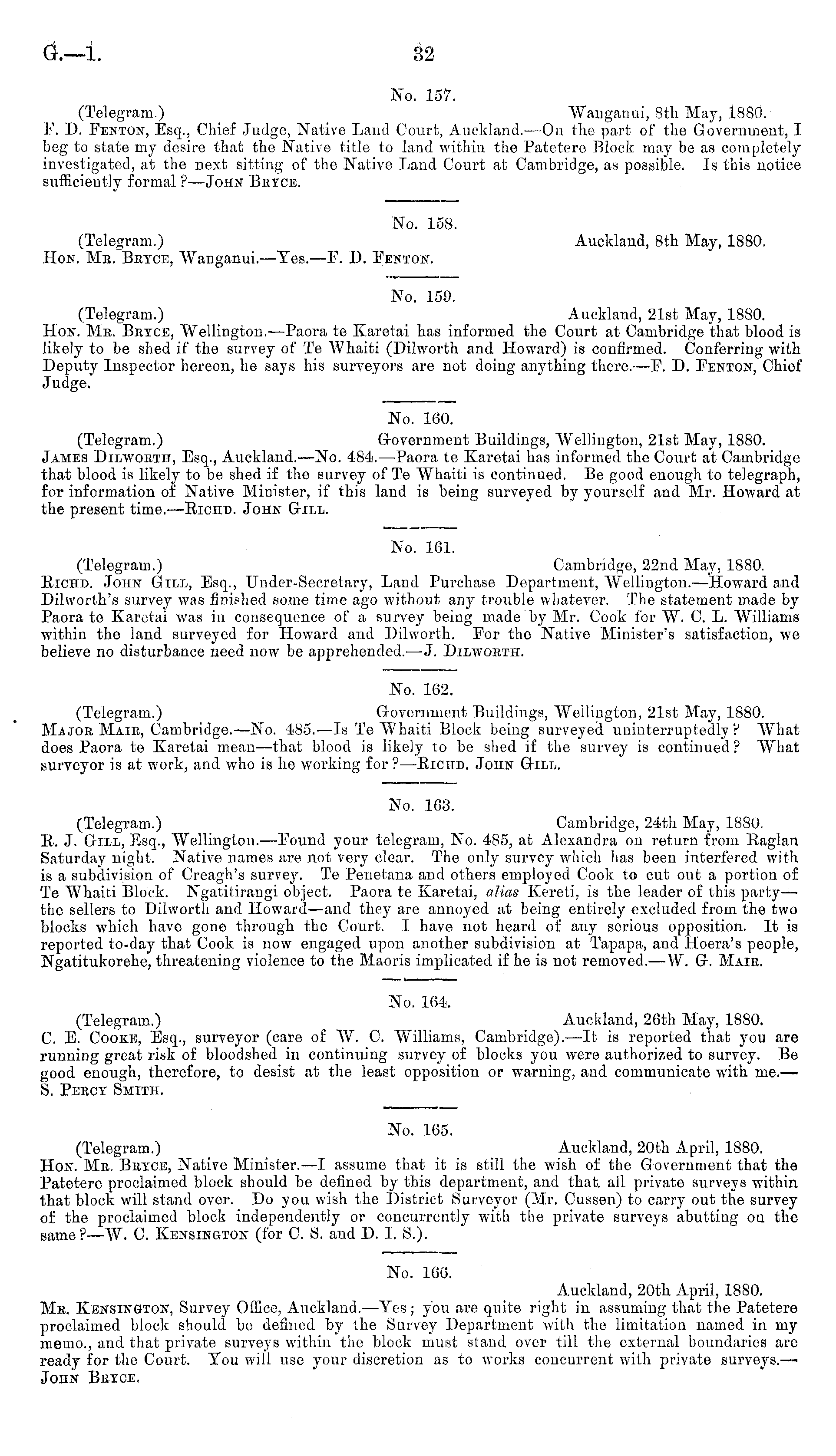 (Telegram.) Wanganui, Bth May, 1880. P. D. Fen ton, Esq., Chief Judge, Native Land Court, Auckland. —On the part of the Government, I beg to state my desire that the Native title to land within the Patetere Block may be as completely investigated, at the next sitting of the Native Land Court at Cambridge, as possible. Is this notice sufficiently formal ? —John Bbyce. No. 158. (Telegram.) Auckland, Bth May, 1880. Hon. Mb. Bbyce, Wanganui.—Tes. —F. D. Eenton. No. 159. (Telegram.) Auckland, 21st May, 1880. Hon. Me. Bryce, Wellington. —Paora te Karetai has informed the Court at Cambridge that blood is likely to be shed if the survey of Te "Whaiti (Dilworth and Howard) is confirmed. Conferring with Deputy Inspector hereon, he says his surveyors are not doing anything there. —P. D. Penton, Chief Judge. No. 160. (Telegram.) Government Buildings, Wellington, 21st May, 1880. James Dilwobtit, Esq., Auckland.—No. 484.—Paora te Karetai has informed the Court at Cambridge that blood is likely to be shed if the survey of Te Whaiti is continued. Be good enough to telegraph, for information of Native Minister, if this land is being surveyed by yourself and Mr. Howard at the present time. —Eichb. John Gill. No. 161. (Telegram.) Cambridge, 22nd May, 1880. Kichd. John Gill, Esq., Under-Secretary, Land Purchase Department, Wellington.—Howard: and Dilworth's survey was finished some time ago without any trouble whatever. The statement made by Paora te Karetai was in consequence of a survey being made by Mr. Cook for W. C. L. Williams within the land surveyed for Howard and Dilworth. Por the Native Minister's satisfaction, we believe no disturbance need now be apprehended.' —J. Dilwobth. No. 162. (Telegram.) Government Buildings, Wellington, 21st May, 1880. Major Maie, Cambridge.—No. 485.—1s Te Whaiti Block being surveyed uninterruptedly '** What does Paora te Karetai mean —that blood is likely to be shed if the survey is continued? What surveyor is at work, and who is he working for ? —Eiciid. John Gill. No. 163. (Telegram.) Cambridge, 24th May, 1880. E. J. Gill, Esq., Wellington. —Pound your telegram, No. 485, at Alexandra on return from Eaglan Saturday night. Native names are not very clear. The only survey which has been interfered with is a subdivision of Creagh's surve}^. Te Penetana and others employed Cook to cut out a portion of Te Whaiti Block. Ngatitirangi object. Paora te Karetai, alias Kereti, is the leader of this party — the sellers to Dilworth and Howard —and they are annoyed at being entirely excluded from the two blocks which have gone through the Court. I have not heard of any serious opposition. It is reported to-day that Cook is now engaged upon another subdivision at Tapapa, and Hoera's people, Ngatitukorehe, threatening violence to the Maoris implicated if he is not removed. —W. G. Maie. No. 164. (Telegram.) Auckland, 26th May, 1880. C. E. Cooke, Esq., surveyor (care of W. C. Williams, Cambridge).—-It is reported that you are running great risk of bloodshed in continuing survey of blocks you were authorized to survey. Be good enough, therefore, to desist at the least opposition or warning, and communicate with me.— S. Peect Smith. No. 165. (Telegram.) Auckland, 20th April, 1880. Hon. Mb. Bbyce, Native Minister. —I assume that it is still the wish of the Government that the Patetere proclaimed block should be defined by this department, and that, all private surveys within that block will stand over. Do you wish the District Surveyor (Mr. Cussen) to carry out the survey of the proclaimed block independently or concurrently with the private surveys abutting on the same? —W. C. Kensington* (for C. S. and D. I. S.). No. 166. Auckland, 20th April, 1880. Mb. Kensington, Survey Office, Auckland. —Yes; you are quite right in assuming that the Patetere proclaimed block should be defined by the Survey Department with the limitation named in my memo., and that private surveys within the block must stand over till the external boundaries are ready for the Court. You will use your discretion as to works concurrent with private surveys. —■ John Bbyce,