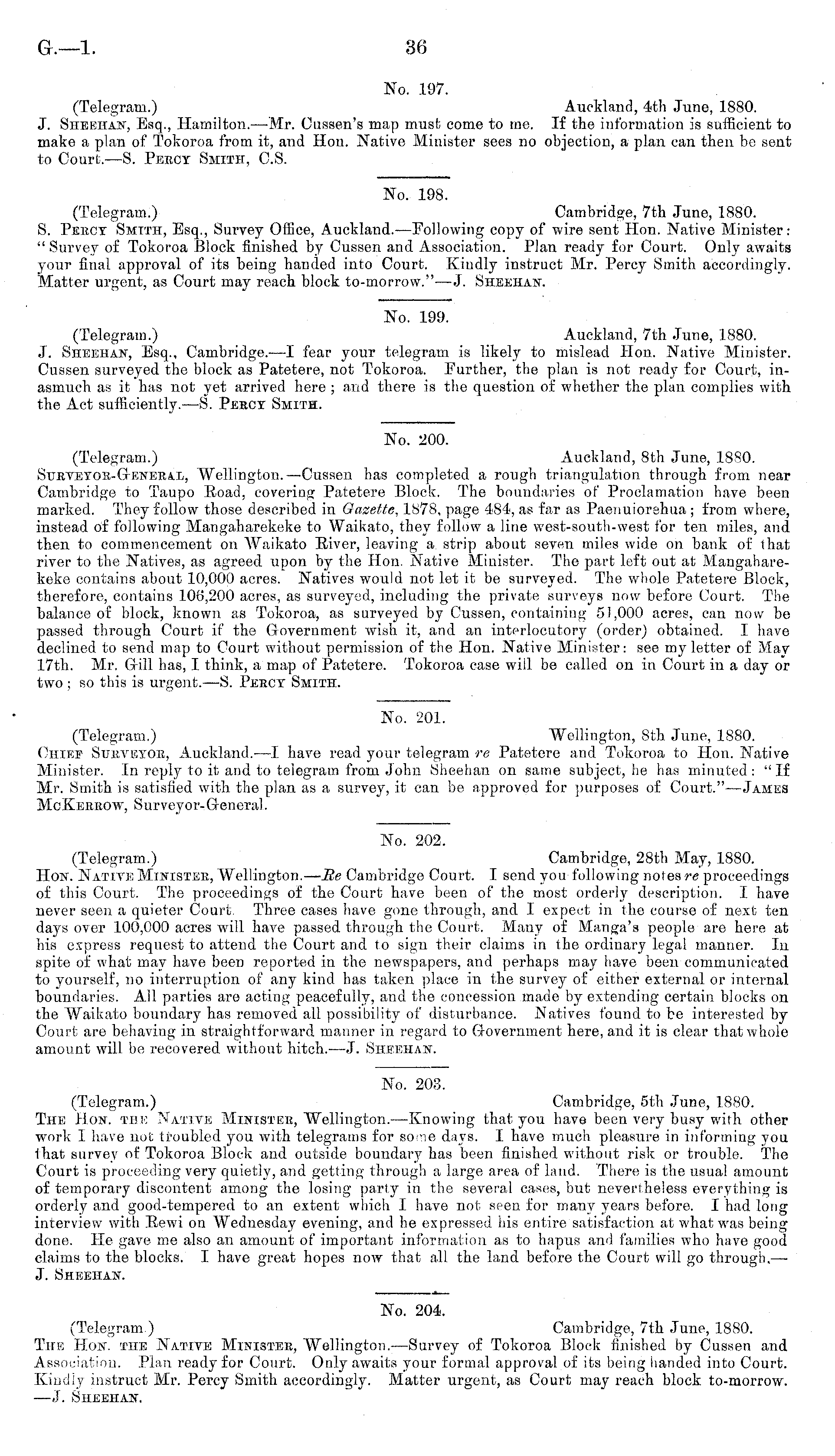 No. 197. (Telegram.) Auckland, 4th June, 1880. J. Sheehan, Esq., Hamilton.—Mr. Cussen's map must come to me. If the information is sufficient to make a plan of Tokoroa from it, and Hon. Native Minister sees no objection, a plan can then be sent to Court. —S. Percy Smith, C.S. No. 198. (Telegram.) Cambridge, 7th June, 1880. S. Percy Smith, Esq., Survey Office, Auckland.—Following copy of wire sent Hon. Native Minister: "Survey of Tokoroa Block finished by Cussen and Association. Plan ready for Court. Only awaits your final approval of its being handed into Court. Kindly instruct Mr. Percy Smith accordingly. Matter urgent, as Court may reach block to-morrow." —J. Sheehan. No. 199. (Telegram.) Auckland, 7th June, 1880. J. Sheehan, Esq., Cambridge.—l fear your telegram is likely to mislead Hon. Native Minister. Cussen surveyed the block as Patetere, not Tokoroa. Further, the plan is not ready for Court, inasmuch as it has not yet arrived here ; and there is the question of whether the plan complies with the Act sufficiently. —S. Percy Smith. No. 200. (Telegram.) Auckland, Bth June, 18S0. Surveyor-General, Wellington.—Cussen has completed a rough triangulation through from near Cambridge to Taupo Koad, covering Patetere Block. The boundaries of Proclamation have been marked. They follow those described in Gazette, 1878, page 484, as far as Paenuiorehua ; from where, instead of following Mangaharekeke to Waikato, they follow a line west-south-west for ten miles, and then to commencement on Waikato River, leaving a strip about seven miles wide on bank of that river to the Natives, as agreed upon by the Hon. Native Minister. The part left out at Mangaharekeke contains about 10,000 acres. Natives would not let it be surveyed. The whole Patetere Block, therefore, contains 106,200 acres, as surveyed, including the private surveys now before Court. The balance of block, known as Tokoroa, as surveyed by Cussen, containing 51,000 acres, can now be passed through Court if the Government wish it, and an interlocutory (order) obtained. I have declined to send map to Court without permission of the Hon. Native Minister: see my letter of Mav 17th. Mr. Gill has, I think, a map of Patetere. Tokoroa case will be called on in Court in a day or two ; so this is urgent. —S. Percy Smith. No. 201. (Telegram.) Wellington, Bth June, 1880. Chiee Surveyor, Auckland. —I have read your telegram re Patetere and Tokoroa to Hon. Native Minister. In reply to it and to telegram from John Sheehan on same subject, he has minuted: "If Mr. Smith is satisfied with the plan as a survey, it can be approved for purposes of Court."—James McKerrow, Surveyor-General. No. 202. (Telegram.) Cambridge, 28th May, 1880. Hon. Native Minister, Wellington.— Be Cambridge Court. I send you following notes re proceedings of this Court. The proceedings of the Court have been of the most orderly description. I have never seen a quieter Court. Three cases have gone through, and I expect in the course of next ten days over 100,000 acres wall have passed through the Court. Many of Manga's people are here at his express request to attend the Court and to sign their claims in the ordinary legal manner. In spite of what may have been reported in the newspapers, and perhaps may have been communicated to yourself, no interruption of any kind has taken place in the survey of either external or internal boundaries. All parties are acting peacefully, and the concession made by extending certain blocks on the Waikato boundary has removed all possibility of disturbance. Natives found to be interested by Court are behaving in straightforward manner in regard to Government here, and it is clear that whole amount will be recovered without hitch. —J. Sheehan. No. 203. (Telegram.) Cambridge, sth June, 1880. The Hon. the Native Minister, Wellington.—Knowing that you have been very busy with other work I have not troubled you with telegrams for some days. I have much pleasure in informing you that survey of Tokoroa Block and outside boundary has been finished without risk or trouble. The Court is proceeding very quietly, and getting through a large area of land. There is the usual amount of temporary discontent among the losing party in the several cases, but nevertheless everything is orderly and good-tempered to an extent which I have not seen for many years before. I had long interview with Eewi on Wednesday evening, and he expressed his entire satisfaction at what was being done. He gave me also an amount of important information as to hapus and families who have good claims to the blocks. I have great hopes now that all the land before the Court will go through.—J. Sheehan. No. 204. (Telegram.) Cambridge, 7th June, 1880. The Hon. the Native Minister, Wellington. —Survey of Tokoroa Block finished by Cussen and Association. Plan ready for Court. Only awaits your formal approval of its being handed into Court. Kindly instruct Mr. Percy Smith accordingly. Matter urgent, as Court may reach block to-morrow. —J. Sheehan.