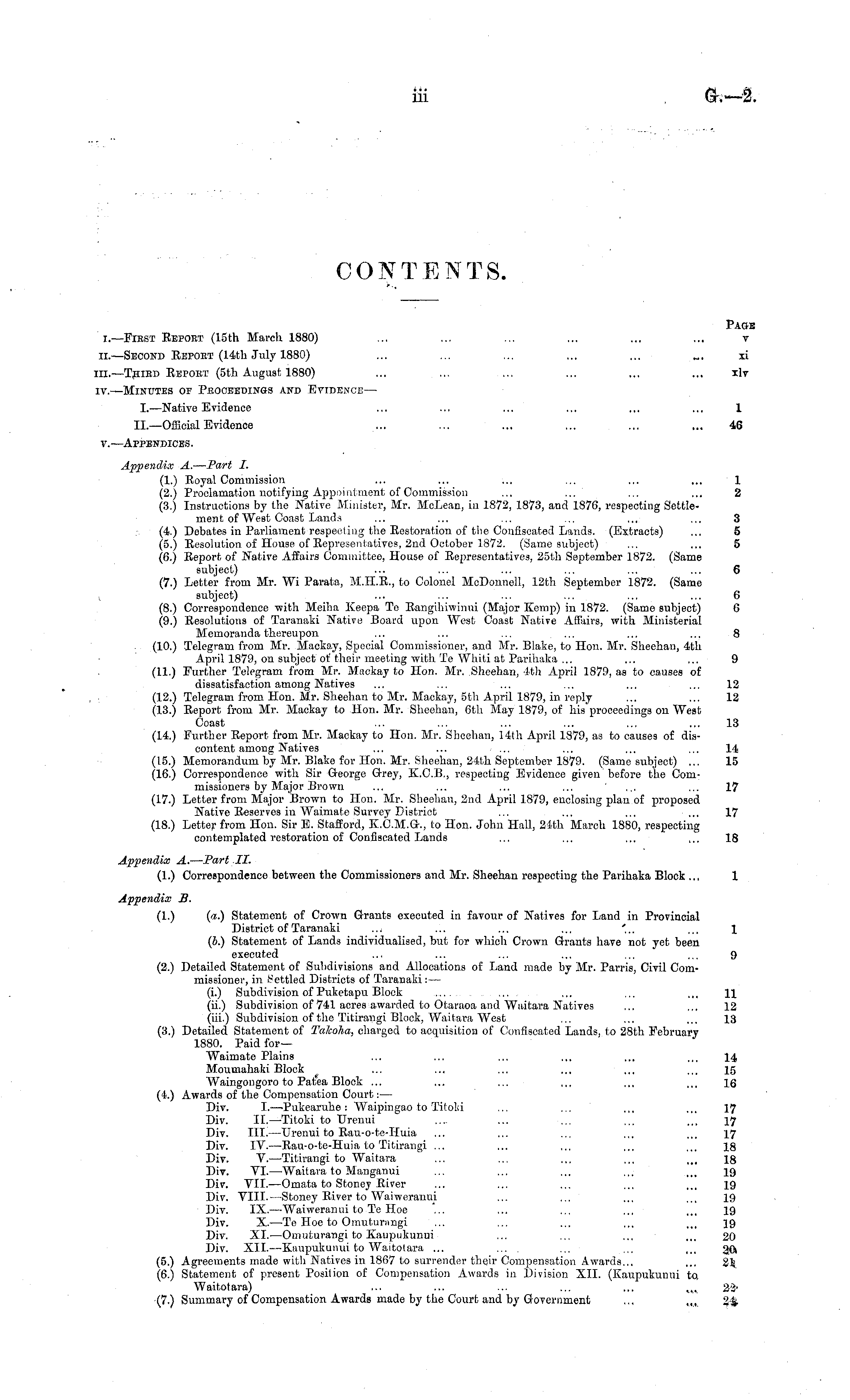 CONTENTS. Pao_ i.—Fikst Repobt (15th March 1880) ... ... ... ... ... ... v n. —-Second Report (14th July 1880) ... ... ... ... ... „. xi in.—TpißD Repokt (sth August 1880) ... ... ... ... ... ... xlv iv.—Minutes of Peoceedings and Evidence — I.—Native Evidence ... ... ... ... ... ... 1 IL—Official Evidence ... ... ... ... ... ... 46 v.— Appendices. Appendix A. — Part I. (1.) Royal Commission ... ... ... ... ... ... 1 (2.) Proclamation notifying Appointment of Commission ... ... ... ... 2 (3.) Instructions by the Native Minister, Mr. McLean, in 1872, 1873, and 1876, respecting Settlement of West Coast Lands ... ... ... ... ... ... 3 (4.) Debates in Parliament respenting the Restoration of the Confiscated Lands. (Extracts) ... 5 (5.) Resolution of House of Representatives, 2nd October 1872. (Same subject) ... ... 5 (6.) Report of Native Affairs Committee, Honse of Representatives, 25th September 1872. (Same subject) ... ... ... ... ... ... 6 (7.) Letter from Mr. Wi Parata, M.H.R., to Colonel McDonnell, 12th September 1872. (Same subject) ... ... ... ... ... ... 6 (8.) Correspondence with Meiha Keepa To Rangihiwinui (Major Kemp) in 1872. (Same subject) 6 (9.) Resolutions of Taranaki Native Board upon West Coast Native Affairs, with Ministerial Memoranda thereupon ... ... ... ... ... ... 8 (10.) Telegram from Mr. Mackay, Special Commissioner, and Mr. Blake, to Hon. Mr. Sheehan, 4th April 1879, on subject of their meeting with Te Whiti at Parihaka ... ... ... 9 (11.) Further Telegram from Mr. Mackay to Hon. Mr. Sheehan, 4th April 1879, as to causes of dissatisfaction among Natives ... ... ... ... ... ... 12 (12.) Telegram from Hon. Mr. Sheehan to Mr. Mackay, sth April 1879, in reply ... ... 12 (13.) Report from Mr. Mackay to Hon. Mr. Sheehan, 6th May 1879, of his proceedings on West Coast ... ... ... ... ... ... 13 (14.) Further Report from Mr. Mackay to Hon. Mr. Sheehan, 14th April 1879, as to causes of discontent among Natives ... ... ... ... ... ... 14 (15.) Memorandum by Mr. Blake for Hon. Mr. Sheehan, 24th September 1879. (Same subject) ... 15 (16.) Correspondence with Sir George Grey, K.C.8., respecting Evidence given before the Commissioners by Major Brown ... ... ... ... ... ... 17 (17.) Letter from Major Brown to Hon. Mr. Sheehan, 2nd April 1879, enclosing plan of proposed Native Reserves in Waimate Survey District ... ... ... ... 17 (18.) Letter from Hon. Sir E. Stafford, K.C.M.G., to Hon. John Hall, 24th March 1880, respecting contemplated restoration of Confiscated Lands ... ... ... ~. 18 Appendix A. — Rart 11. (1.) Correspondence between the Commissioners and Mr. Sheehan respecting the Parihaka Block ... 1 Appendix B. (1.) (a.) Statement of Crown Grants executed in favour of Natives for Land in Provincial District of Taranaki ... ... ... ... '~ ... 1 (S.) Statement of Lands individualised, but for which Crown Grants have not yet been executed ... ... ... ... ... ... 9 (2.) Detailed Statement of Subdivisions and Allocations of Land made by Mr. Parris, Civil Commissioner, in t-'ettled Districts of Taranaki: — (i.) Subdivision of Puketapu Block ... ... ... H (ii.) Subdivision of 741 acres awarded to Otaraoa and Waitara Natives ... ... 12 (iii.) Subdivision of the Titirangi Block, Waitara West ... ... ... 13 (3.) Detailed Statement of Takoha, charged to acquisition of Confiscated Lands, to 28th February 1880. Paid for— Waimate Plains ... ... ... ... ... ... 14 Moumahaki Block ... ... ... ... ... ... 15 Waingongoro to Pafea Block ... ... ... ... ... ... ].g (4.) Awards of the Compensation Court: — Div. I.—Pukearuhe: Waipingao to Titoki ... ... ... ... 17 Div. ll.—Titoki to tJrenui ... ... ... ... 17 Div. 111. —Urenui to Rau-o-te-Huia ... ~, ... ... ... 17 Div. IV. —Rau-o-te-Huia to Titirangi ... ... ... ... ... 18 Div. V. —Titirangi to Waitara ... ... ... ... ~, 18 Dir. VI. —Waitara to Manganui ... ... ... ... ... 19 Div. Vll.—Omata to Stoney River ... ... ... ... ... 19 Div. VIII. —Stoney River to Waiweranui ... ... ... ... 19 Div. IX.—■ Waiweranui to Te Hoe ... ... ... ... ... 19 Div. X. —Te Hoe to Omuturnngi ... ... ... ... ... 19 Div. XI. —Omuturangi to Kaupukunui ... ... ... ... 20 Div. XII. —Kaupukunui to Waitotara ... ... . ... ... ... 3$ (5.) Agreements made with Natives in 1867 to surrender thqir Compensation Awards.,. ... 21 (6.) Statement of present Position of Compensation Awards in Division XII. (Kaupukunui to. Waitotara) ... ... ... ... ... t .. 23--(7.) Summary of Compensation Awards made by the Court and by Government ... ~, 2<J,