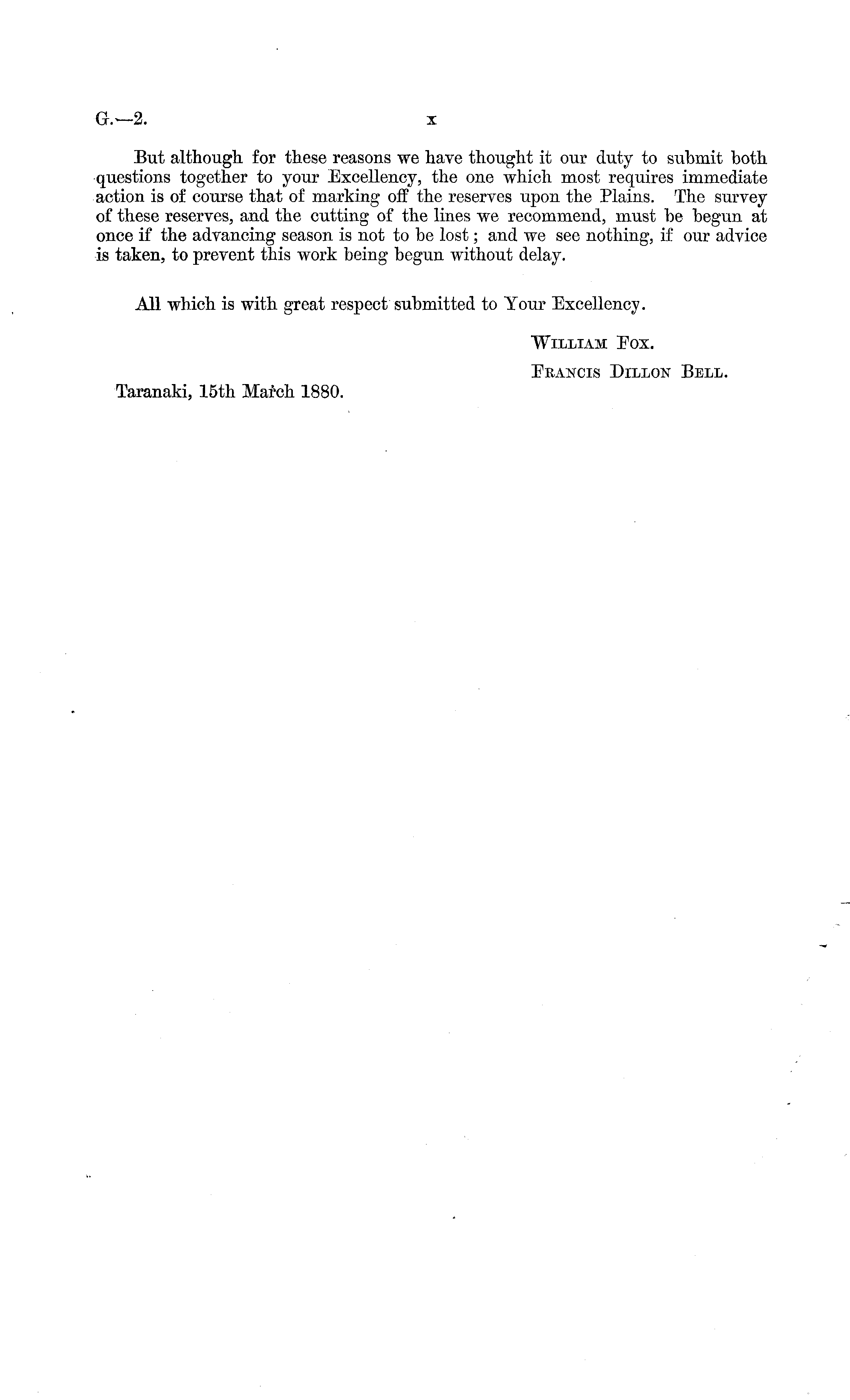 But although for these reasons we have thought it our duty to submit both questions together to your Excellency, the one which most requires immediate action is of course that of marking off the reserves upon the Plains. The survey of these reserves, and the cutting of the lines we recommend, must be begun at once if the advancing season is not to be lost; and wo see nothing, if our advice is taken, to prevent this work being begun without delay. All which is with great respect submitted to Your Excellency. William Eox. Ebancis Dillon Bell. Taranaki, 15th March 1880.