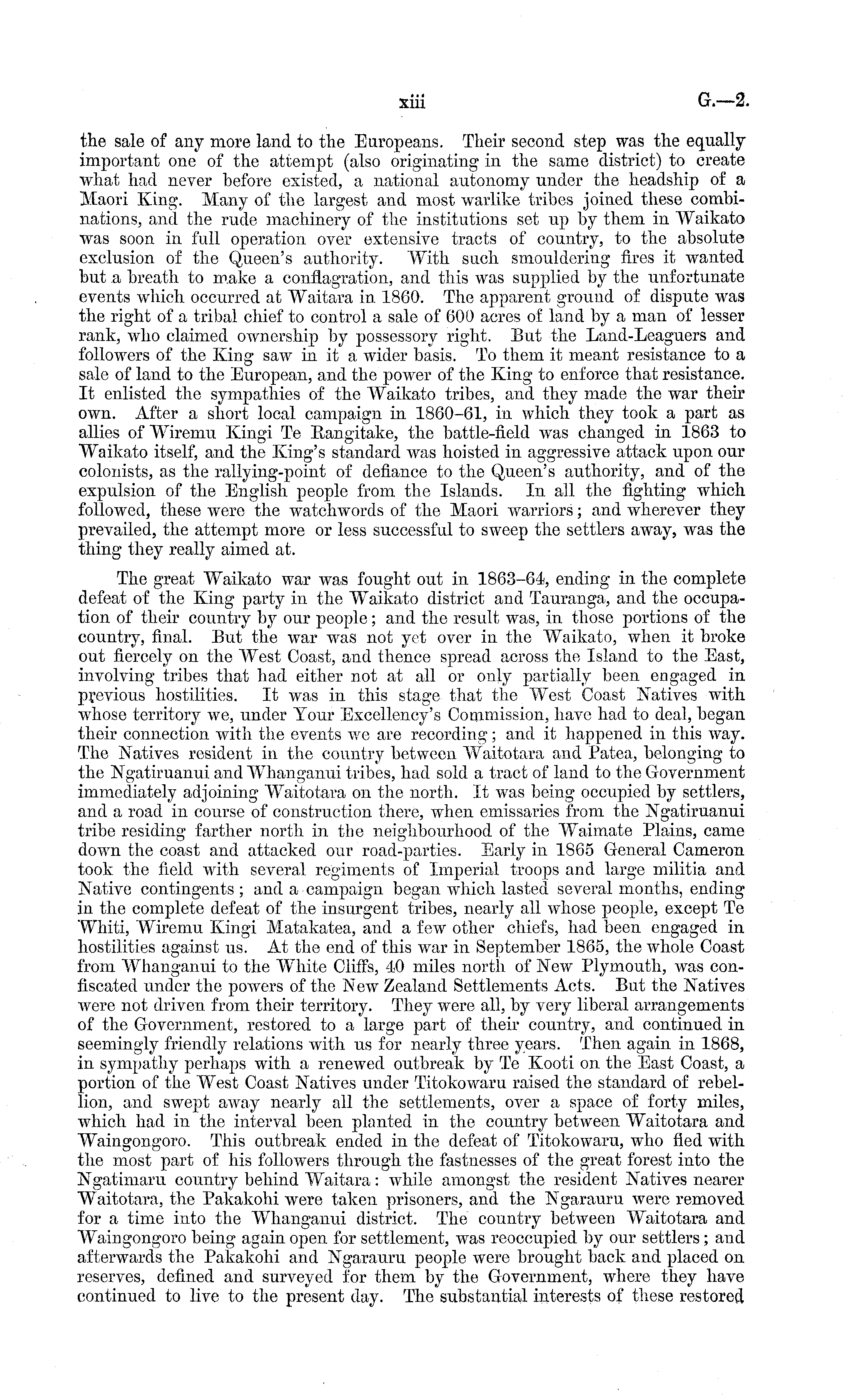 the sale of any more land to the Europeans. Their second step was the equally important one of the attempt (also originating in the same district) to create what had never before existed, a national autonomy under the headship of a Maori King. Many of the largest and most warlike tribes joined these combinations, and the rude machinery of the institutions set up by them in Waikato was soon in full operation, over extensive tracts of country, to the absolute exclusion of the Queen's authority. With such smouldering fires it wanted but a breath to make a conflagration, and this was supplied by the unfortunate events which occurred at Waitara in 1860. The apparent ground of dispute was the right of a tribal chief to control a sale of 600 acres of land by a man of lesser rank, who claimed ownership by possessory right. But the Land-Leaguers and followers of the King saw in it a wider basis. To them it meant resistance to a sale of land to the European, and the power of the King to enforce that resistance. It enlisted the sympathies of the Waikato tribes, and they made the war their own. After a short local campaign in 1860-61, in which they took a part as allies of Wiremu Kingi Te Rangitake, the battle-field was changed in 1863 to Waikato itself, and the King's standard, was hoisted in aggressive attack upon our colonists, as the rallying-point of defiance to the Queen's authority, and of the expulsion of the English people from the Islands. In all the fighting which followed, these were the watchwords of the Maori warriors; and wherever they prevailed, the attempt more or less successful to sweep the settlers away, was the thing they really aimed at. The great Waikato war was fought out in 1863-64, ending in the complete defeat of the King party in the Waikato district and Tauranga, and the occupation of their country by our people; and the result was, in those portions of the country, final. But the war was not yet over in the Waikato, when it broke out fiercely on the West Coast, and thence spread across the Island to the East, involving tribes that had either not at all or only partially been engaged in previous hostilities. It was in this stage that the West Coast Natives with whose territory we, under Your Excellency's Commission, have had to deal, began their connection with the events we are recording; and it happened in this way. The Natives resident in the country between Waitotara and Patea, belonging to the Ngatiruanui and Whanganui tribes, had sold a tract of land to the Government immediately adjoining Waitotara on the north. It was being occupied by settlers, and a road in course of construction there, when emissaries from the Ngatiruanui tribe residing farther north in the neighbourhood of the Waimate Plains, came down the coast and attacked our road-parties. Early in 1865 General Cameron took the field with several regiments of Imperial troops and large militia and Native contingents; and a campaign began wmich lasted several months, ending in the complete defeat of the insurgent tribes, nearly all whose people, except Te Whiti, Wiremu Kingi Matakatea, and a few other chiefs, had been engaged in hostilities against us. At the end of this war in September 1865, the whole Coast from Whanganui to the White Cliffs, 40 miles north of New Plymouth, was confiscated under the powers of the New Zealand Settlements Acts. But the Natives were not driven from their territory. They were all, by very liberal arrangements of the Government, restored to a large part of their country, and continued in seemingly friendly relations with us for nearly three years. Then again in 1868, in sympathy perhaps with a renewed outbreak by Te Kooti on the East Coast, a portion of the West Coast Natives under Titokowaru raised the standard of rebellion, and swept away nearly all the settlements, over a space of forty miles, which had in the interval been planted in the country between Waitotara and Waingongoro. This outbreak ended in the defeat of Titokowaru, who fled with the most part of his followers through the fastnesses of the great forest into the Ngatimaru country behind Waitara: while amongst the resident Natives nearer Waitotara, the Pakakohi were taken prisoners, and the Ngarauru were removed for a time into the Whanganui district. The country between Waitotara and Waingongoro being again open for settlement, was reoccupied by our settlers; and afterwards the Pakakohi and Ngarauru people were brought back and placed on reserves, defined and surveyed for them by the Government, where they have continued to live to the present day. The substantial interests of these restored