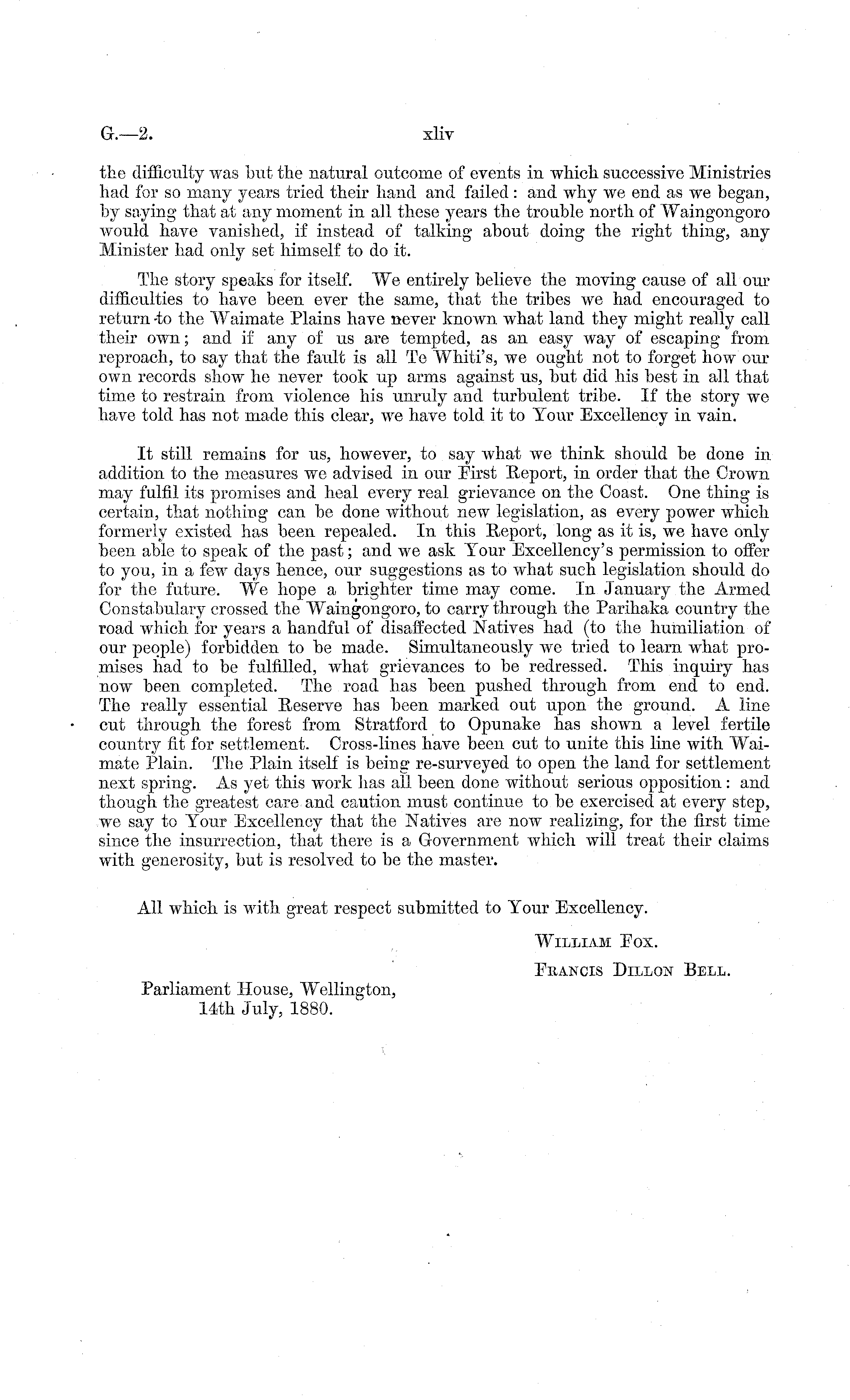 the difficulty Avas but the natural outcome of events in which successive Ministries had for so many years tried their hand and failed : and why we end as we began, by saying that at any moment in all these years the trouble north of Waingongoro Avould have vanished, if instead of talking about doing the right thing, any Minister had only set himself to do it. The story speaks for itself. We entirely believe the moving cause of all our difficulties to have been ever the same, that the tribes Ave had encouraged to return -to the Waimate Plains have never knoAvn what land they might really call their own; and if any of us are tempted, as an easy Avay of escaping from reproach, to say that the fault is all Te Whiti's, we ought not to forget how our own records show ho never took up arms against us, but did his best in all that time to restrain from violence his unruly and turbulent tribe. If the story we have told has not made this clear, AA re have told it to Your Excellency in vain. It still remains for us, however, to say what Ave think should be done in addition to the measures Ave advised in our Eirst Report, in order that the Crown may fulfil its promises and heal eA~ery real grievance on the Coast. One thing is certain, that nothing can be done without neAV legislation, as every power which formerly existed has been repealed. In this Report, long as it is, we have only been able to speak of the past; and we ask Your Excellency's permission to offer to you, in a few days hence, our suggestions as to what such legislation should do for the future. We hope a brighter time may come. In January the Armed Constabulary crossed the Waingongoro, to carry through the Parihaka country the road which for years a handful of disaffected Natives had (to the humiliation of our people) forbidden to be made. Simultaneously we tried to learn what promises had to be fulfilled, what grievances to be redressed. This inquiry has now been completed. The road has been pushed through from end to end. The really essential Reserve has been marked out upon the ground. A line cut through the forest from Stratford to Opunake has shown a level fertile country fit for settlement. Cross-lines have been cut to unite this line with Waimate Plain. The Plain itself is being re-surveyed to open the land for settlement next spring. As yet this work has all been done Avithout serious opposition : and though the greatest care, and caution must continue to be exercised at every step, Ave say to Your Excellency that the Natives are no'w realizing, for the first time since the insurrection, that there is a Government Avhich will treat their claims with generosity, but is resolved to be the master. All which is with great respect submitted to Your Excellency. William Eox. Ekancis Dillon Bell. Parliament House, Wellington, 11th July, 1880.