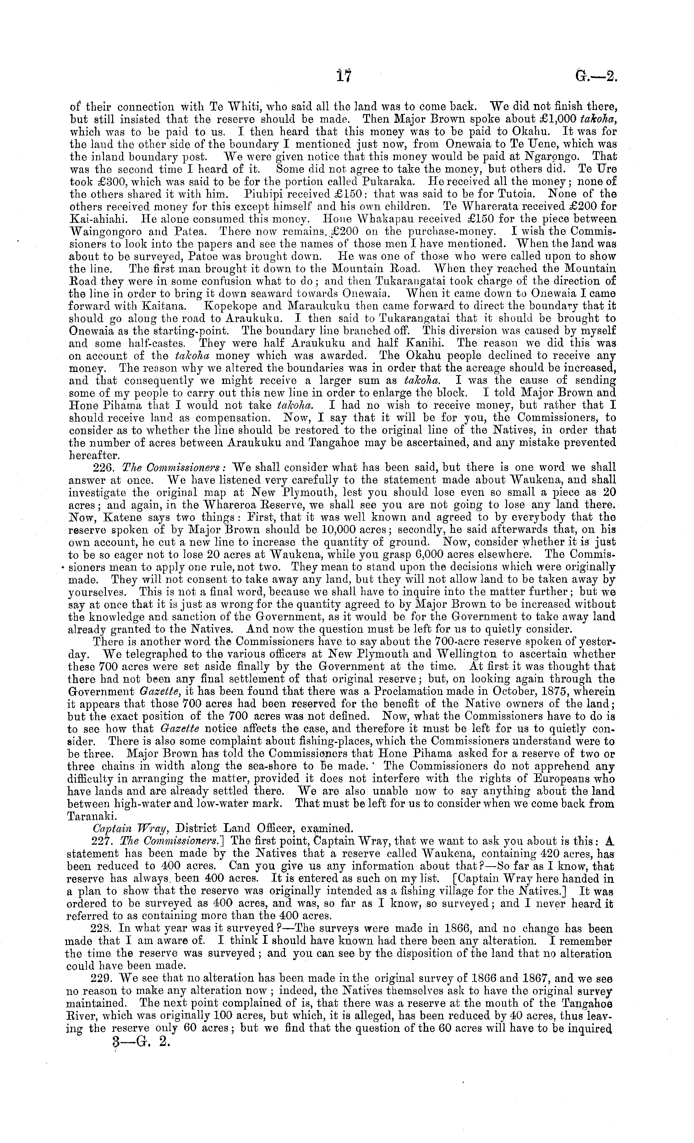 of their connection with Te Whiti, who said all the land was to come back. We did not finish there, but still insisted that the reserve should be made. Then Major Brown spoke about £1,000 takoha, which was to be paid to us. I then heard that this money was to be paid to Okahu. It was for the land the other side of the boundary I mentioned just now, from Onewaia to Te Dene, which was the inland boundary post. We were given notice that this money would be paid at Ngarpngo. That was the second time I heard of it. Some did not agree to take the money, but others did. Te Hre took £300, which was said to be for the portion called Pukaraka. He received all the money; none of the others shared it with him. Piubipi received £150: that was said to be for Tutoia. None of the others received money for this except himself and his own children. Te Wharerata received £200 for Kai-ahiahi. He alone consumed this money. Hone Whakapau received £150 for the piece between Waingongoro and Patea. There now remains £200 on the purchase-money. I wish the Commissioners to look into the papers and see the names of those men I have mentioned. When the land was about to be surveyed, Patoe was brought down. He was one of those who were called upon to show the line. The first man brought it down to the Mountain Boad. When they reached the Mountain Road they were in some confusion what to do; and then Tukarangatai took charge of the direction of the line iu order to bring it down seaward towards Onewaia. When it came down to Onewaia I came forward with Kaitana. Kopekope and Maraukuku then came forward to direct the boundary that it should go along the road to Araukuku. I then said to Tukarangatai that it should be brought to Onewaia as the starting-point. The boundary line branched off. This diversion was caused by myself and some half-castes. They were half Araukuku and half Kanihi. The reason we did this was on account of the takoha money which was awarded. The Okahu people declined to receive any money. The reason why we altered the boundaries was in order that the acreage should be increased, and that consequently we might receive a larger sum as takoha. I was the cause of sending some of my people to carry out this new line in order to enlarge the block. I told Major Brown and Hone Pihama that I would not take takoha. I had no wish to receive money, but rather that I should receive land as compensation. Now, I say that it will be for you, the Commissioners, to consider as to whether the line should be restored to the original line of the Natives, in order that the number of acres between Araukuku and Tangahoe may be ascertained, and any mistake prevented hereafter. 226. The Commissioners: We shall consider what has been said, but there is one word we shall answer at once. We have listened very carefully to the statement made about Waukena, and shall investigate the original map at New Plymouth, lest you should lose even so small a piece as 20 acres; and again, in the Whareroa Beserve, we shall see you are not going to lose any land there. Now, Katene says two things : Pirst, that it was well known and agreed to by everybody that the reserve spoken of by Major Brown should be 10,000 acres; secondly, he said afterwards that, on his own account, he cut a new line to increase the quantity of ground. Now, consider whether it is just to be so eager not to lose 20 acres at Waukena, while you grasp 6,000 acres elsewhere. The Commis- • sioners mean to apply one rule, not two. They mean to stand upon the decisions which were originally made. They will not consent to take away any land, but they will not allow land to be taken away by yourselves. This is not a final word, because we shall have to inquire into the matter further; but we say at once that it is just as wrong for the quantity agreed to by Major Brown to be increased without the knowledge and sanction of the Government, as it would be for the Government to take away land already granted to the Natives. And now the question must be left for us to quietly consider. There is another word the Commissioners have to say about the 700-acre reserve spoken of yesterday. We telegraphed to the various officers at New Plymouth and Wellington to ascertain whether these 700 acres were set aside finally by the Government at the time. At first it was thought that there had not been any final settlement of that original reserve; but, on looking again through the Government Gazette, it has been found that there was a Proclamation made in October, 1875, wherein it appears that those 700 acres had been reserved for the benefit of the Native owners of the land; but the exact position of the 700 acres was not defined. Now, what the Commissioners have to do is to see how that Gazette notice affects the case, and therefore it must be left for us to quietly consider. There is also some complaint about fishing-places, which the Commissioners understand were to be three. Major Brown has told the Commissioners that Hone Pihama asked for a reserve of two or three chains in width along the sea-shore to be made. ' The Commissioners do not apprehend any difficulty in arranging the matter, provided it does not interfere with the rights of Europeans who have lands and are already settled there. We are also unable now to say anything about the land between high-water and low-water mark. That must be left for us to consider when we come back from Taranaki. Captain Wray, District Land Officer, examined. 227. Ttie Commissioners.] The first point, Captain Wray, that we want to ask you about is this : A. statement has been made by the Natives that a reserve called Waukena, containing 420 acres, has been reduced to 400 acres. Can you give us any information about that?—So far as I know, that reserve has always, been 400 acres. It is entered as such on my list. [Captain Wray here handed in a plan to show that the reserve was originally intended as a fishing village for the Natives.] It was orde