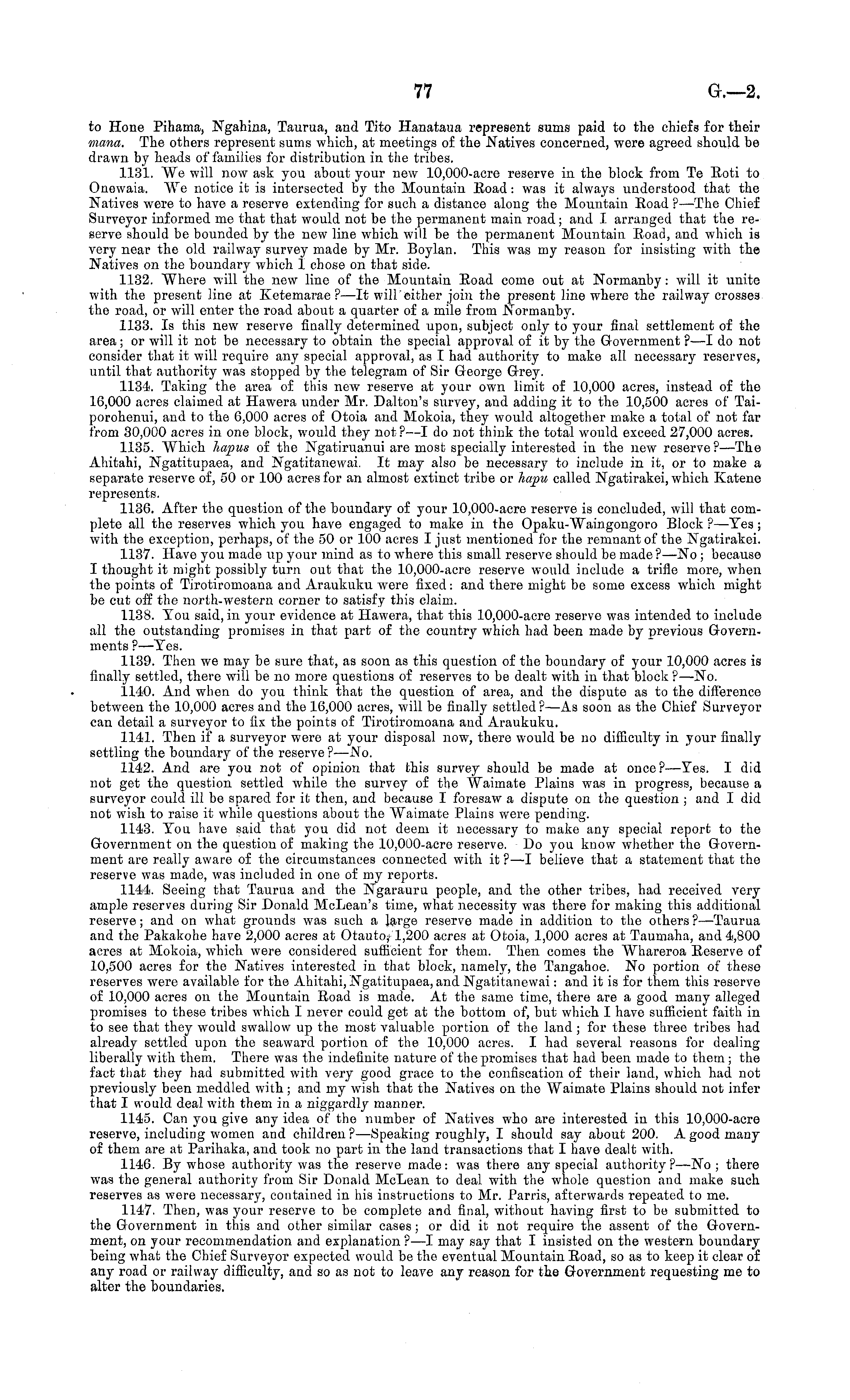 to Hone Pihama, Ngahina, Taurua, and Tito Hanataua represent sums paid to the chiefs for their mana. The others represent sums which, at meetings of the .Natives concerned, were agreed should be drawn by heads of families for distribution in the tribes. 1131. We will now ask you about your new 10,000-acre reserve in the block from Te Koti to Onewaia. We notice it is intersected by the Mountain Eoad: was it always understood that the Natives were to have a reserve extending for such a distance along the Mountain Eoad ?—The Chief Surveyor informed me that that would not be the permanent main road; and I arranged that the reserve should be bounded by the new line which will be the permanent Mountain Eoad, and which is very near the old railway survey made by Mr. Boylan. This was my reason for insisting with the Natives on the boundary which 1 chose on that side. 1132. Where will the new line of the Mountain Eoad come out at Normanby: will it unite with the present line at Ketemarae ?—lt will either join the present line where the railway crosses the road, or will enter tho road about a quarter of a mile from Normanby. 1133. Is this new reserve finally determined upon, subject only to your final settlement of the area; or will it not be necessary to obtain the special approval of it by the Government ? —I do not consider that it will require any special approval, as I had authority to make all necessary reserves, until that authority was stopped \>j the telegram of Sir George Grey. 1134. Taking the area of this new reserve at your own limit of 10,000 acres, instead of the 16,000 acres claimed at Hawera under Mr. Dalton's survey, and adding it to the 10,500 acres of Taiporohenui, and to the 6,000 acres of Otoia and Mokoia, they would altogether make a total of not far from 30,000 acres in one block, would they not ?—I do not think the total would exceed 27,000 acres. 1135. Which hapus of the Ngatiruanui are most specially interested in the new reserve?—The Ahitahi, Ngatitupaea, and Ngatitanewai. It may also be necessary to include in it, or to make a separate reserve of, 50 or 100 acres for an almost extinct tribe or hapu called Ngatirakei, which Katene represents. 1136. After the question of the boundary of your 10,000-acre reserve is concluded, will that complete all the reserves which you have engaged to make in the Opaku-Waingongoro Block ? —Tes ; with the exception, perhaps, of the 50 or 100 acres I just mentioned for the remnant of the Ngatirakei. 1137. Have you made up your mind as to where this small reserve should be made?—No ; because I thought it might possibly turn out that the 10,000-acre reserve would include a trifle more, when the points of Tirotiromoana and Araukuku were fixed: and there might be some excess which might be cut off the north-western corner to satisfy this claim. 1138. Tou said, in your evidence at Hawera, that this 10,000-acre reserve was intended to include all the outstanding promises in that part of the country which had been made by previous Governments ? —Tes. 1139. Then we may be sure that, as soon as this question of the boundary of your 10,000 acres is finally settled, there will be no more questions of reserves to be dealt with in that block ?—No. 1140. And when do you think that the question of area, and the dispute as to the difference between the 10,000 acres and the 16,000 acres, will be finally settled? —As soon as the Chief Surveyor can detail a surveyor to fix the points of Tirotiromoana aud Araukuku. 1141. Then if a surveyor were at your disposal now, there would be no difficulty in your finally settling the boundary of the reserve ?—No. 1142. And are you not of opinion that this survey should be made at once ?—Yes. I did not get the question settled while the survey of the "Waimate Plains was in progress, because a surveyor could ill be spared for it then, and because I foresaw a dispute on the question ; and I did not wish to raise it while questions about the Waimate Plains were pending. 1143. Tou have said that you did not deem it necessary to make any special report to the Government on the question of making the 10,000-acre reserve. Do you know whether the Government are really aware of the circumstances connected with it ?—I believe that a statement that the reserve was made, was included in one of my reports. 1144. Seeing that Taurua and the Ngarauru people, and the other tribes, had received very ample reserves during Sir Donald McLean's time, what necessity was there for making this additional reserve; and on what grounds was such a large reserve made in addition to the others ?—Taurua and the Pakakohe have 2,000 acres at Otauto, 1,200 acres at Otoia, 1,000 acres at Taumaha, and 4,800 acres at Mokoia, which were considered sufficient for them. Then comes the Whareroa Eeserve of 10,500 acres for the Natives interested in that block, namely, the Tangahoe. No portion of these reserves were available for the Ahitahi, Ngatitupaea, and Ngatitanewai: and it is for them this reserve of 10,000 acres on the Mountain Eoad is made. At the same time, there are a good many alleged promises to these tribes which I never could get at the bottom of, but which I have sufficient faith in to see that they would swallow up the most valuable portion of the land ; for these three tribes had already settled upon the seaward portion of the 10,000 acres. I had several reasons for dealing liberally with them. There was the indefinite nature of the promises that had been made to them ; the fact that they had submitted with very good grace to the confiscation of their land, which had not previously been meddled with ; and my wish that the Natives on the Waimate Plains should not infer that I would deal with them in a niggardly manner. 1145. Can you give any idea of the number of Natives who are interested in this 10,000-acre reserve, including women and children? —Speaking roughly, I should say about 200. A good many of them are at 