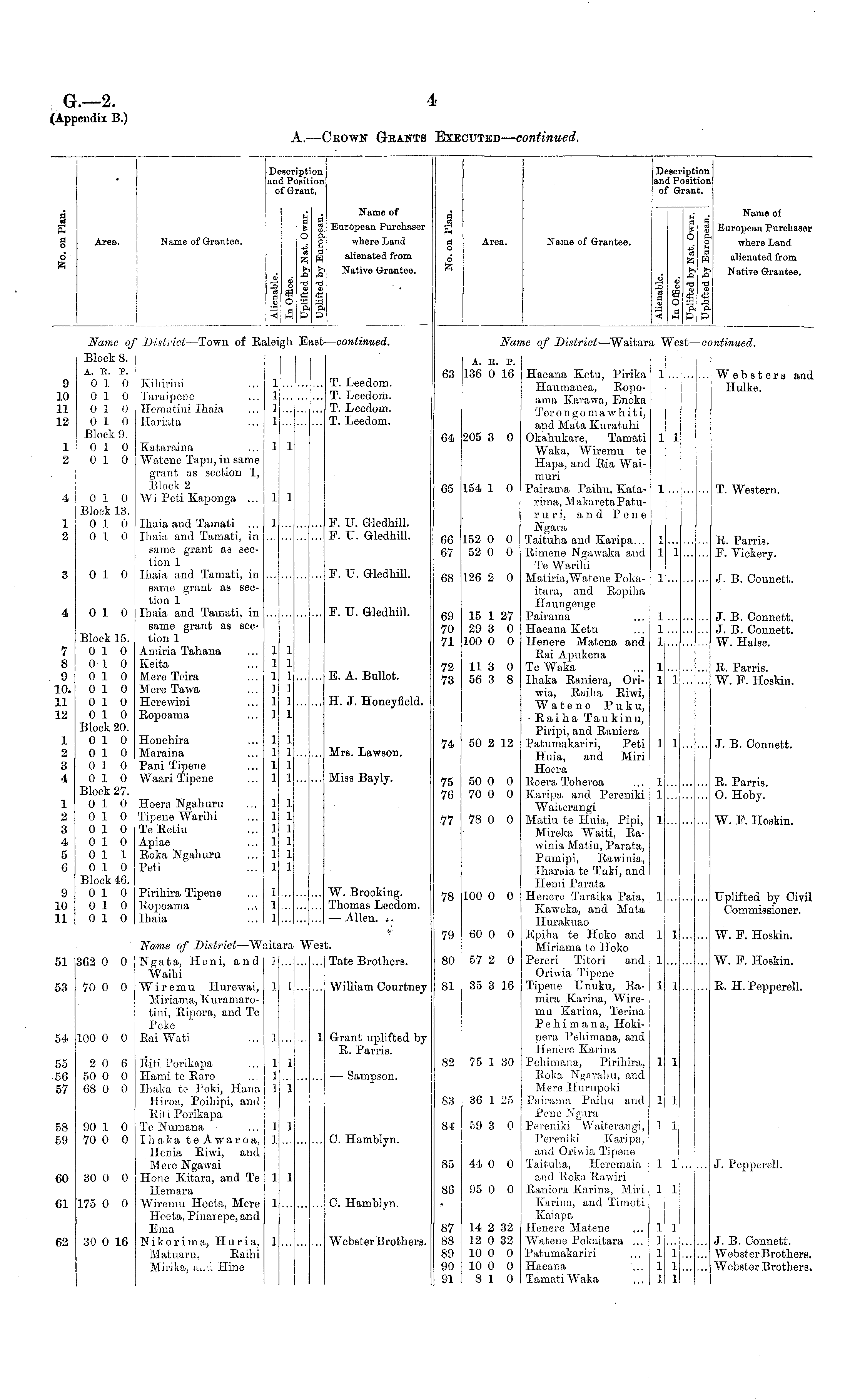 Dei and of icr P< 'Gi 'iptir ositi rani on ion fc, i o Q £ fl C % .O «d c 3Name of Area. Same of Grantee. fl cS ID ft o fl $jj 'ft European Purchaser where Land alienated from Native Grantee. 3 rt fl 3 9 O B o fl Name oj ' District— Town of Ei Leii ist- — continued. 9 10 11 12 Block 8. A. B. P. 0 10 0 10 0 10 0 10 Block 9. 0 10 0 10 Kihirini Taraipene Hematini Ihaia Hariata 1 1 ] 1 ... T. Leedom. T. Leedom. T. Leedom. T. Leedom. 1 2 Kataraina Watene Tapu, in same grant as section 1, Block 2 Wi Peti Eaponga ... F. U. G-ledhill. P. U. Gledhill. 4 1 2 0 10 Block 13. 0 10 0 10 Ihaia and Tamati Ihaia and Tamati, in same grant as section 1 Ihaia and Tamati, in same grant as section 1 Ihaia and Tamati, in same grant as section 1 Amiria Tahana ICeita Mere Teira Mere Tawa Herewini Eopoama 1 0 10 F. V. Gledhill. 0 10 P. IT. Gledhill. 7 S 9 10. 11 12 1 2 3 4 Block 15. 0 10 0 10 0 10 0 10 0 10 0 10 Block 20. 0 10 0 10 0 10 0 10 Block 27. 0 10 0 10 0 10 0 10 Oil 0 10 Block 46. 0 10 0 10 0 10 Honehira Maraina Pani Tipene Waari Tipene 1 1 1 1 J 1 1 1 1 3 1 1 1 1 1 1 ] 1 1 1 ... ... E. A. Bullot. H. J. Honeyfield. Mrs. Lawson. Miss Bayly. 1 2 3 4 5 6 Hoera. Ngahuru Tipene Warihi Te Eetiu Apiae Eolta Xgahuru Peti 1 1 1 1 1 1 1 1 1 1 1 1 9 10 11 Pirihira Tipene Eopoama . .•. Ihaia W. Brooking. Thomas Leedom. — Allen. 1 1 1 51 53 362 0 0 70 0 0 Name of District —W N g a t a, Heni, and Waihi Wiremu Hurewai, Miriama, Kuramarotini, Eipora, and Te Peke EaiWati lib 1 1 ira t. Tate Brothers. William Courtney 54 100 0 0 Grant uplifted by E. Parris. 55 56 57 58 59 2 0 6 50 0 0 68 0 0 90 1 0 70 0 0 30 0 0 Eiti Porikapa Hami te Earo Ihaka te Poki, Hana Hiroa, Poihipi, and Eil i Porikapa To 3N amana Iliaka te Awaroa, Henia Eiwi, and Mere Ngawai Hone Kitara, and Te Hemara Wiremu Hoeta, Mere Hoeta, Pinarepe, and Ema Nikorima, H u r i a, Matuaru. Eaihi Mirika, ai.d Hine 1 1 1 lj ll 11 ll 11 — Sampson. 0. Hamblyn. 60 61 175 0 0 C. Hamblyn. 30 0 16 Webster Brothers. 62