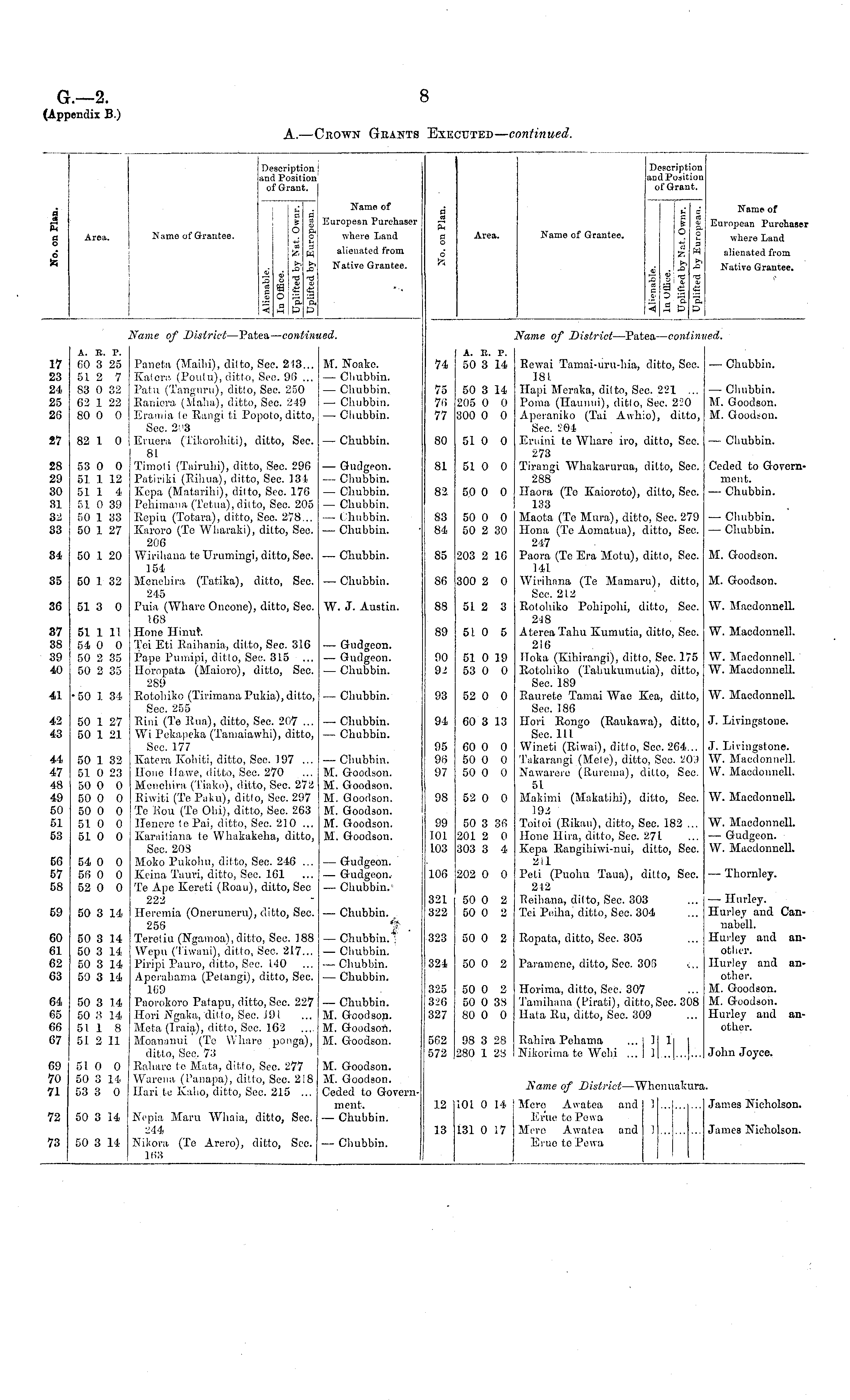 De anc o: scr Pi Gr 'ipti osit rani r'rrrr tion i £3 n o 6 to r~ a \f O ca % >-. fi 13 'S. Name of Area. N nmo of Grantee. . o : =S 3 la w ■ !.&£ p rd P, o t, H fi tl 01 Pr 0 European Purchaser where Land alienated from Native Grantee. _ o!2 s ;rz _ i a. a, -< flip D cr _ o ES O a M Name of District —Patea — conlim (ei. 17 23 24 25 A. B. V. CO 3 25 51 2 7 83 0 32 62 1 22 80 0 0 Paneta (M3ailii), dilto, See. 213... Kalera (Poutu), ditto, See. 9(3 ... Patu (Tanguni), ditlo, Sec. 250 Baniera (Maha), ditto, Sec. 249 Eramia le Eangi ti Popoto, ditto, See. 208 Eruera (Xikorohiti), ditto, Sec. 81 Timoti (Tairuhi), ditto, Sec. 296 Patiriki (Eihua), ditto, Sec. 134 Kepa (Matarihi), dilto, Sec. 176 Penimana (Tetua), ditto, Sec. 205 Bepiu (Totara), ditto, See. 278... Karoro (Te Wharaki), ditto, See. 206 Wirihana te Urumingi, ditto, See. 151 Menehira (Tatika), ditto, Sec. 245 Puia (Whare Oncone), ditto, Sec. 168 Hone Hinui. Tei Eti Ruihama, ditto, Sec. 316 3Pape Pumipi, ditlo, Sec. 315 ... Horopata (Maioro), ditto, See. 289 Rotohiko (Tirimana Pukia), ditto, Sec. 255 Pini (Te Kua), ditto, Sec. 207 ... Wi Pekapeka (Tamaiawhi), ditto, Sec. 177 Katera Kohiti, ditto, Sec. 197 ... Hone llawe, ditto, Sec. 270 Menehira (Tiako), ditto, Sec. 272 Biwiti (Te Puku), ditlo, See. 297 Te Kou (Te Obi), ditto, See. 263 Henere tePai, ditto, Sec. 210 ... Karniliana te Whakakeha, ditto, Sec. 208 Moko Pukohu, ditto, See. 246 ... Keina Tauri, ditto, Sec. 161 Te Ape Kereti (Roau), ditto, Sec 222 Heremia (Oneruneru), ditto, See. 258 Terelin (Ngamoa), ditto, See. 188 Wepn (Tiwuni), ditto, See. 217... Piripi Pauro, ditto, Sec. 140 Aperahama (Pelangi), ditto, Sec. 1(39 Paorokoro Patapu, ditto, See. 227 Hori Ngaka, ditto, Sec. 391 Mela (Iraia), ditto, Sec. 162 ... Moannnui (Te Whare ponga), ditto, See. 73 Eidiare te Mata, ditto, Sec. 277 Warena (Panapa), ditto, See. 218 Hari te Kabo, ditto, Sec. 215 ... IT. Noake. — Chubbin. — Chubbin. — Chubbin. — Cliubbin. 27 82 1 0 — Chubbin. 28 29 30 31 32 S3 53 0 0 51. 1 12 51 1 4 51 0 39 50 1 33 50 1 27 — Gudgeon. — Cliubbin. — Chubbin. — Chubbin. — Chubbin. — Chubbin. 34 50 1 20 — Cliubbin. 35 50 1 32 — Chubbin. 30 51 3 0 W. J. Austin. 37 38 39 40 51 1 11 54 0 0 50 2 35 50 2 35 — Gudgeon. — Gudgeon. — Chubbin. 41 •50 1 34 — Chubbin. 42 43 50 1 27 50 1 21 — Chubbin. — Chubbin. 44 47 48 49 50 51 63 50 1 32 51 0 23 50 0 0 50 0 0 50 0 0 51 0 0 51 0 0 — Chubbin. M. Goodson. M. Goodson. M. Goorlson. M. Goodson. M. Goodson. M. Goodson. 56 57 58 54 0 0 56 0 0 52 0 0 — Gudgeon. —■ Gudgeon. — Chubbin. 59 60 61 033 (33 50 3 14 50 3 14 50 3 14 50 3 14 50 3 14 — Cluibbin. — Chubbin. — Chubbin. — Chubbin. — Chubbin. 64 65 66 67 50 3 14 50 3< 14 51 1 8 51 2 1.1 — Chubbin. M. Goodson. M.'. Goodson. M. Goodson. 69 70 71 51 0 0 50 3 14 53 3 0 M. Goodson. M. Goodson. Ceded to Government. — Cliubbin. 72 50 3 14 Nepia Maru Whaia, ditto, Sec. 244 Nikora (Te Arero), ditto, See. 163 73 50 3 14 — Cliubbin.