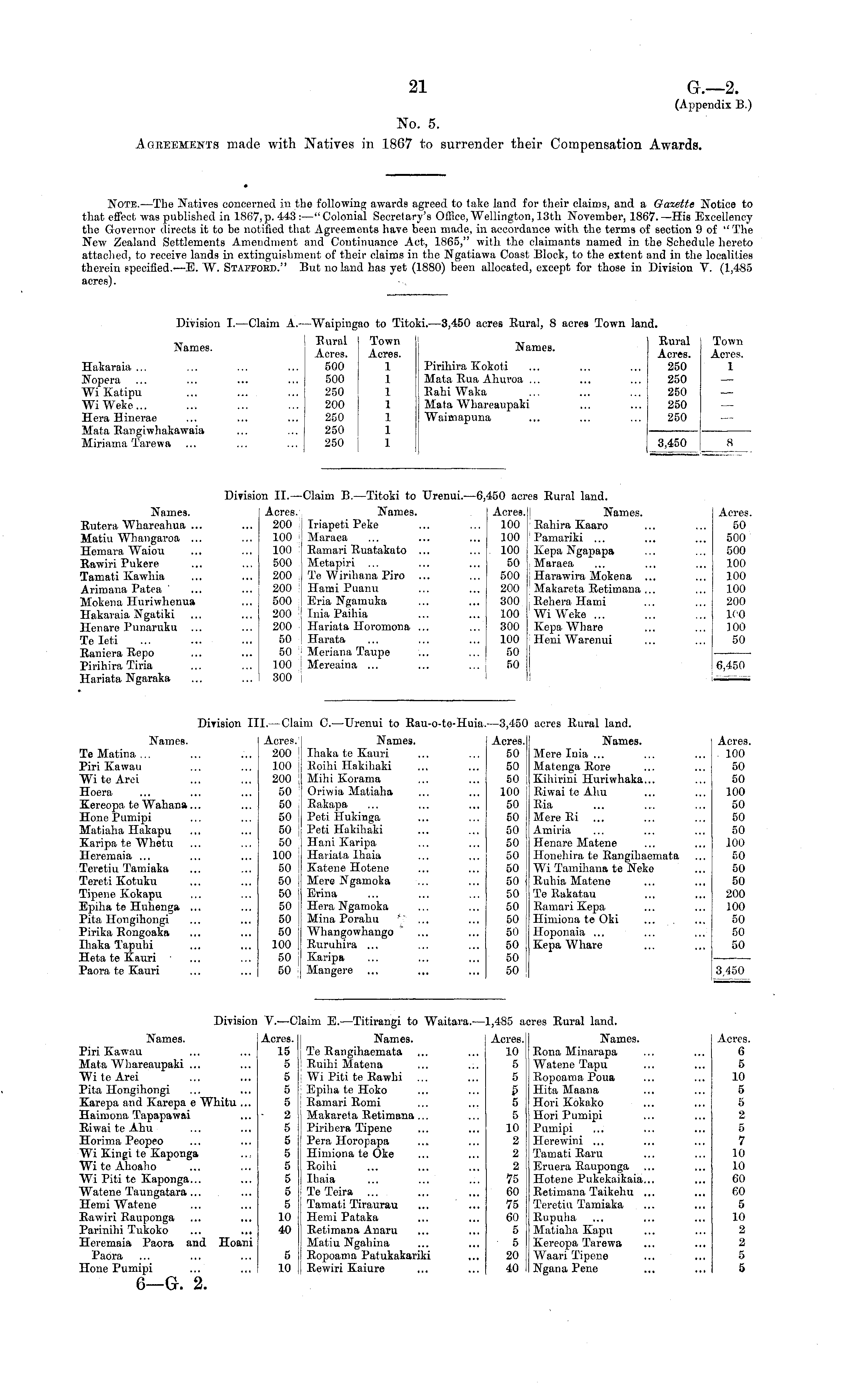 Note. —The Natives concerned in the following awards agreed to take land for their claims, and a Gazette Notice to that effect was published in 1867,p.443:—"Colonial Secretary's Office, Wellington, 13th November, 1867. —His Excellency the Governor directs it to be notified that Agreements have been made, in accordance with the terms of section 9 of "The New Zealand Settlements Amendment and Continuance Act, 1865," with the claimants named in the Schedule hereto attached, to receive lands in extinguishment of their claims in the Ngatiawa Coast Block, to the extent and in the localities therein specified.—E. W. Stafford." But no land has yet (1880) been allocated, except for those in Division V. (1,485 acres).