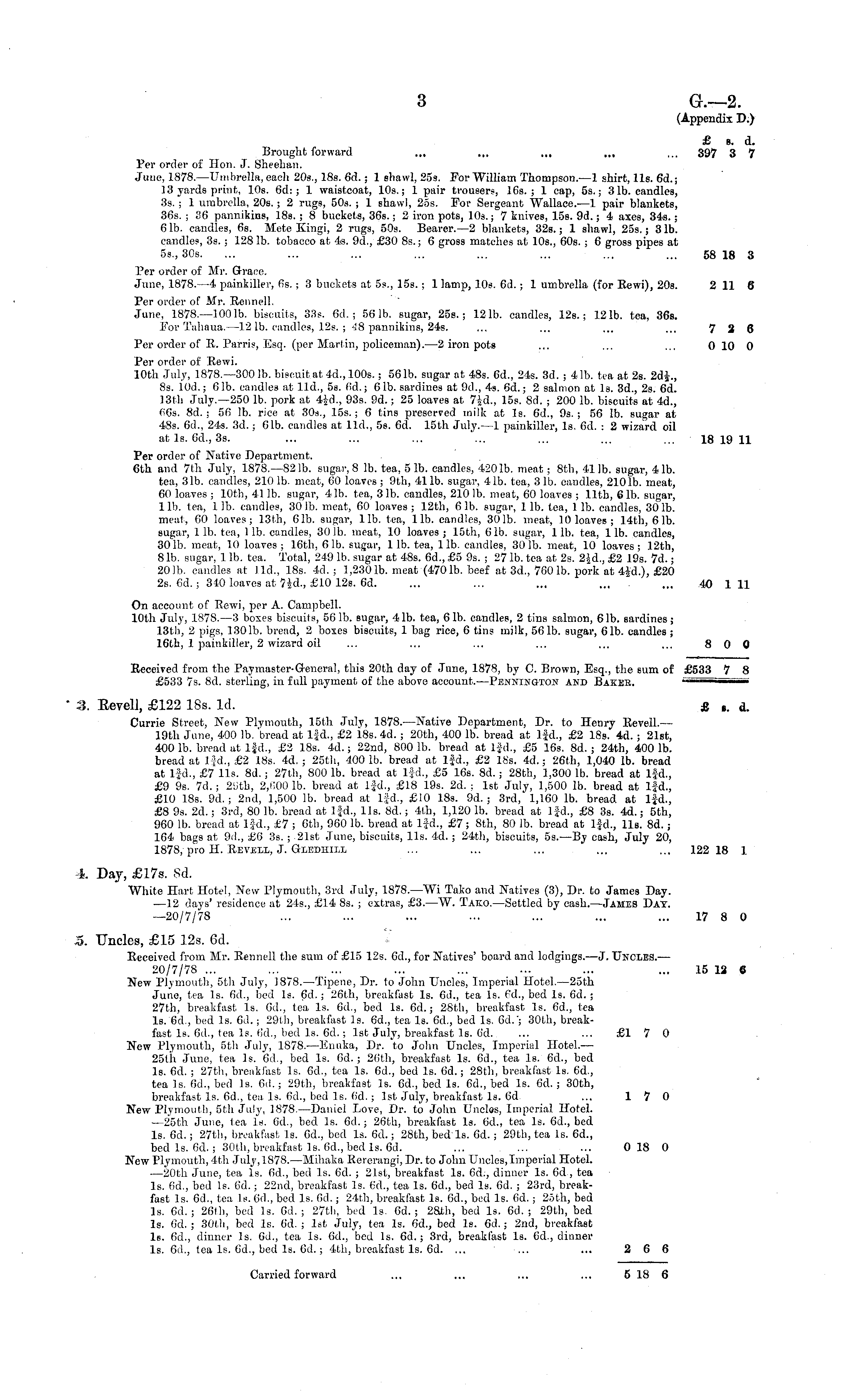 £ s. d. Brought forward ... ... ... ... ... 397 3 7 Per order of Hon. J. Sheehan. June, 1878.—Umbrella, each 205., 18s. 6d.; 1 shawl, 255. For William Thompson.—l shirt, lis. 6d.; 13 yards print, 10s. 6d: ; 1 waistcoat, 10s.; 1 pair trousers, 165.; 1 cap, 55.; 3 lb. candles, 35.; 1 umbrella, 205.; 2 rugs, 50s. ; 1 shawl, 255. Por Sergeant Wallace.—l pair blankets, 365. ; 36 pannikins, 18s. ; 8 buckets, 365.; 2 iron pots, 10s.; 7 knives, 15s. 9d.; 4 axes, 345.; 6 lb. candles, 6s. Mete Kingi, 2 rugs, 50s. Bearer. —2 blankets, 325.; 1 shawl, 255.; 3 lb. candles, 35.; 128 lb. tobacco at 4s. 9d., £30 Bs.; 6 groBS matches at 10s., 60s. ; 6 gross pipes at 55., SOs. ... ... ... ... ... ... ... ... 58 18 3 Per order of Mr. Grace. June, 1878.—4 painkiller, 65.; 3 buckets at 55., 155.; 1 lamp, 10s. 6d.; 1 umbrella (for Eewi), 20s. 2 11 6 Per order of Mr. Bennell. June, 1878.—1001b. biscuits, 335. 6d.; 561b. sugar, 255.; 121b. candles, 125.; 121b. tea, 365. For Tahaua. —12 lb. candles, 12s. ;48 pannikins, 245. ... ... ... ... 7 3 6 Per order of B. Parris, Esq. (per Martin, policeman). —2 iron pots ... ... ... 010 0 Per order of Bewi. 10th July, 1878.— 300 lb. biscuit at 4d., 100s.; 56 lb. sugar at 48s. 6d., 245. 3d. ; 4 lb. tea at 2s. 2di., Bs. 10d.; 61b. candles at lid., ss. fid.; 61b. sardines at 9(1., 4s. fid.; 2 salmon at Is. 3d., 2s. 6d. 13th July.—2so lb. pork at 4_d., 935. 9d.; 25 loaves at 7_d., 15s. Bd. ; 200 lb. biscuits at 4d., 665. Bd. ; 56 lb. rice at 305., 155.; 6 tins preserved milk at Is. 6d., 95.; 56 lb. sugar at 48s. 6d., 245. 3d.; 61b. candles at lid., ss. 6d. 15th July.—l painkiller, Is. 6d. : 2 wizard oil at Is. 6d., 3s. ... ... ... ... ... ... ... 18 19 11 Per order of Native Department. 6th and 7th July, 1878.—821b. sugar, 8 lb. tea, 5 lb. candles, 4201b. meat; Bth, 411b. sugar, 41b. tea, 31b. candles, 210 lb. meat, 60 loaves ; 9th, 411b. sugar, 41b. tea, 31b. candles, 210 lb. meat, 60 loaves ; 10th, 41 lb. sugar, 4 lb. tea, 3 lb. candles, 210 lb. meat, 60 loaves; 11th, 6 lb. sugar, 1 lb. tea, 1 lb. candles, 30 lb. meat, 60 loaves ; 12th, 6 lb. sugar, 1 lb. lea, 1 lb. candles, 30 lb. meat, 60 loaves; 13th, 61b. sugar, lib. tea, lib. candles, 301b. meat, 10 loaves ; 14th, 6 lb. sugar, 1 lb. tea, 1 lb. candles, 30 lb. meat, 10 loaves ; 15th, 6 lb. sugar, 1 lb. tea, 1 lb. candles, 30 lb. meat, 10 loaves ; 16th, 6 lb. sugar, 1 lb. tea, 1 lb. candles, 30 lb. meat, 10 loaves ; 12th, 81b. sugar, 1 lb. tea. Total, 249 lb. sugar at 48s. 6d., £5 9s. ; 27 lb. tea at 2s. 2_d., £2 19s. 7d.; 201b. candles at J Id., 18s. 4d. ; 1,2301b. meat (4701b. beef at 3d., 7601b. pork at 4_d.), £20 2s. 6d.; 340 loaves at 7_d., £10 12s. fid. ... ... ... ... ... 40 111 On account of Rewi, per A. Campbell. 10th July, 1878. —3 boxes biscuits, 56 lb. sugar, 4 lb. tea, 6 lb. candles, 2 tins salmon, 6 lb. sardines j 13th, 2 pigs, 1301b. bread, 2 boxes biscuits, 1 bag rice, 6 tins milk, 561b. sugar, 61b. candles ; 16th, 1 painkiller, 2 wizard oil ... ... ... ... ... ... 8 0 0 Beceived from the Paymaster-General, this 20th day of June, 1878, by C. Brown, Esq., the sum of £533 7 8 £533 7s. Bd. sterling, in full payment of the above account. —Pennington and Bakeb. ■"-" ii. Eevell, £122 18s. Id. £ ~ a. Currie Street, New Plymouth, 15th July, 1878. —Native Department, Dr. to Henry Eevell. — 19th June, 400 lb. 'bread at ljd., £2 _Bs. 4d. ; 20th, 400 lb. bread at ljd., £2 18s. 4d. ; 21st, 400 lb. bread at ljd., £2 18s. 4d.; 22nd, 800 lb. bread at lfd., £5 16s. Bd. ; 24th, 400 lb. bread at ljd., £2 18s. 4d.; 25th, 400 lb. bread at lfd., £2 18s. 4d.; 26th, 1,040 lb. bread at lfd., £7 lis. Bd. j 27th, 800 lb. bread at ljd., £5 16s. Bd.; 28th, 1,300 lb. bread at ljd., £9 9s. 7d.; 233th, 2,600 lb. bread at ljd., £18 19s. 2d. ; Ist July, 1,500 lb. bread at ljd., £10 18s. 9d.; 2nd, 1,500 lb. bread at ljd., £10 18s. 9d. ; 3rd, 1,160 lb. bread at ljd., £8 9s. 2d.; 3rd, 80 lb. bread at ljd., lis. Bd.; 4th, 1,120 lb. bread at ljd., £8 3s. 4d.; sth, 960 lb. bread at ljd., £7 ; 6th, 960 lb. bread at ljd., £7 ; Bth, 80 lb. bread at ljd., lis. Bd.; 164 bags at 9(1., £6 35.; 21st June, biscuits, lis. 4d.; 24th, biscuits, ss.—By cash, July 20, 1878, pro H. Eevell, J. Gledhill ... ... ... ... ... 122 18 1 *L Day, £17s. Bd. White Hart Hotel, New Plymouth, 3rd July, 1878.—Wi Tako and Natives (3), Dr. to James Day. —12 days' residence at 245., £14 Bs. ; extras, £3. —W. Tako. —Settled by cash. —James Day. —20/7/78 ... ... ... ... ... ... ... 17 8 0 3. Uncles, £15 12s. 6d. Beceived from Mr. Bennell the sum of £15 12s. 6d., for Natives' board and lodgings. —J. Uncles. — 20/7/78 ... ... ... ... ... ... ... ... 15 13 6 New Plymouth, sth July, 1878. —Tipene, Dr. to John Uncles, Imperial Hotel.—2sth June, tea Is. 6d., bed Is. 6d.; 26th, breakfast Is. 6d., tea Is. fid., bed Is. 6d.; 27th, breakfast Is. fid., tea Is. 6d., bed Is. 6d.; 28tb, breakfast Is. 6d., tea Is. 6d., bed Is. 6(1.; 29th, breakfast Is. 6d., tea Is. 6d., bed Is. fid.'; 30th, breakfast Is. 6d., tea Is. 6d., bed Is. 6d.; Ist July, breakfast Is. (3d. ... ... £17 0 New Plymouth, sth July, 1878. —Enuka, Dr. to John Uncles, Imperial Hotel. — 25th June, tea Is. Gd., bed Is. Cd.; 26th, breakfast Is. fid., tea Is. 6d., bed Is. 6d. ; 27th, breakfast Is. 6d., tea Is. 6d., bed Is. fid.; 28th, breakfast Is. 6d., tea Is. 6d., bed Is. fid.; 29th, breakfast Is. fid., bed Is. 6d., bed Is. 6d.; 30th, breakfast Is. 6d., tea Is. 6d., bed Is. Od.; Ist July, breakfast Is. 6d ... 17 0 New Plymouth, sth July, 1878. —Daniel Love, Dr. to John Uncles, Imperial Hotel. —25th June, tea Is. fid., bed Is. 6d.; 26th, breakfast Is. fid., tea Is. 6d., bed Is. 6d.; 27th, breakfast Is. 6d., bed Is. 6d.; 28th, bed Is. 6d.; 29th, tea Is. 6d., bed Is. 6d. ; 30th, breakfast Is. 6d., bed Is. 6d. ... ... ... 0 18 0 New Plymouth, 4th July, 1878. —Mihaka Rererangi, Dr. to John Uncles, Imperial Hotel. ■ —20th June, tea Is.