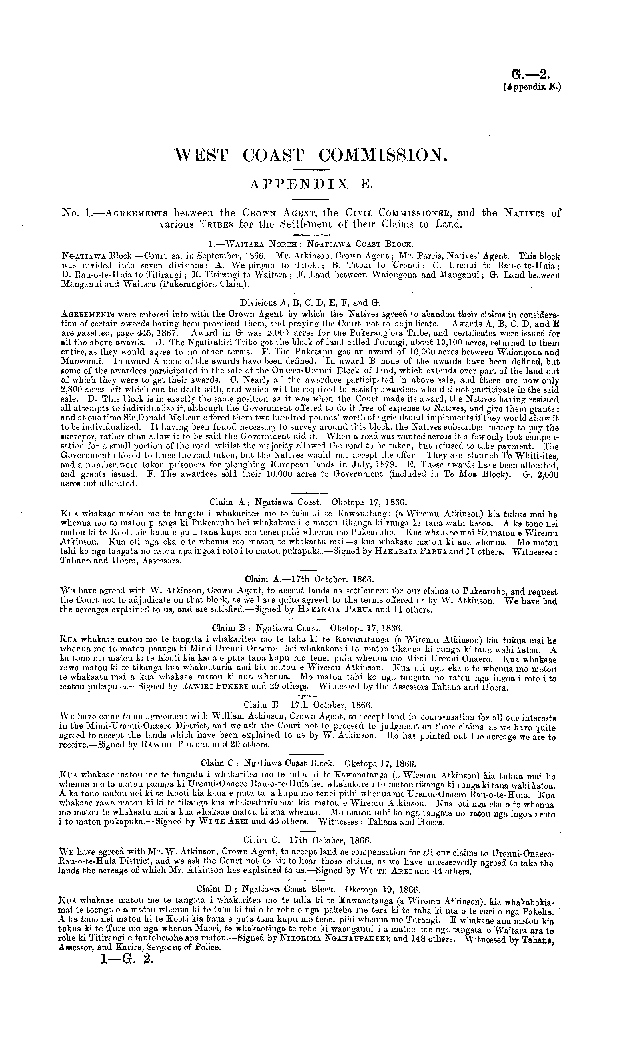 Claim D ; Ngatiawa Coast Block. Oketopa 19, 1866. KfA whakaae matou me te tangata i whakaritea mo te taha ki te Kawanatanga (a Wiremu Atkinson), kia whakahokiamai te toenga o a matou whenua ki te taha ki tai o to rohe o nga pakeha me tera ki te taha ki uta o te ruri o ntra Pakeha. Aka tono nei matou ki te Kooti kia kaua e puta tana kupu mo tenei pihi whenua mo Turangi. E whakaae ana matou kia tukua ki te Ture mo nga whenua Maori, te whakaotinga te rohe ki waenganui i a matou me nga tangata o Waitara ara te rohe ki Titirangi e tautohetohe ana matou. —Signed bj Nikobijia Ngahaupakeke and 148 others. Witnessed by Tahana Assessor, and Karira, Sergeant of Police. I— G. 2.