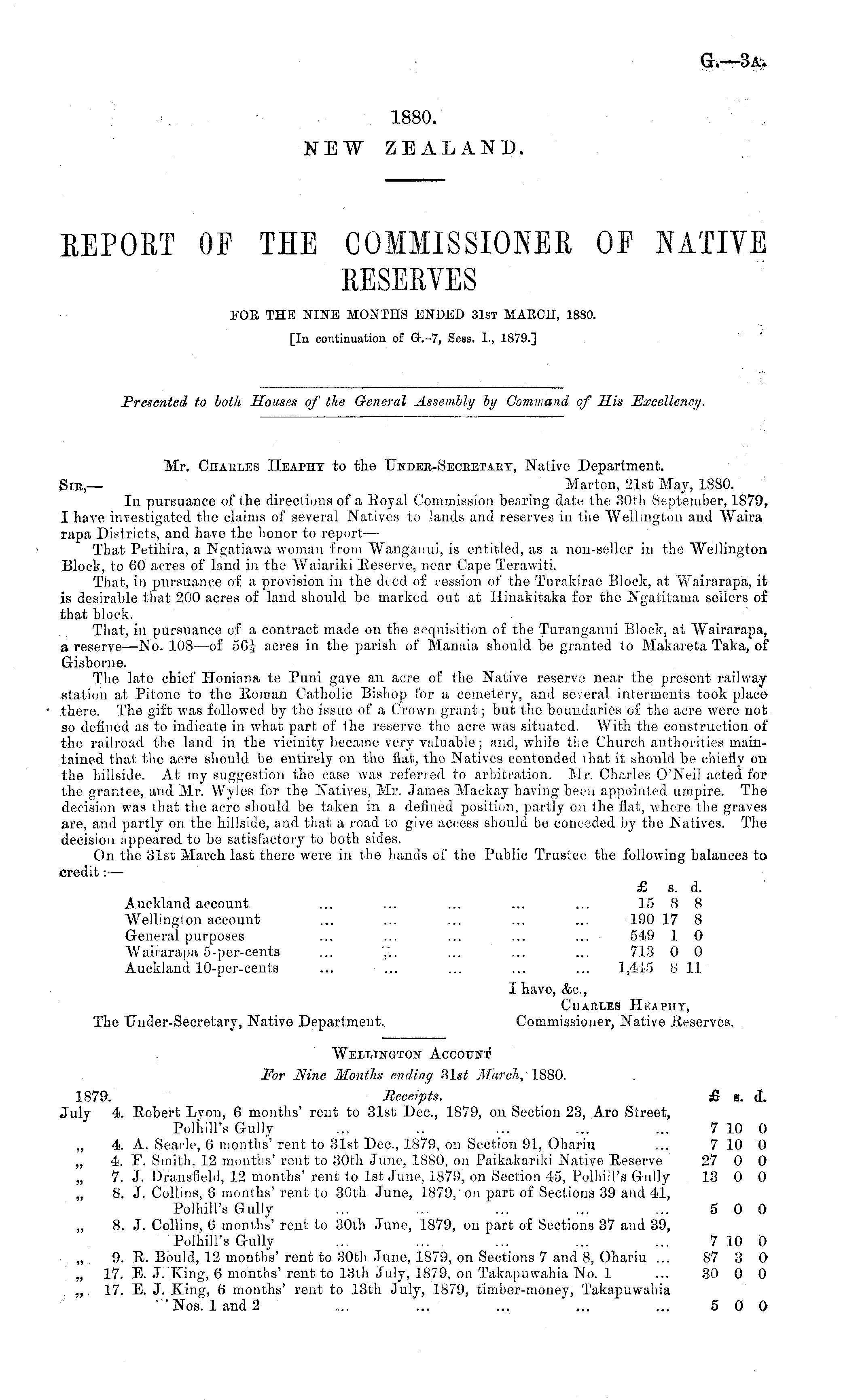 Mr. Chables Heaphy to the Under-Seceetaey, Native Department. Sic,— Marlon, 21st May, 1880. In pursuance of the directions of a Eoyal Commission bearing date the 30th September, 1879, I have investigated the claims of several Natives to lands and reserves in the Wellington and Waira rapa Districts, and have the honor to report —■ That Petihira, a Ngatiawa woman from Wanganui, is entitled, as a non-seller in the Wellington Block, to 60 acres of land in the Waiariki Beserve, near Cape Terawiti. That, in pursuance of a provision in the deed of cession of the Turakirae Block, at Wairarapa, it is desirable that 200 acres of land should bo marked out at Ilinakitaka for the Ngatitama sellers of that block. That, in pursuance of a contract made on the acquisition of the Turanganui Block, at Wairarapa, a reserve —No. 108 —of 50^ acres in the parish of Manaia should be granted to Makareta Taka, of Gisborne. The late chief Honiana te Puni gave an acre of the Native reserve near the present railway station at Pitone to the Roman Catholic Bishop for a cemetery, and several interments took place there. The gift was followed by the issue of a Crown grant; but the boundaries of the acre were not so defined as to indicate in what part of the resei've the acre was situated. With the construction of the railroad the land in the vicinity became very valuable; and, while the Church authorities maintained that the acre should be entirely on the flat, the Natives contended that it should be chiefly on the hillside. At my suggestion the case was referred to arbitration. Mr. Charles O'Neil acted for the grantee, and Mr. Wyles for the Natives, Mr. James Mackay having been appointed umpire. The decision was that the acre should be taken in a defined position, partly on the flat, where the graves are, and partly on the hillside, and that a road to give access should be conceded by the Natives. The decision appeared to be satisfactory to both sides. On the 31st March last there were in the hands of the Public Trustee the following balances to