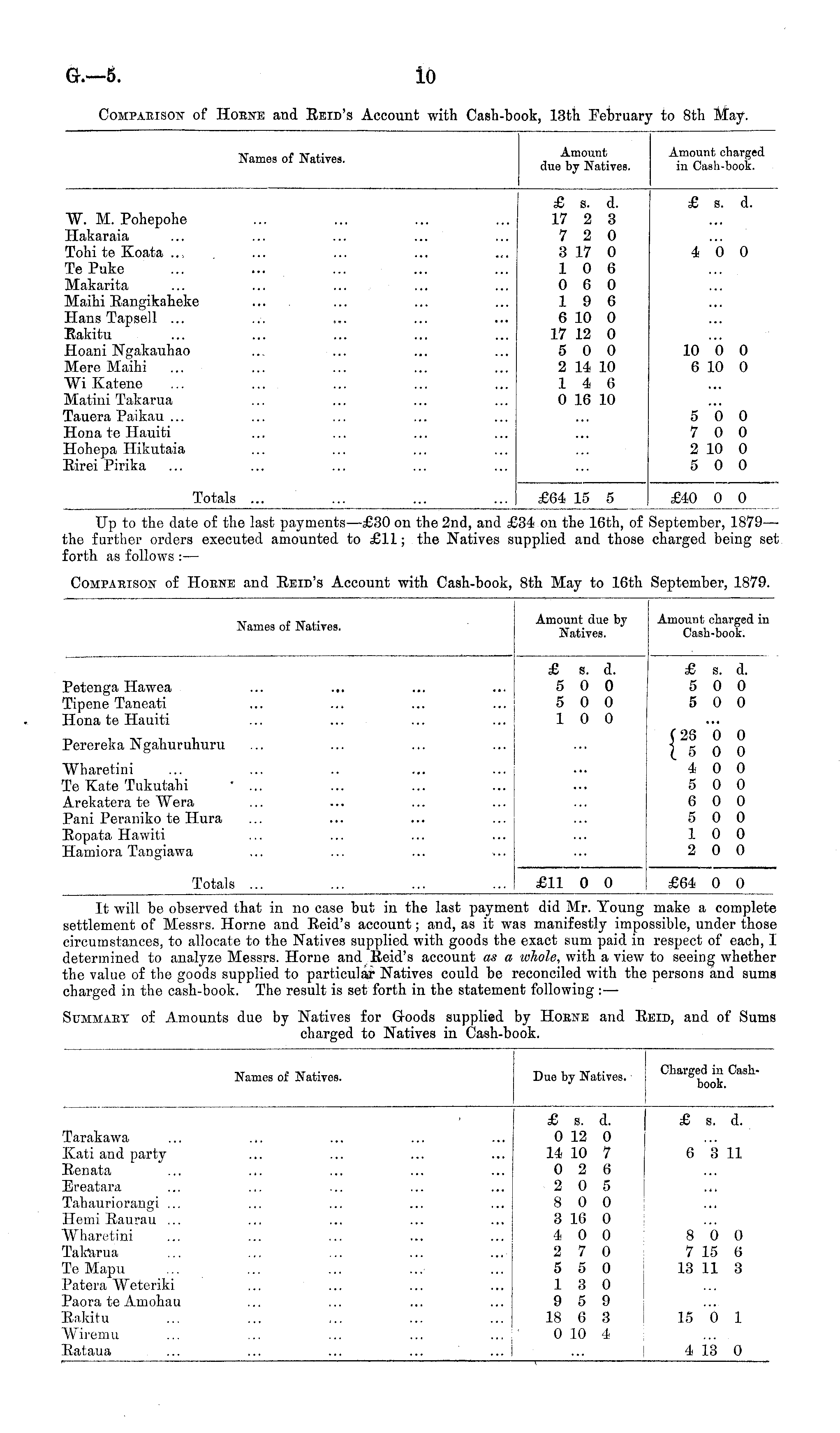 It will be observed that in no case but in the last payment did Mr. Young make a complete settlement of Messrs. Home and Reid's account; and, as it was manifestly impossible, under those circumstances, to allocate to the Natives supplied with goods the exact sum paid in respect of each, I determined to analyze Messrs. Home and Reid's account as a whole, with a view to seeing whether the value of the goods supplied to particular Natives could be reconciled with the persons and sums charged in the cash-book. The result is set forth in the statement following : —