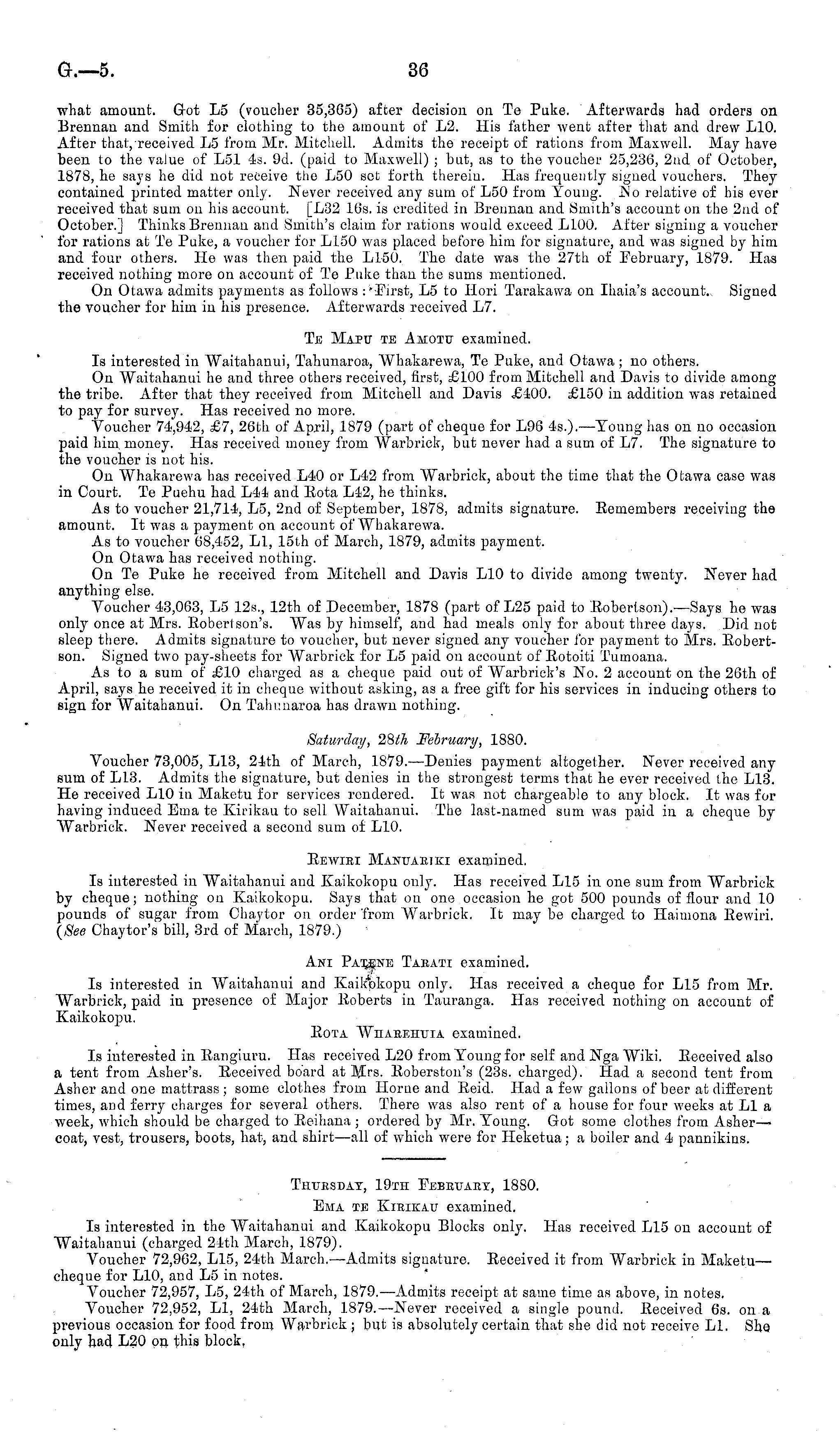 what amount. Got L 5 (voucher 35,365) after decision on Te Puke. Afterwards had orders on Brennan and Smith for clothing to the amount of L 2. His father went after that and drew LlO. After that, received L 5 from Mr. Mitchell. Admits the receipt of rations from Maxwell. May have been to the value of LSI 4s. 9d. (paid to Maxwell) ; but, as to the voucher 25,236, 2nd of October, 1878, he says he did not receive the LSO sot forth therein. Has frequently signed vouchers. They contained printed matter only. Never received any sum of LSO from Young. JNo relative of his ever received that sum on his account. [LB2 16s. is credited in Bretmau and Smith's account on the 2nd of October.] Thinks Brennan and Smith's claim for rations would exceed LIOO. After signing a voucher for rations at Te Puke, a voucher for LISO was placed before him for signature, and was signed by him and four others. He was then paid the Ll5O. The date was the 27th of February, 1879. Has received nothing more on account of Te Puke than the sums mentioned. On Otawa admits payments as follows : First, L 5 to Hori Tarakawa on Ihaia's account. Signed the voucher for him in his presence. Afterwards received L 7. Te Mapu te Amotu examined. Is interested in Waitahanui, Tahunaroa, Whakarewa, Te Puke, and Otawa; no others. On Waitahanui he and three others received, first, £100 from Mitchell and Davis to divide among the tribe. After that they received from Mitchell and Davis £400. £150 in addition was retained to pay for survey. Has received no more. Voucher 74,942, £7, 26th of April, 1879 (part of cheque for L 96 45.). —Young has on no occasion paid him money. Has received money from Warbriek, but never had a sum of L 7. The signature to the voucher is not his. On Whakarewa has received L4O or L 42 from Warbriek, about the time that the Otawa case was in Court. Te Puehu had L 44 and Rota L 42, he thinks. As to voucher 21,714, L 5, 2nd of September, 1878, admits signature. Remembers receiving the amount. It was a payment on account of Whakarewa. As to voucher 68,452, LI, 15th of March, 1879, admits payment. On Otawa has received nothing. On Te Puke he received from Mitchell and Davis LlO to divide among twenty. Never had anything else. Voucher 43,063, L 5 125., 12th of December, 1878 (part of L 25 paid to Robertson).—Says he waa only once at Mrs. Eoberi son's. Was by himself, and had meals only for about three days. Did not sleep there. Admits signature to voucher, but never signed any voucher for payment to Mrs. Robertson. Signed two pay-sheets for Warbriek for L 5 paid on account of Rotoiti Tumoana. As to a sum of £10 charged as a cheque paid out of Warbrick's No. 2 account on the 26th of April, says he received it in cheque without asking, as a free gift for his services in inducing others to sign for Waitahanui. On Tahunaroa has drawn nothing. Saturday, 28th February, 1880. Voucher 73,005, Ll3, 24th of March, 1879.—Denies payment altogether. Never received any sum of Ll3. Admits the signature, but denies in the strongest terms that he ever received the Ll3. He received LlO in Maketu for services rendered. It was not chargeable to any block. It was for having induced Etna te Kirikau to sell Waitahanui. The last-named sum was paid in a cheque by Warbriek. Never received a second sum of LlO. Rewiki Manttajmkt examined. Is interested in Waitahanui and Kaikokopu only. Has received Lls in one sum from Warbriek by cheque; nothing on Kaikokopu. Says that on one occasion he got 500 pounds of flour and 10 pounds of sugar from Chaytor on order 'from Warbriek. It may be charged to Haimona Rewiri. (See Chaytor's bill, 3rd of March, 1879.) Ani Paxjene Taeati examined. Is interested in Waitahanui and Kaikokopu only. Has received a cheque for Lls from Mr. Warbriek, paid in presence of Major Roberts in Tauranga. Has received nothing on account of Kaikokopu. Rota WiiAiticiruiA examined. Is interested in Rangiuru. Has received L2O from Young for self and Nga Wiki. Received also a tent from Asher's. Received board at Mrs. Roberston's (235. charged). Had a second tent from Asher and one mattrass ; some clothes from Home and Reid. Had a few gallons of beer at different times, and ferry charges for several others. There was also rent of a house for four weeks at LI a week, which should be charged to Reihana ; ordered by Mr. Young. Got some clothes from Asher— coat, vest, trousers, boots, hat, and shirt—all of which were for Heketua; a boiler and 4 pannikins.