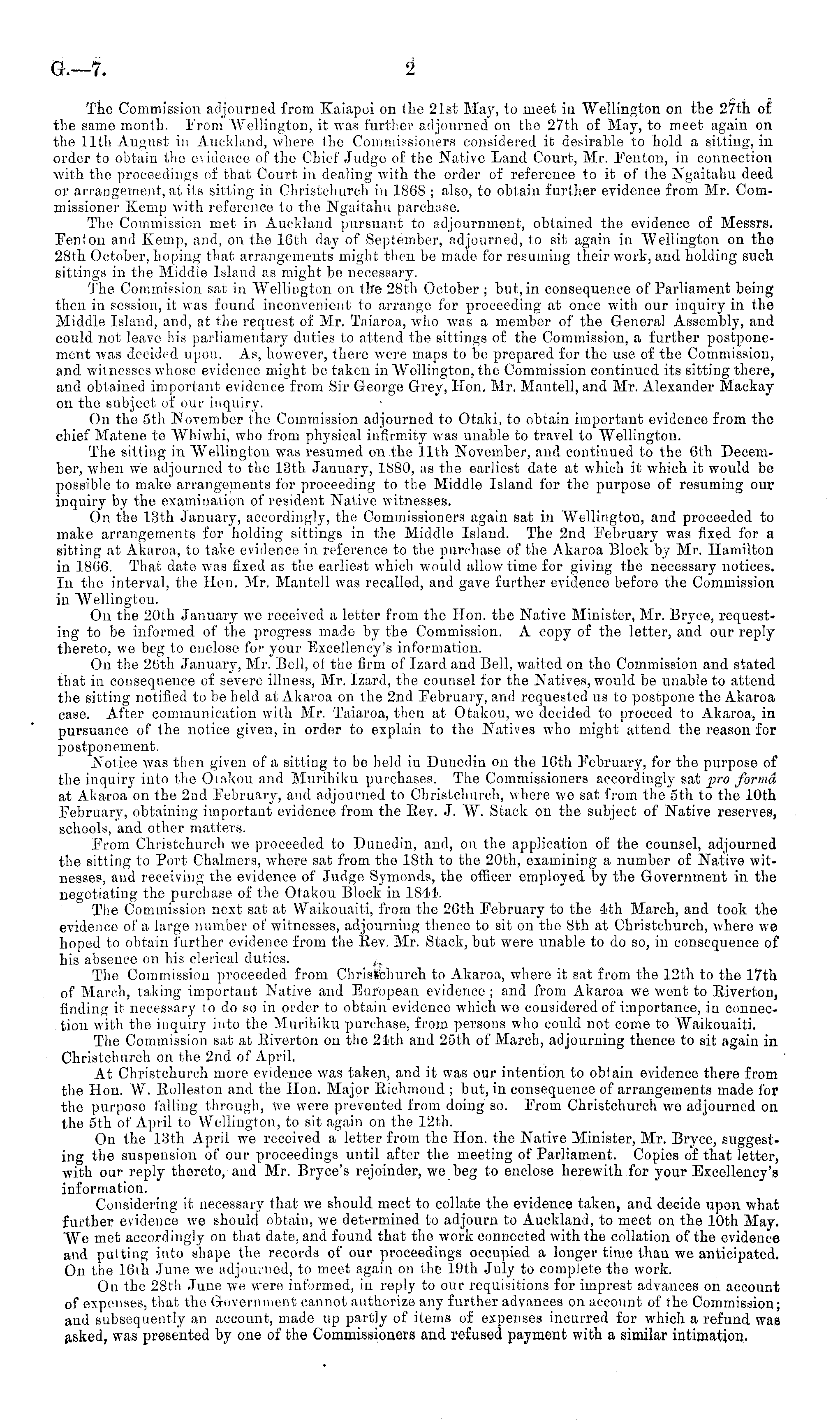 The Commission adjourned from Kaiapoi on the 21st May, to meet iv "Wellington on the 27th of the same month. From Wellington, it was further adjourned on the 27th of May, to meet again on the 11th August in Auckland, where the Commissioners considered it desirable to hold a sitting, in order to obtain the evidence of the Chief Judge of the Native Land Court, Mr. Fenton, in connection with the proceedings of that Court in dealing with the order of reference to it of ihe Ngaitahu deed or arrangement, at its sitting in Christchurch in 1868 ; also, to obtain further evidence from Mr. Commissioner Kemp with reference to the Ngaitahu parchase. The Commission met in Auckland pursuant to adjournment, obtained the evidence of Messrs. Fenton and Kemp, and, on the 16th day of September, adjourned, to sit again in "Wellington on the 28th October, hoping that arrangements might then be made for resuming their work, and holding such sittings in the Middle Island as might be necessary. The Commission sat in "Wellington on the 28th October ; but, in consequence of Parliament being then in session, it was found inconvenient to arrange for proceeding at once with our inquiry in the Middle Island, and, at the request of Mr. Taiaroa, who was a member of the General Assembly, and could not leave his parliamentary duties to attend the sittings of the Commission, a further postponement was decided upon. As, however, there were maps to be prepared for the use of the Commission, and witnesses whose evidence might be taken in Wellington, the Commission continued its sitting there, and obtained important evidence from Sir George Grey, Hon. Mr. Mautell,and Mr. Alexander Mackay on the subject of our inquiry. On the sth November the Commission adjourned to Otaki, to obtain important evidence from the chief Matene to Whiwhi, who from physical infirmity was unable to travel to Wellington. The sitting in Wellington was resumed on the 11th November, and continued to the 6th December, when we adjourned to the 13th January, 1880, as the earliest date at which it which it would be possible to make arrangements for proceeding to the Middle Island for the purpose of resuming our inquiry by the examination of resident Native witnesses. On the 13th January, accordingly, the Commissioners again sat in Wellington, and proceeded to make arrangements for holding sittings in the Middle Island. The 2nd February was fixed for a sitting at Akaron, to take evidence in reference to the purchase of the Akaroa Block by Mr. Hamilton in 1866. That date was fixed as the earliest which would allow time for giving the necessary notices. In the interval, the Hon. Mr. Mantell was recalled, and gave further evidence before the Commission in Wellington. On the 20th January we received a letter from the Hon. the Native Minister, Mr. Bryce, requesting to be informed of the progress made by the Commission. A copy of the letter, and our reply thereto, we beg to enclose for your Excellency's information. On the 2(ith January, Mr. Bell, of the firm of Izard and Bell, waited on the Commission and stated that in consequence of severe illness, Mr. Izard, the counsel for the Natives, would be unable to attend the sitting notified to be held at Akaroa on the 2nd February, and requested us to postpone the Akaroa case. After communication with Mr. Taiaroa, then at Otakou, we decided to proceed to Akaroa, in pursuance of the notice given, in order to explain to the Natives who might attend the reason for postponement, Notice was then given of a sitting to be held in Dunedin on the 16th February, for the purpose of the inquiry into the Oiakou and Murihiku purchases. The Commissioners accordingly sat pro forma at Akaroa on the 2nd February, and adjourned to Christchurch, where wre sat from the sth to the 10th February, obtaining important evidence from the Rev. J. W. Stack on the subject of Native reserves, schools, and other matters. From Christchurch we proceeded to Dunedin, and, on the application of the counsel, adjourned the sitting to Port Chalmers, where sat from the 18th to the 20th, examining a number of Native witnesses, and receiving the evidence of Judge Symonds, the officer employed by the Government in the negotiating the purchase of the Otakou Block in 1844. The Commission next sat at Waikouaiti, from the 26th February to the 4th March, and took the evidence of a large number of witnesses, adjourning thence to sit on the Bth at Christchurch, where we hoped to obtain further evidence from the Rev, Mr. Stack, but were unable to do so, in consequence of his absence on his clerical duties. The Commission proceeded from Christchurch to Akaroa, where it sat from the 12th to the 17th of March, taking important Native and European evidence ; and from Akaroa we went to Riverton, finding it necessary to do so in order to obtain evidence which we considered of importance, in connection with the inquiry into the Murihiku purchase, from persons who could not come to Waikouaiti. The Commission sat at Riverton on the 21th and 25th of March, adjourning thence to sit again in Christchurch on the 2nd of April. At Christchurch more evidence was taken, and it was our intention to obtain evidence there from the Hon. W. Eolleston and the Hon. Major Richmond ; but, in consequence of arrangements made for the purpose falling through, we were prevented from doing so. From Christchurch we adjourned on the st:h of April to Wellington, to sit again on the 12th. On the 13th April wo received a letter from the Hon. the Native Minister, Mr. Bryce, suggesting the suspension of our proceedings until after the meeting of Parliament. Copies of that letter, with our reply thereto, and Mr. Bryce's rejoinder, we beg to enclose herewith for your Excellency's information. Considering it necessary that we should meet to collate the evidence taken, and decide upon what further evidence we should obtain, w re determined to adjourn to Auckland, to meet on the 10th May. We met accordingly on t
