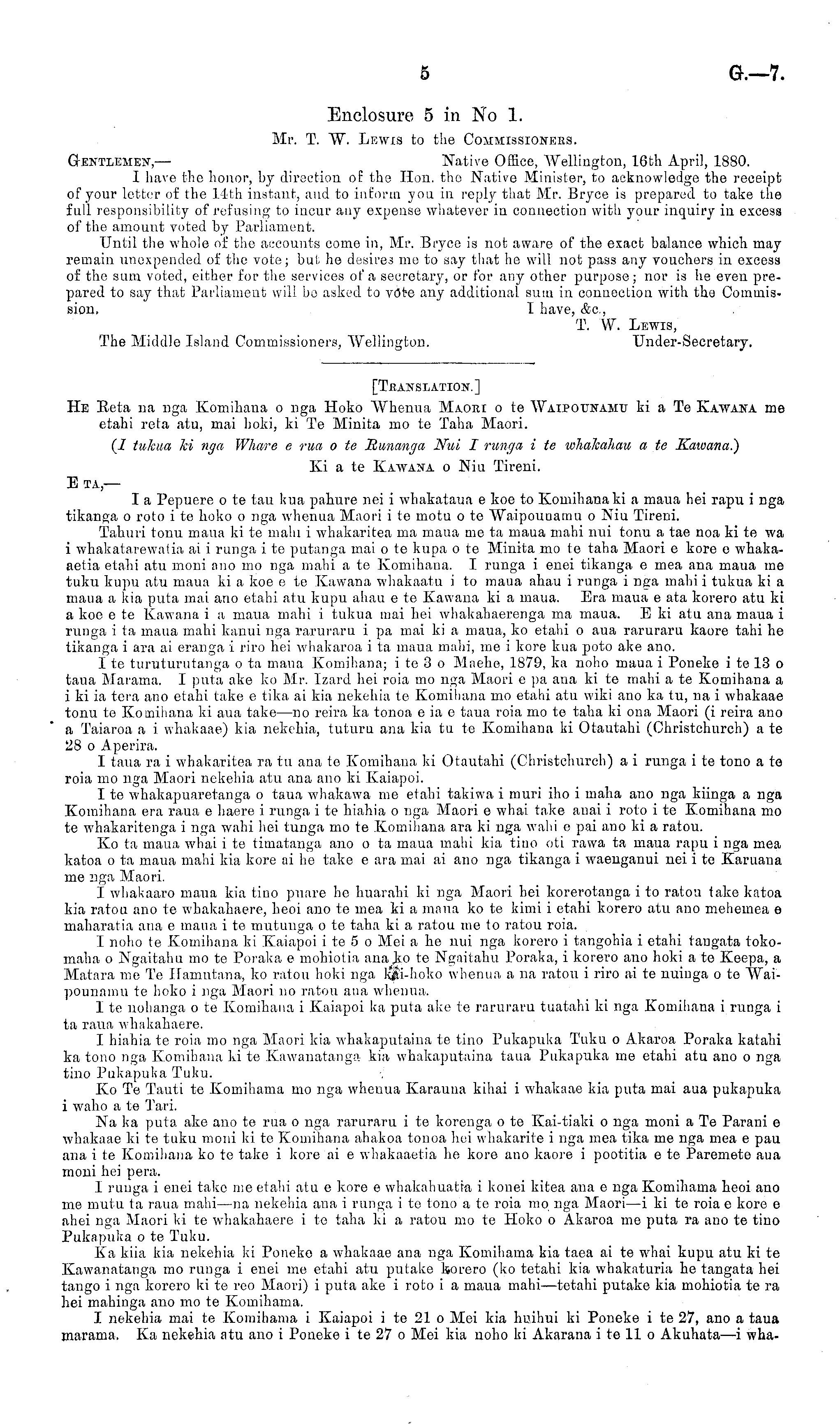 Enclosure 5 in No 1. Mr. T. W. Lewis to the Commissioners. Gentlemen,— Native Office, Wellington, 16th April, 1880. I have the honor, hy direction oE the Hon. the Native Minister, to acknowledge the receipt of your letter of the 14th instant, and to inform you in reply that Mr. Bryce is prepared to take the full responsibility of refusing to incur any expense whatever in connection with your inquiry in excess of the amount voted by Parliament. Until the whole of the accounts come in, Mr. Bryco is not aware of the exact balance which may remain unexpended of the vote; but he desires me to say that he will not pass any vouchers in excess of the sum voted, either for the services of a secretary, or for any other purpose ; nor is he even prepared to say that Parliament will bo asked to v(ste any additional sum in connection with the Commission, T. have, &c, T. W. Lewis, The Middle Island Commissioners, Wellington. Under-Secretary.