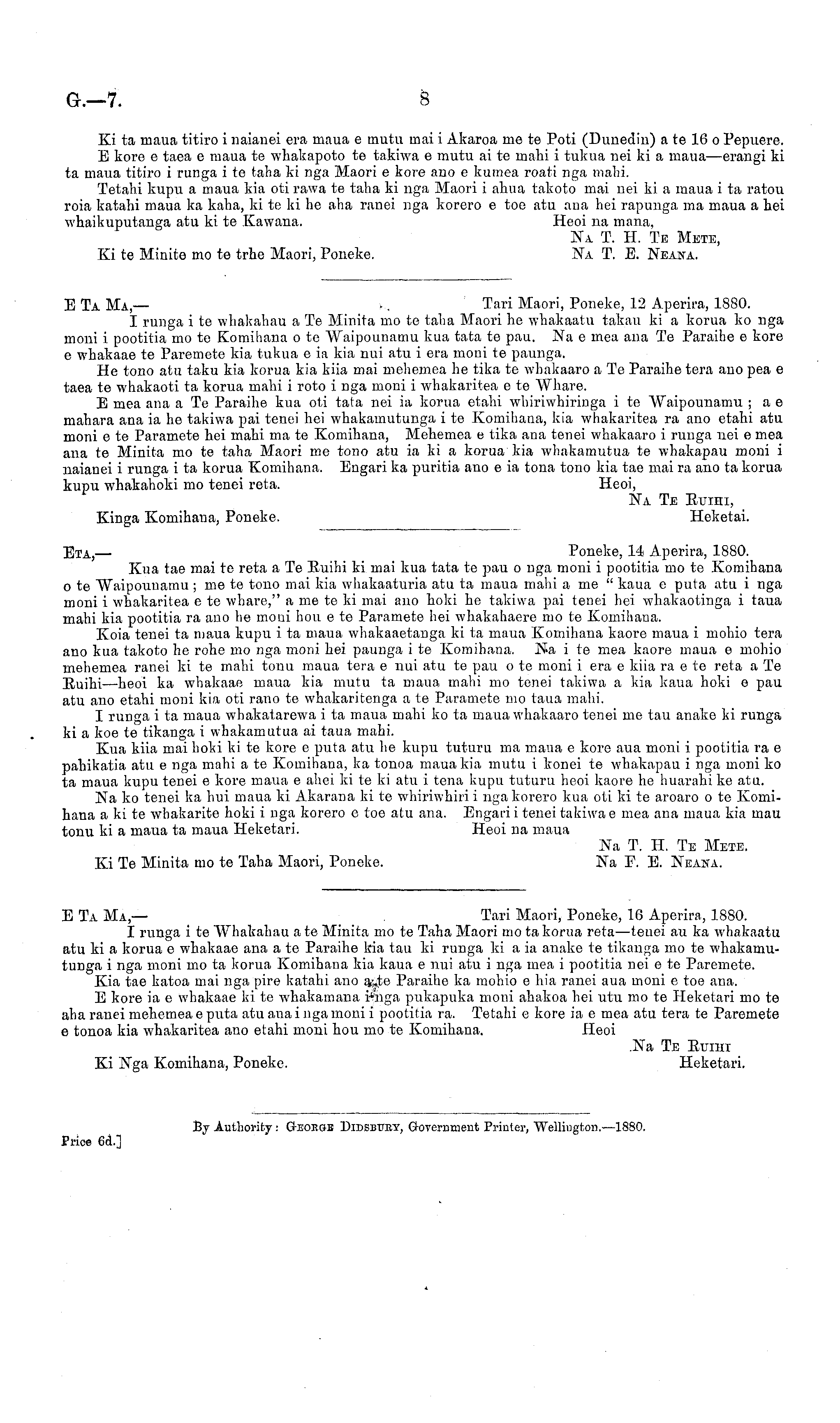Xi ta maua titiro i naianei era maua c mutu mai i Akaroa me te Poti (Dunedin) a te 16 o Pepuere. E kore c taea c maua te whakapoto te takiwa c mutu ai te mahi i tukua nei ki a maua —erangi ki ta maua titiro i runga i to taha ki nga Maori c kore ano c kumea roati nga mahi. Tetahi kupu a maua kia oti rawa te taha ki nga Maori i ahua takoto mai nei ki a maua i ta ratou roia katahi maua ka kaha, kite ki he aha ranei nga korero c toe atu ana hei rapunga ma maua a hei whaikuputanga atu kite Kawana. Heoi na maua, Na T. H. Te Mete, Xi te Minite mo te trhe Maori, Poneke. Na T. E. Neana.