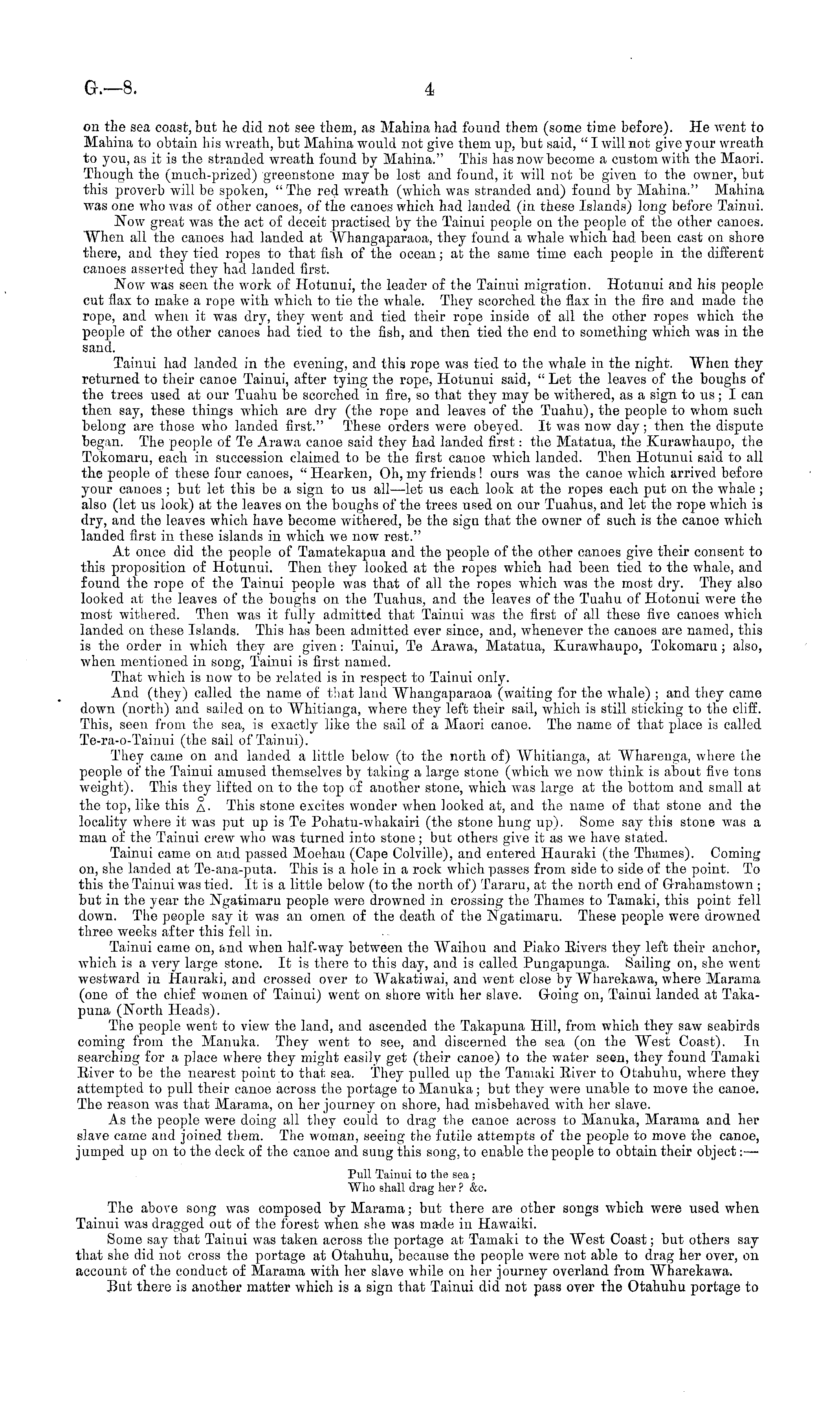 on the sea coast, but lie did not see them, as Mahina had found them (some time before). He went to Mahina to obtain his wreath, but Mahina would not give them up, but said, " I will not give your wreath to you, as it is the stranded wreath found by Mahina." This has now become a custom with the Maori. Though the (much-prized) greenstone may be lost and found, it will not be given to the owner, but this proverb will be spoken, "The red wreath (which was stranded and) found by Mahina." Mahina was one who was of other canoes, of the canoes which had landed (in these Islands) long before Tainui. Now great was the act of deceit practised by the Tainui people on the people of the other canoes. When all the canoes had landed at Whangaparaoa, they found a whale which had been cast on shore there, and they tied ropes to that fish of the ocean; at the same time each people in the different canoes asserted they had landed first. Now was seen the work of Hotunui, the leader of the Tainui migration. Hotunui and his people cut flax to make a rope with which to tie the whale. They scorched the flax in the fire and made the rope, and when it was dry, they went and tied their rope inside of all the other ropes which the people of the other canoes had tied to the fish, and then tied the end to something which was in the sand. Tainui had landed in the evening, and this rope was tied to the whale in the night. When they returned to their canoe Tainui, after tying the rope, Hotunui said, " Let the leaves of the boughs of the trees used at our Tuahu be scorched in fire, so that they may be withered, as a sign to us; I can then say, these things which are dry (the rope and leaves of the Tuahu), the people to whom such belong are those who landed first." These orders were obeyed. It was now day; then the dispute began. The people of Te Arawa canoe said they had landed first: the Matatua, the Kurawhaupo, the Tokomaru, each in succession claimed to be the first canoe which landed. Then Hotunui said to all the people of these four canoes, " Hearken, Oh, my friends ! ours was the canoe which arrived before your canoes ; but let this be a sign to us all —let us each look at the ropes each put on the whale ; also (let us look) at the leaves on the boughs of the trees used on our Tuahus, and let the rope which is dry, and the leaves which have become withered, be the sign that the owner of such is the canoe which landed first in these islands in which we now rest." At once did the people of Tamatekapua and the people of the other canoes give their consent to this proposition of Hotunui. Then they looked at the ropes which had been tied to the whale, and found the rope of the Tainui people was that of all the ropes which was the most dry. They also looked at the leaves of the boughs on the Tuahus, and the leaves of the Tuahu of Hotonui were the most withered. Then was it fully admitted that Tainui was the first of all these five canoes which landed on these Islands. This has been admitted ever since, and, whenever the canoes are named, this is the order in which they are given: Tainui, Te Arawa, Matatua, Kurawhaupo, Tokomaru ; also, when mentioned in song, Tainui is first named. That which is now to be related is in respect to Tainui only. And (they) called the name of that land Whangaparaoa (waiting for the whale) ; and they came down (north) and sailed on to Whitianga, where they left their sail, which is still sticking to the cliff. This, seen from the sea, is exactly like the sail of a Maori canoe. The name of that place is called Te-ra-o-Tainui (the sail of Tainui). They came on and landed a little below (to the north of) Whitianga, at Wharenga, where the people of the Tainui amused themselves by taking a large stone (which we now think is about five tons weight). This they lifted on to the top of another stone, which was large at the bottom and small at the top, like this a- This stone excites wonder when looked at, and the name of that stone and the locality where it was put up is Te Pohatu-whakairi (the stone hung up). Some say this stone was a man of the Tainui crew who was turned into stone; but others give it as we have stated. Tainui came on and passed Moehau (Cape Colville), and entered Hauraki (the Thames). Coming on, she landed at Te-ana-puta. This is a hole in a rock which passes from side to side of the point. To this the Tainui was tied. It is a little below (to the north of) Tararu, at the north end of G-rahamstown ; but in the year the Ngatimaru people were drowned in crossing the Thames to Tamaki, this point fell down. The people say it was an omen of the death of the Ngatimaru. These people were drowned three weeks after this fell in. Tainui came on, and when half-way between the Waihou and Piako Rivers they left their anchor, which is a very large stone. It is there to this day, and is called Pungapunga. Sailing on, she went westward in Hauraki, and crossed over to Wakatiwai, and went close by Wharekawa, where Marama (one of the chief women of Tainui) went on shore with her slave. Groing on, Tainui landed at Takapuna (North Heads). The people went to view the land, and ascended the Takapuna Hill, from which they saw seabirds coming from the Manuka. They went to see, and discerned the sea (on the West Coast). In searching for a place where they might easily get (their canoe) to the water seen, they found Tamaki River to be the nearest point to that sea. They pulled up the Tamaki River to Otahuhu, where they attempted to pull their canoe across the portage to Manuka; but they were unable to move the canoe. The reason was that Marama, on her journey on shore, had misbehaved with her slave. As the people were doing all they could to drag the canoe across to Manuka, Marama and her slave came and joined them. The woman, seeing the futile attempts of the people to move the canoe, jumped up on to the deck of the canoe and sung this song, to enable the people to obtain their object:— Pull Tainui to t