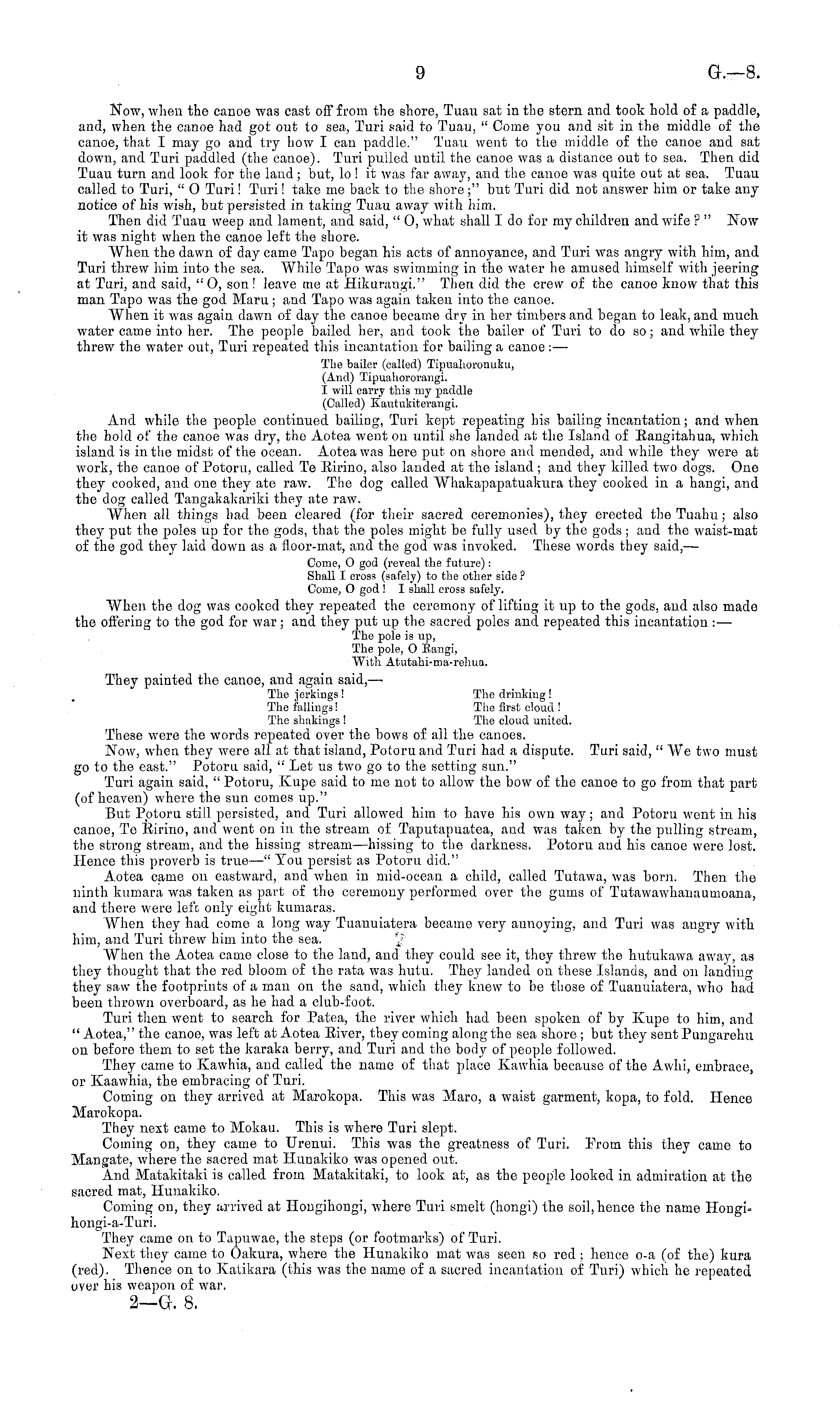 Now, when the canoe was cast off from the shore, Tuau sat in the stern and took hold of a paddle, and, when the canoe had got out to sea, Turi said to Tuau, " Come you and sit in the middle of the canoe, that I may go and try how I can paddle." Tuau went to the middle of the canoe and sat down, and Turi paddled (the canoe). Turi pulled until the canoe was a distance out to sea. Then did Tuau turn and look for the land ; but, lo !it was far away, and the canoe was quite out at sea. Tuau called to Turi, " O Turi! Turi! take me back to the shore;" but Turi did not answer him or take any notice of his wish, but persisted in taking Tuau away with him. Then did Tuau weep and lament, and said, "0, what shall Ido for my children and wife ? " Now it was night when the canoe left the shore. "When the dawn of day came Tapo began his acts of annoyance, and Turi was angry with him, and Turi threw him into the sea. While Tapo was swimming in the water he amused himself with jeering at Turi, and said, "0, son! leave me at Hikurangi." Then did the crew of the canoe know that this man Tapo was the god Maru; and Tapo was again taken into the canoe. "When it was again dawn of day the canoe became dry in her timbers and began to leak, and much water came into her. The people bailed her, and took the bailer of Turi to do so; and while they threw the water out, Turi repeated this incantation for bailing a canoe: — The bailer (called) Tipuahoronuku, (And) Tipuahororangi. I will carry this my paddle (Called) Kautukiterangi. And while the people continued bailing, Turi kept repeating his bailing incantation; and when the hold of the canoe was dry, the Aotea went on until she landed at the Island of Rangitahua, which island is in the midst of the oeean. Aotea was here put on shore and mended, and while they were at work, the canoe of Potoru, called Te Birmo, also landed at the island ; and they killed two dogs. One they cooked, and one they ate raw. The dog called Whakapapatuakura they cooked in a hangi, and the dog called Tangakakariki they ate raw, "When all things had been cleared (for their sacred ceremonies), they erected the Tuahu; also they put the poles up for the gods, that the poles might be fully used by the gods; and the waist-mat of the god they laid down as a floor-mat, and the god was invoked. These words they said, —■ Come, 0 god (reveal the future): Shall I cross (safely) to the other side ? Come, O god ! I shall cross safely. When the dog was cooked they repeated the ceremony of lifting it up to the gods, and also made the offering to the god for war; and they put up the sacred poles and repeated this incantation :— The pole is up, The pole, O Eangi, With Atutahi-ma-rehua. They painted the canoe, and again said, — The jerkings ! The drinking ! The tailings! The first cloud ! The shakings ! The cloud united. These were the words repeated over the bows of all the canoes. Now, when they were all at that island, Potoru and Turi had a dispute. Turi said, " "VVe two must go to the east." Potoru said, " Let us two go to the setting sun." Turi again said, " Potoru, Kupe said to mo not to allow the bow of the canoe to go from that part (of heaven) where the sun comes up." But Potoru still persisted, and Turi allowed him to have his own way; and Potoru went in his canoe, Te Eirino, and went on in the stream of Taputapuatea, and was taken by the pulling stream, the strong stream, and the hissing stream —hissing to the darkness. Potoru and his canoe were lost. Hence this proverb is true —" You persist as Potoru did." Aotea came on eastward, and when in mid-ocean a child, called Tutawa, was born. Then the ninth kumara was taken as part of the ceremony performed over the gums of Tutawawhanaumoana, and there were left only eight kumaras. When they had come a long way Tuanuiatera became very annoying, and Turi was angry with him, and Turi threw him into the sea. When the Aotea came close to the land, and they could see it, they threw the hutukawa away, as they thought that the red bloom of the rata was hutu. They landed on these Islands, and on landing they saw the footprints of a man on the sand, which they knew to be those of Tuanuiatera, who had been thrown overboard, as he had a club-foot. Turi then went to search for Patea, the river which had been spoken of by Kupe to him, and " Aotea," the canoe, was left at Aotea River, they coming along the sea shore ; but they sent Pungarehu on before them to set the karaka berry, and Turi and the body of people followed. They came to Kawhia, and called the name of that place Kawhia because of the Awhi, embrace, or Kaaw'hia, the embracing of Turi. Coming on they arrived at Marokopa. This was Maro, a waist garment, kopa, to fold. Hence Marokopa. They next came to Mokau. This is where Turi slept. Coming on, they came to Urenui. This was the greatness of Turi. From this they came to Mangate, where the sacred mat Hunakiko was opened out. And Matakitaki is called from Matakitaki, to look at, as the people looked in admiration at the sacred mat, Hunakiko. Coming on, they arrived at Hongihongi, w fhere Turi smelt (hongi) the soil, hence the name HoDgi-hongi-a-Turi. They came on to Tapuwae, the steps (or footmarks) of Turi. Next they came to Oakura, where the Hunakiko mat was seen so red; hence o-a (of the) kura (red). Thence on to Kalikara (this was the name of a sacred incantation of Turi) which he repeated over his weapon of war. 2— G. 8.